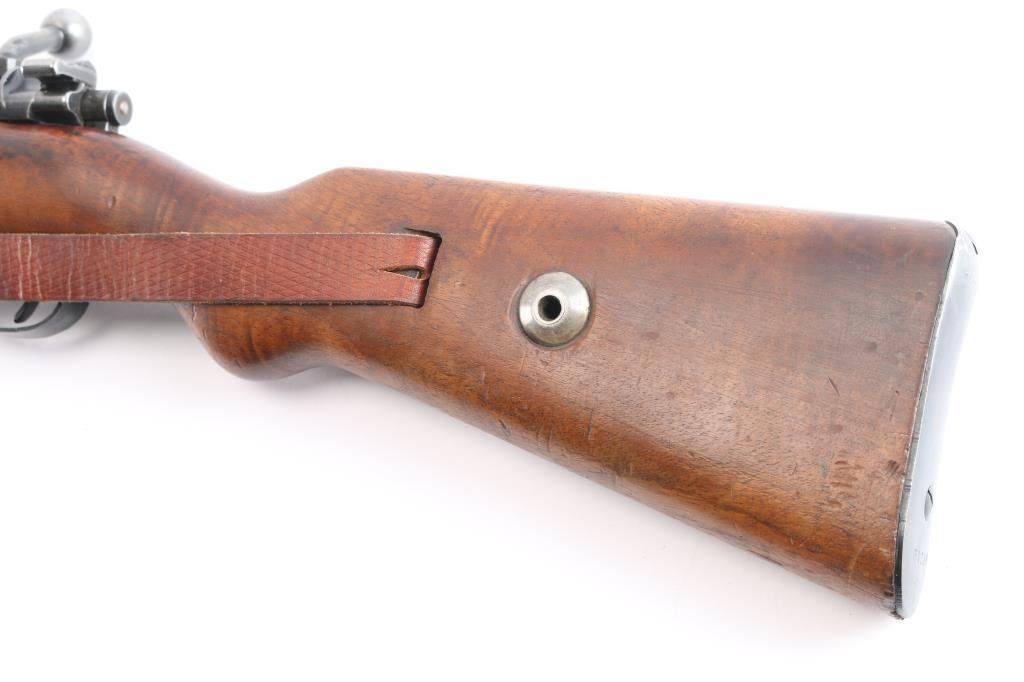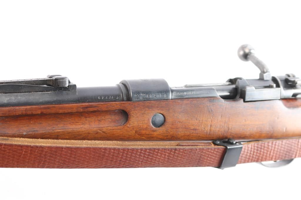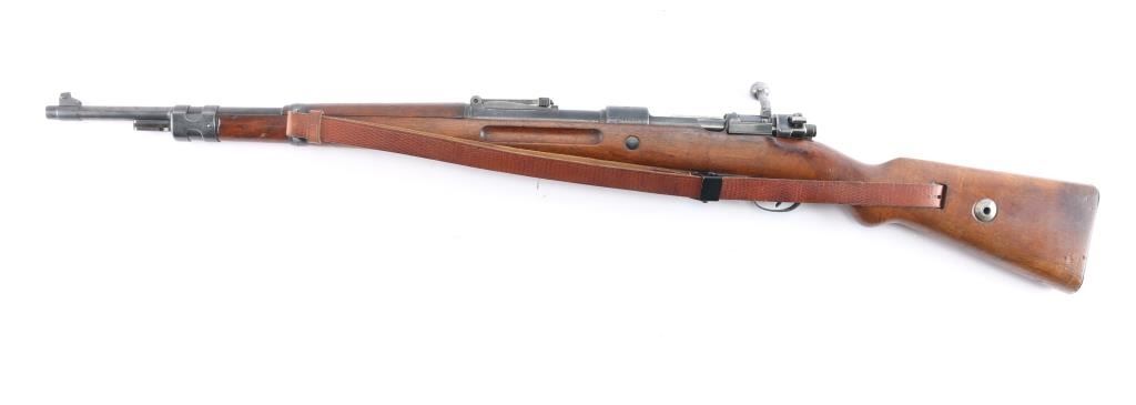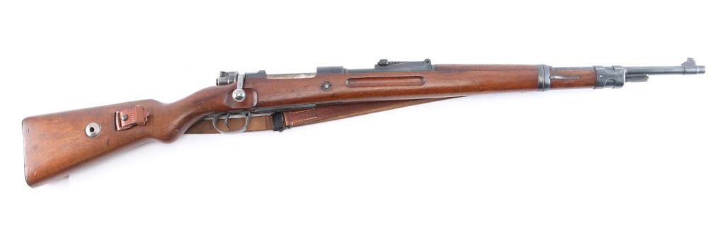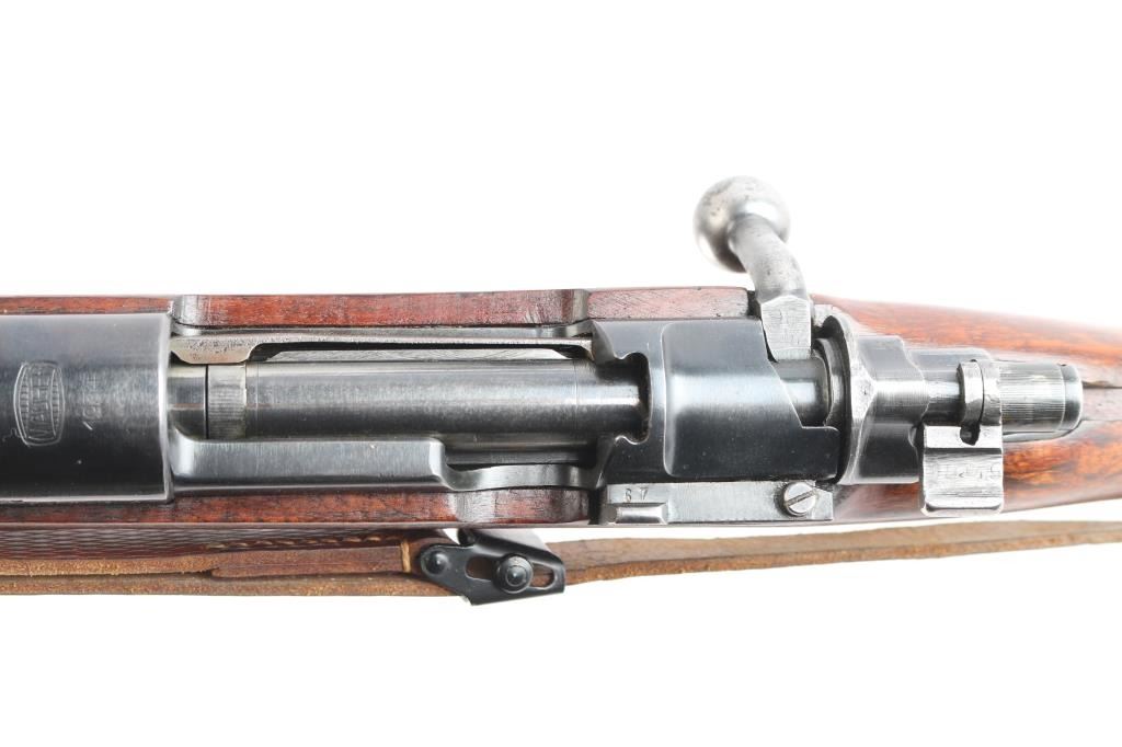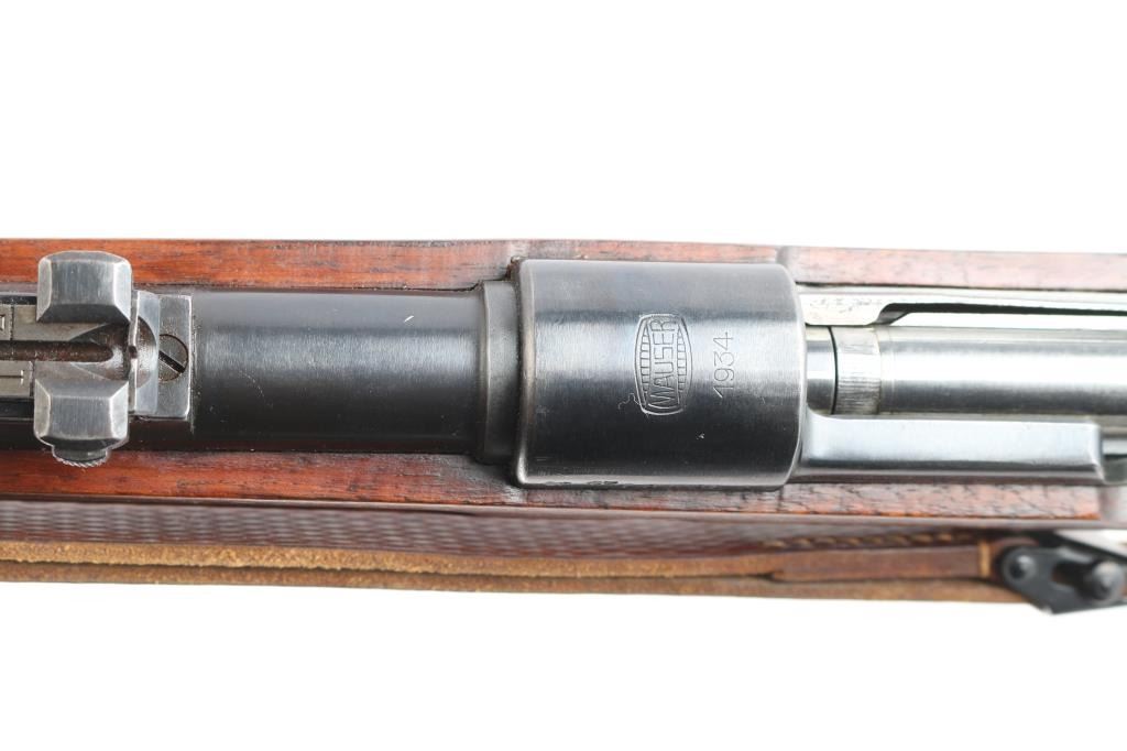 German made 'Banner' model, a bolt-action centerfire rifle chambered for 8mm Mauser, and manufactured circa 1934. Officially designed for export and German security guards, and it has no observed importer markings. These pre-war Mausers were often used by the S/A, and SS. Rifle features a blued refinish, a 23 1/2" barrel, early 'H' style front barrel band, checkered ramped inverted 'V' front sight, tangent rear sight graduated to 2000 meters, smooth curved trigger, turned down bolt handle, disassembly disc in stock, and no cleaning rod. The hardwood furniture consists of a semi-pistol grip shoulder stock with a sling slot cutout, smooth metal butt plate, and a smooth finger grooved forend. Receiver ring is stamped with the Mauser banner, the manufacture date, and Crown proofs. Left receiver rail stamped "MAUSER-WERKE A-G OBERNDORF aN." Markings are fairly sharp with some slight swamping from buffing during refinishing. Barrel, and bottom metal numbers match the receiver. Bolt mismatched, and electro pencil marked with '2496.' Rifle retains approximately 96% of its blued refinish showing light scattered scratches, thinning around the receiver, and edge wear. Metal displays no rust, or deformation. Bore is good with strong rifling, and shows light frosting. The action is smooth and crisp. The wood furniture very good with light scattered handling marks. Rifle includes checkered brown leather sling.