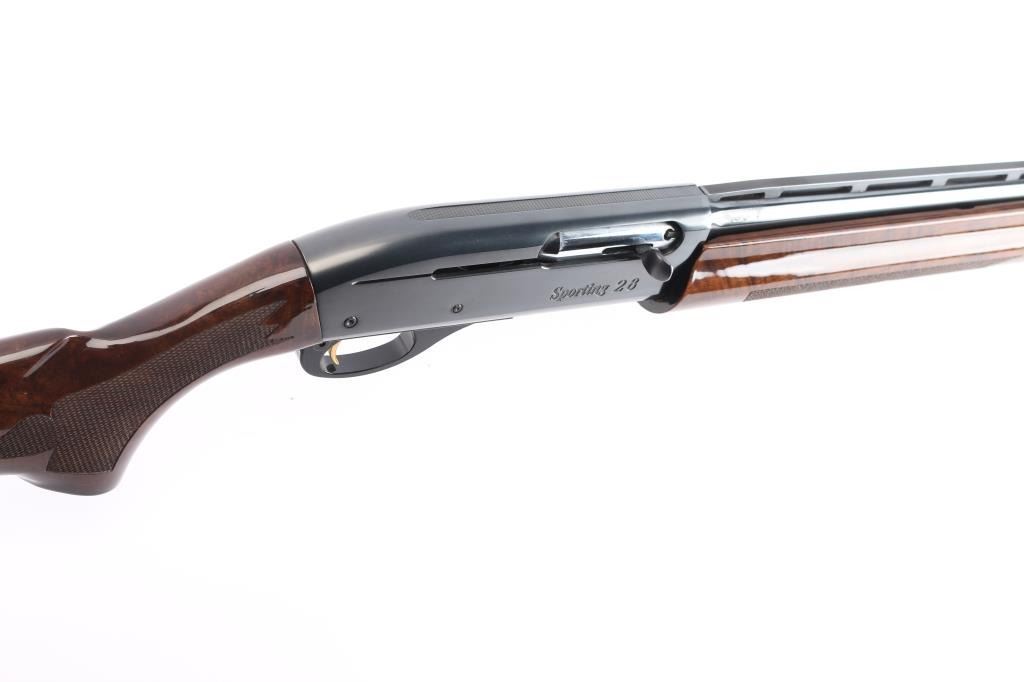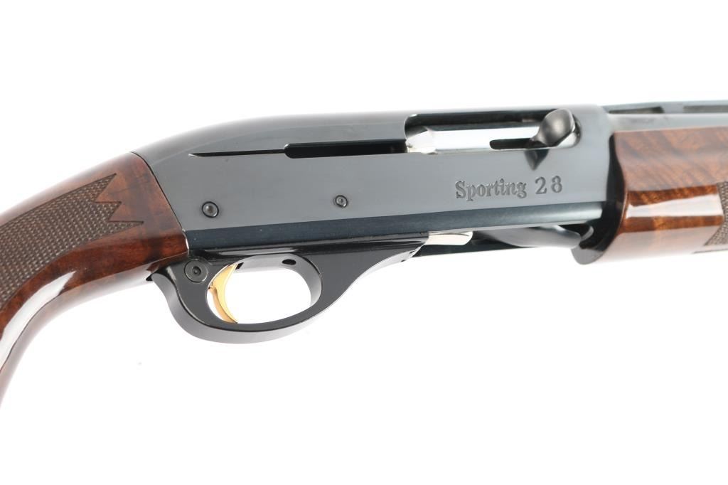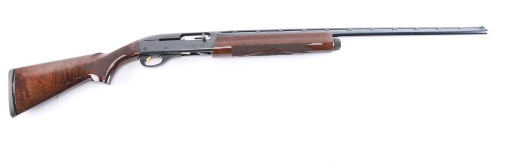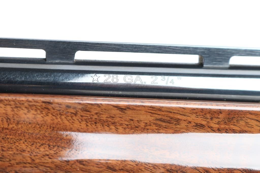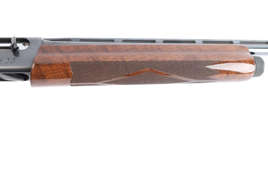 Gas-operated American made semi-auto shotgun chambered for 2 3/4" 28 gauge shells, manufactured circa 1997 ('RZ' date code) in Ilion, NY. It features a high gloss blued finish, a 27" vent rib barrel, extended Light Mod choke tube installed, serrated charging handle, green fiber optic front sight, mid-bead hole drilled and tapped, and smooth curved gold-toned trigger. The high-gloss fancy figured walnut furniture consists of a semi-pistol grip shoulder stock with checkering at the wrist, grooved checkered forend, 14" length-of-pull, 1-5/8" drop at comb, 2-15/16" drop at heel, black tear-drop style grip cap with gold-colored Remington insignia, and black solid rubber Decelerator recoil pad. Bore is bright and shiny, and the action is smooth and crisp. The original blued finish retained is approximately 99% with little remarkable to speak of. Furniture wood is excellent with minor scattered light scratches and blemishes on the buttstock. The metal shows no rust or deformation.