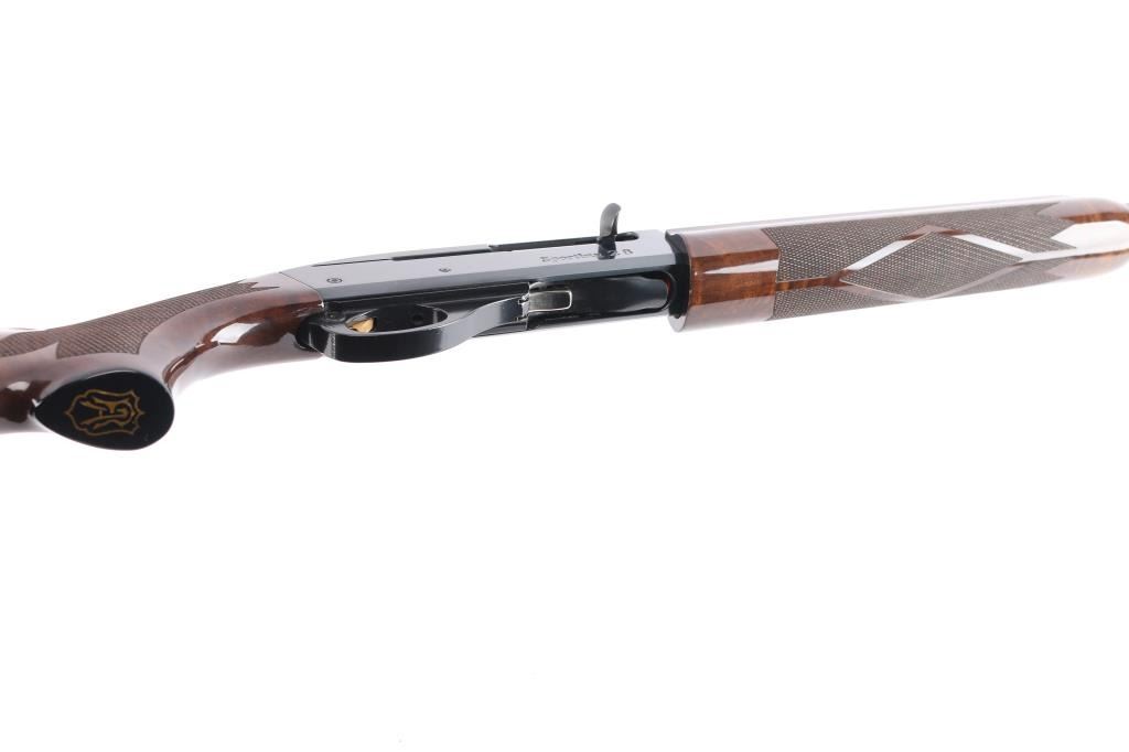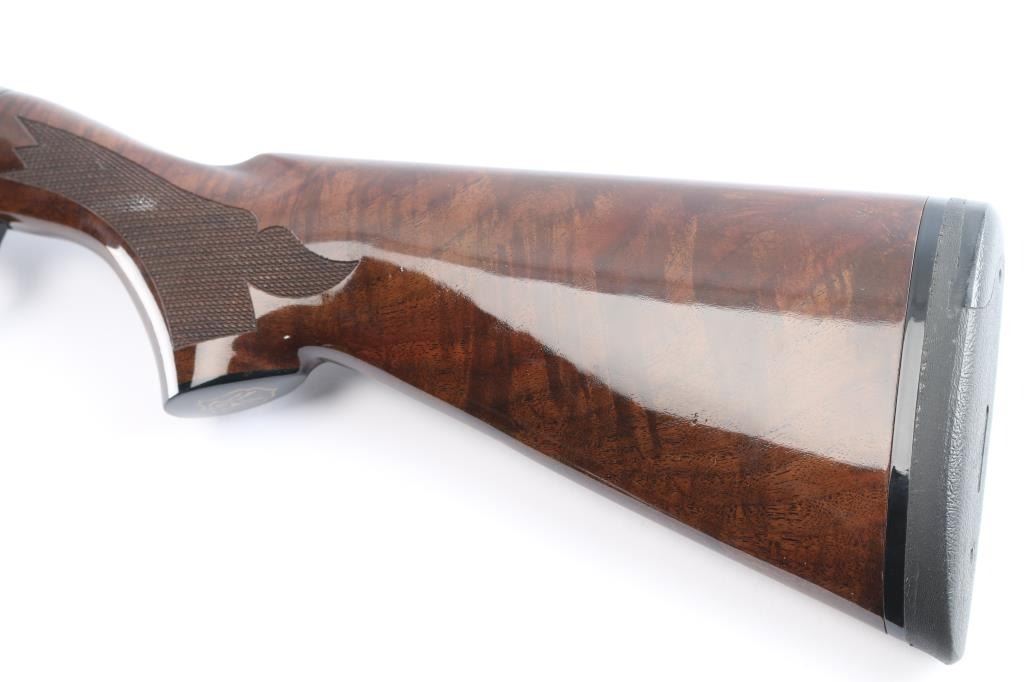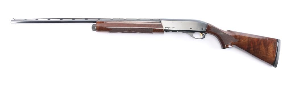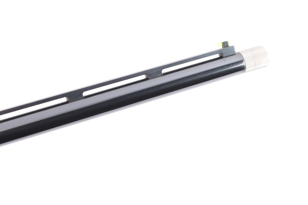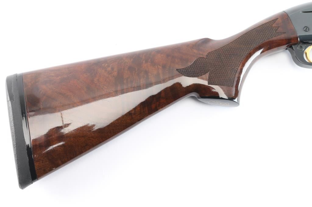 Gas-operated American made semi-auto shotgun chambered for 2 3/4" 28 gauge shells, manufactured circa 1997 ('RZ' date code) in Ilion, NY. It features a high gloss blued finish, a 27" vent rib barrel, extended Light Mod choke tube installed, serrated charging handle, green fiber optic front sight, mid-bead hole drilled and tapped, and smooth curved gold-toned trigger. The high-gloss fancy figured walnut furniture consists of a semi-pistol grip shoulder stock with checkering at the wrist, grooved checkered forend, 14" length-of-pull, 1-5/8" drop at comb, 2-15/16" drop at heel, black tear-drop style grip cap with gold-colored Remington insignia, and black solid rubber Decelerator recoil pad. Bore is bright and shiny, and the action is smooth and crisp. The original blued finish retained is approximately 99% with little remarkable to speak of. Furniture wood is excellent with minor scattered light scratches and blemishes on the buttstock. The metal shows no rust or deformation.