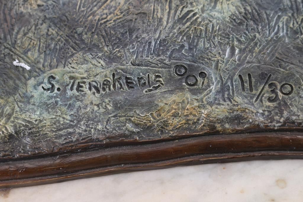 Signed Sam Terakedis, numbered 11 of 30, with antique wood and marble display base. Sam Terakedis is known his subjects in the animal kingdom. Born in 1952, this contemporary artist is extremely popular and actively collected. Compare bronzes of this size for sale online for $6,000-12,000 for less desirable subjects. Measures 10 1/2" x 24" not including base.