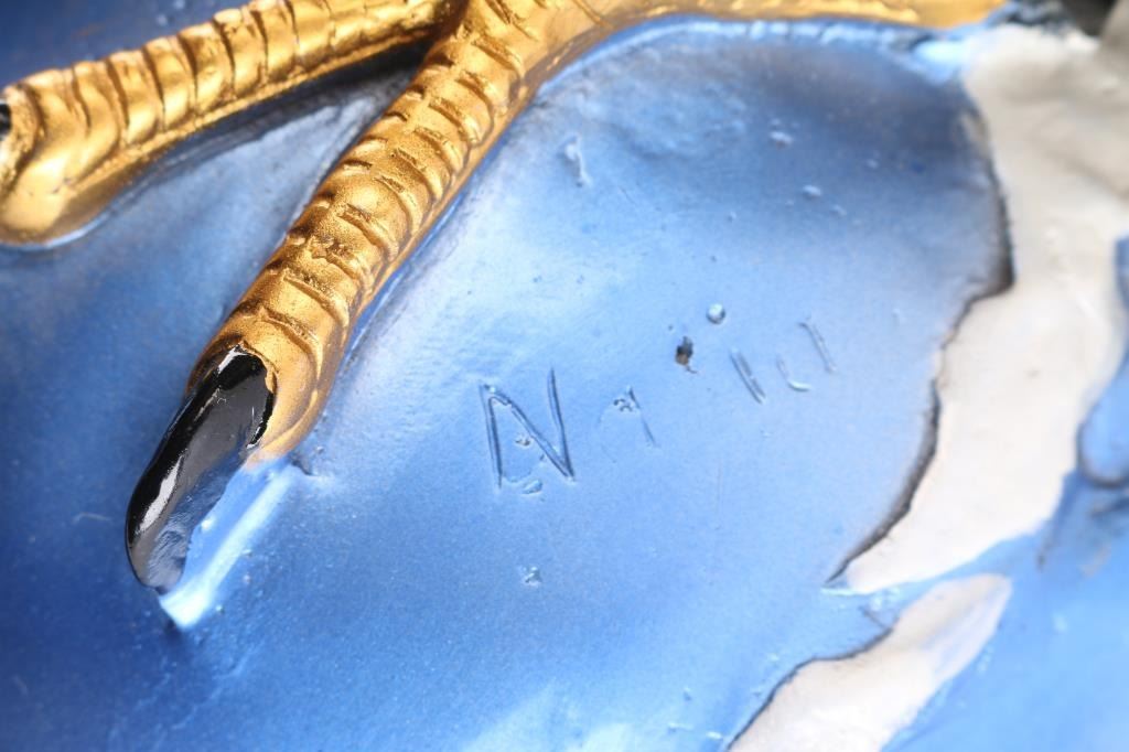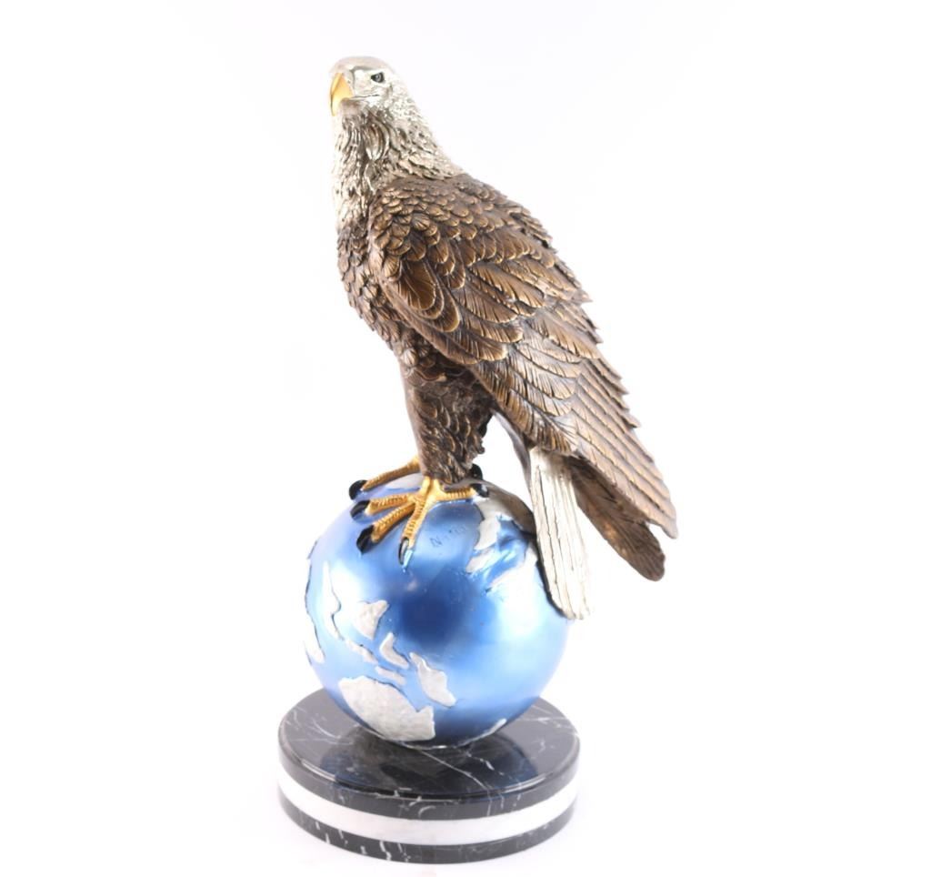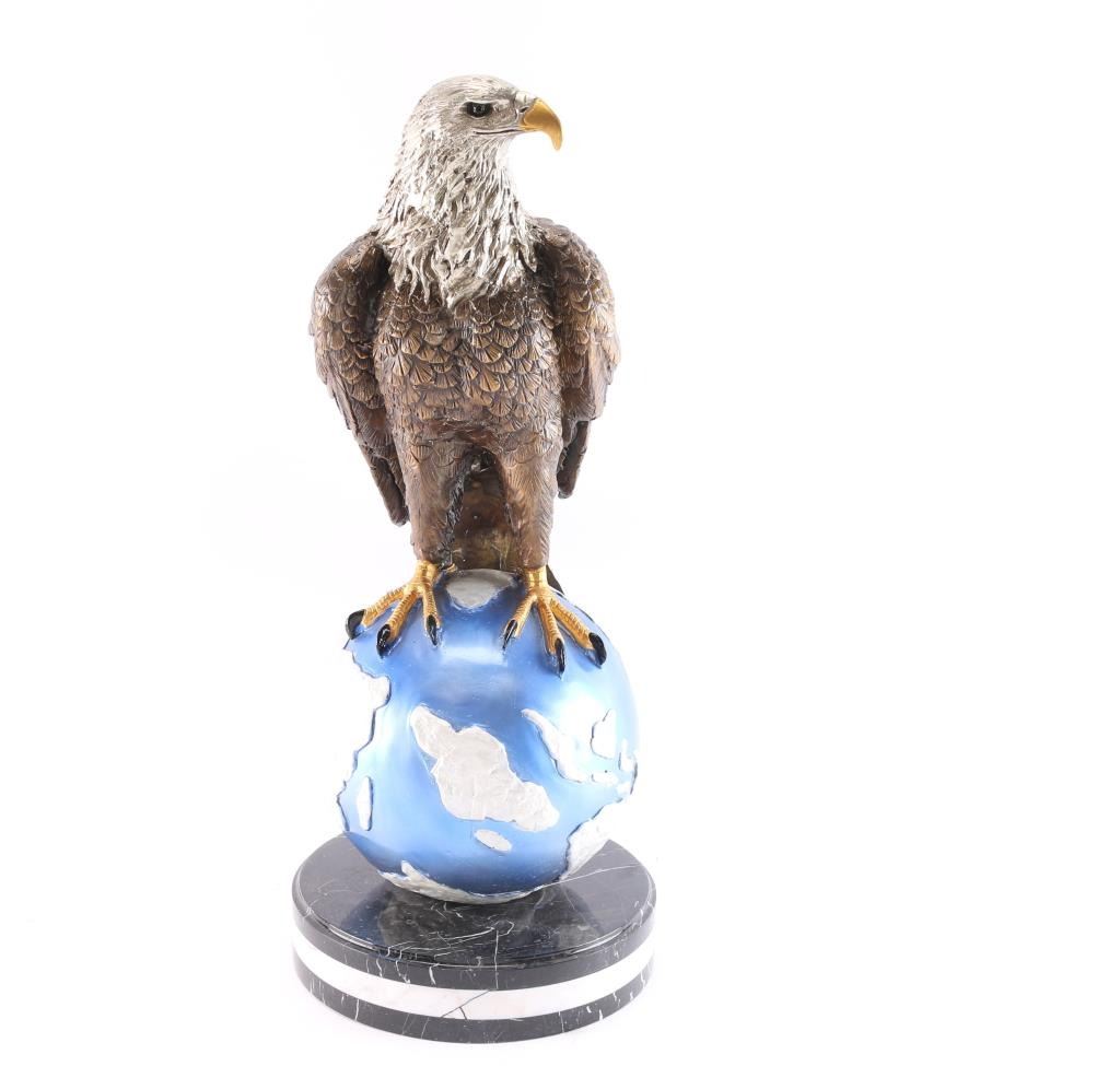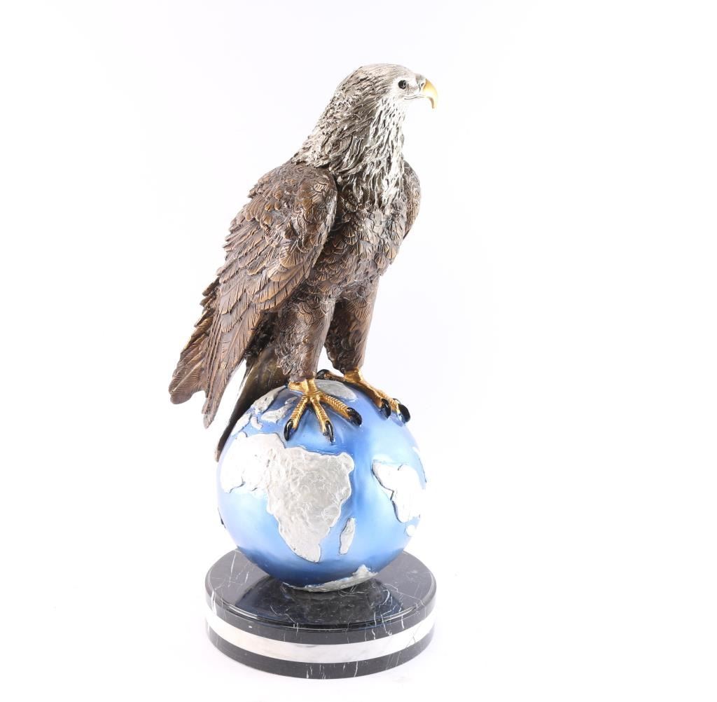 Sitting on globe of the world. Finely colored on two color marble base. Na - ia signed in casting with no visible numbers or other signature. Approximately 24" tall including 2" base. Gallery priced in Loveland, Colorado's Ferrell Gallery at $2,900.