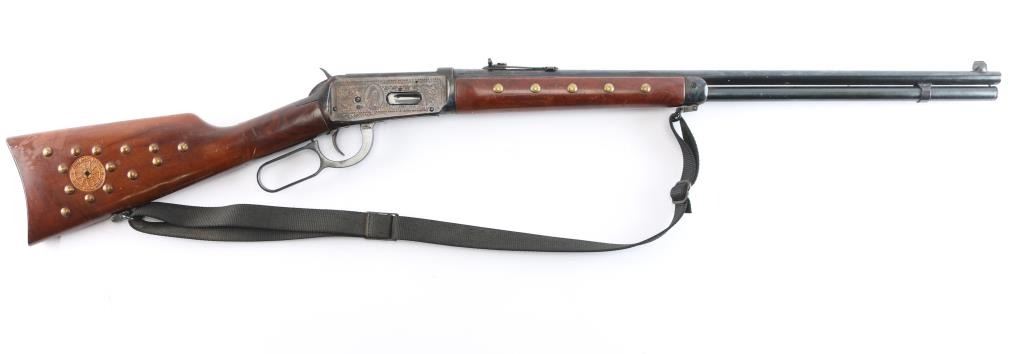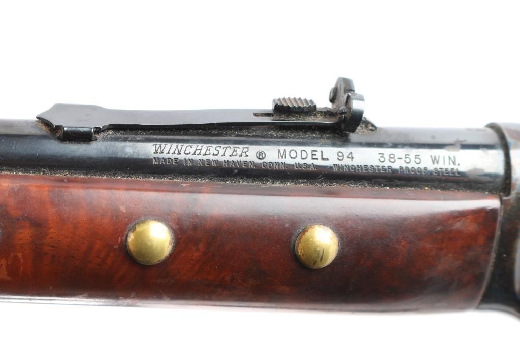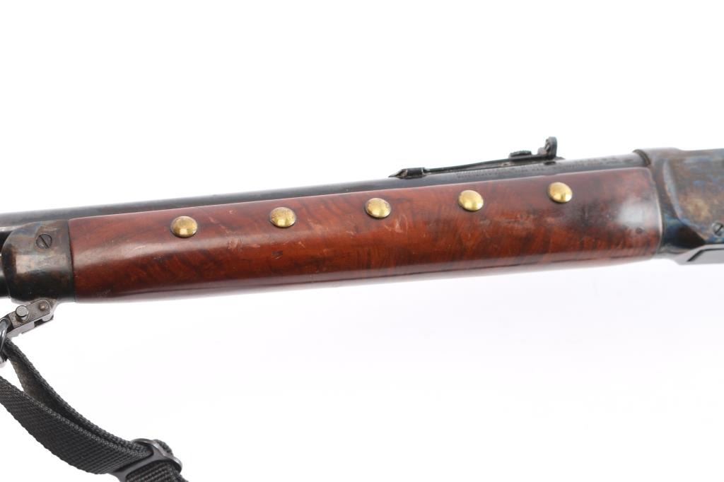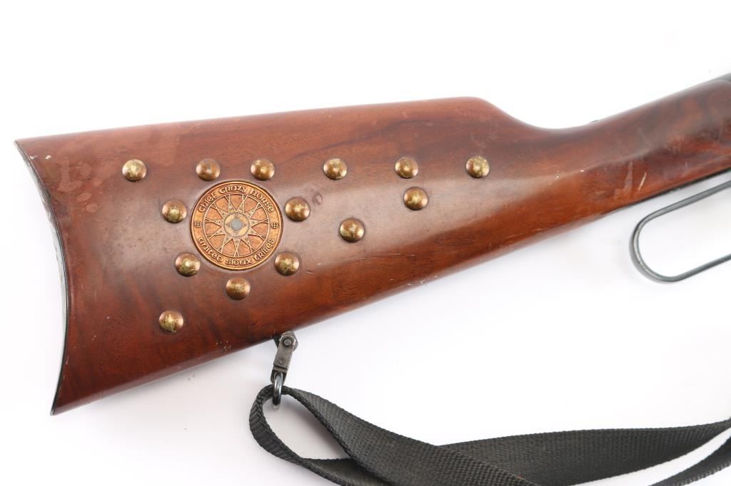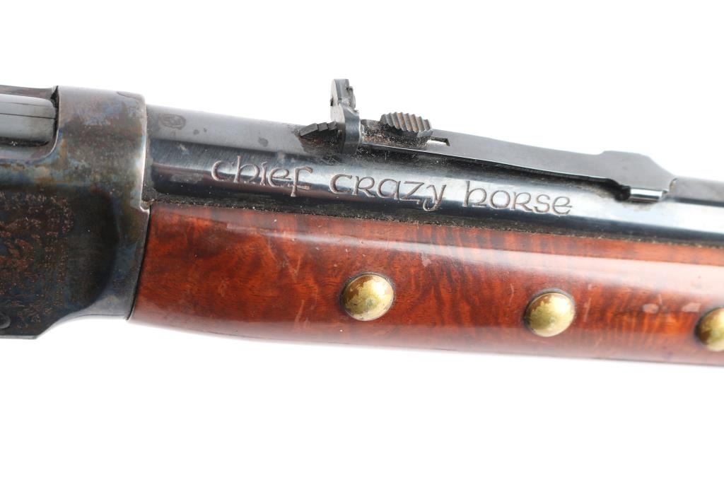 Limited edition commemorative lever action repeating rifle celebrating Lakota warrior Chief Crazy Horse. Chambered in .38-55 Winchester and manufactured circa 1983 with only 19,999 reported to have been produced. Chief Crazy Horse is one of the most notable Native American warriors, he fought in several important battles of the Black Hills War including the Battle of the Little Bighorn where he led his party to victory. Configuration: blued 24" round barrel, full-length magazine tube, dovetailed blade/bead front sight, elevation adjustable rear sporting sight, smooth trigger, serrated hammer spur, saddle ring, roll stamp engraved Chief Crazy Horse scenes on the case hardened receiver, brass tacked smooth deluxe walnut semi-beavertail forend with satin finish, metal forend cap with integral sling lug, and straight grip shoulder stock with brass tack decor, curved metal buttplate & inlayed commemorative medallion on the right side. Rifle exhibits approximately 90% original finish showing scattered light surface rust with some handling wear. Action is crisp, the bore is very good and the wood stocks have minor scratches/dings, some finish loss, there is dried glue and two tacks on the left buttstock where some sort of plaque was affixed. Black nylon sling attached.