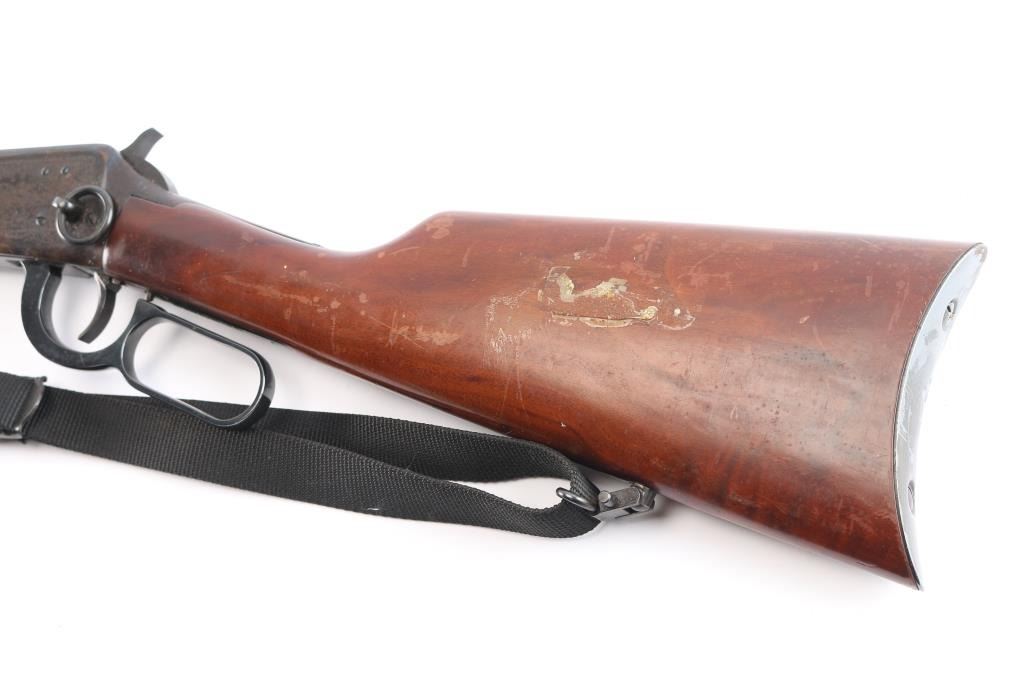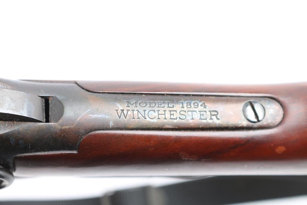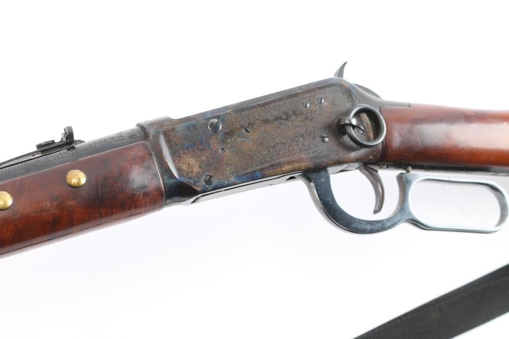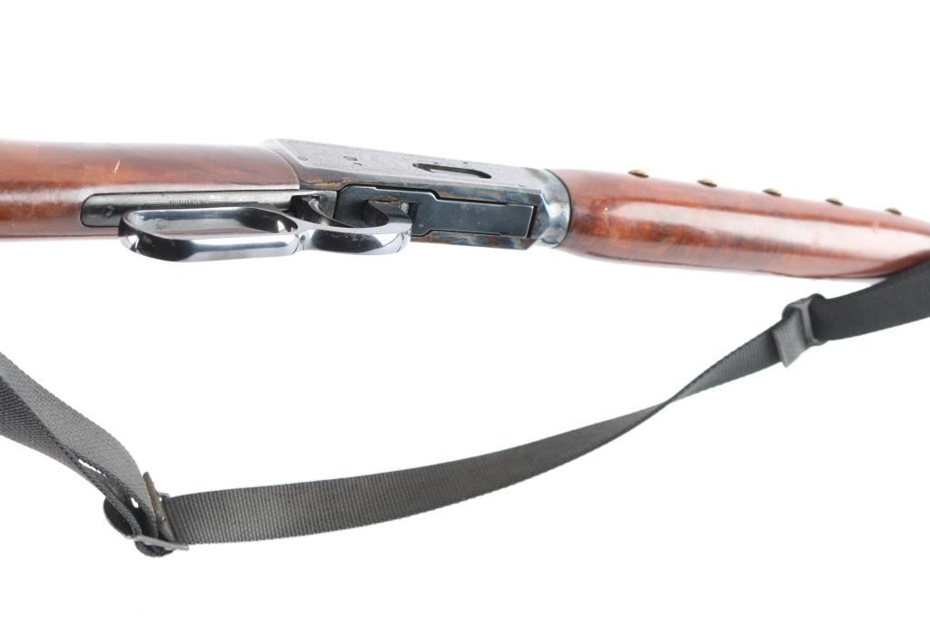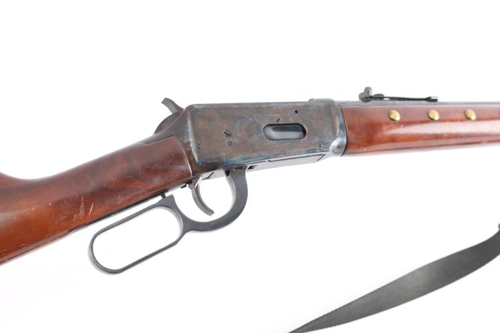 Limited edition commemorative lever action repeating rifle celebrating Lakota warrior Chief Crazy Horse. Chambered in .38-55 Winchester and manufactured circa 1983 with only 19,999 reported to have been produced. Chief Crazy Horse is one of the most notable Native American warriors, he fought in several important battles of the Black Hills War including the Battle of the Little Bighorn where he led his party to victory. Configuration: blued 24" round barrel, full-length magazine tube, dovetailed blade/bead front sight, elevation adjustable rear sporting sight, smooth trigger, serrated hammer spur, saddle ring, roll stamp engraved Chief Crazy Horse scenes on the case hardened receiver, brass tacked smooth deluxe walnut semi-beavertail forend with satin finish, metal forend cap with integral sling lug, and straight grip shoulder stock with brass tack decor, curved metal buttplate & inlayed commemorative medallion on the right side. Rifle exhibits approximately 90% original finish showing scattered light surface rust with some handling wear. Action is crisp, the bore is very good and the wood stocks have minor scratches/dings, some finish loss, there is dried glue and two tacks on the left buttstock where some sort of plaque was affixed. Black nylon sling attached.