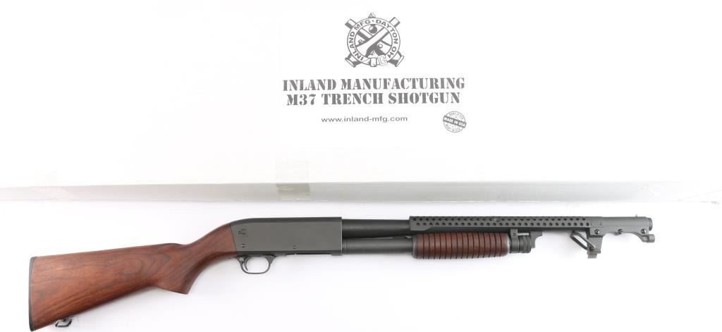 Inland M37 Trench Shotgun American-made combat shotgun, faithful to the original. Parkerized finish, oiled stock, and ventilated hand guard, bayonet lug that fits the long 1917 bayonet. 20" 12 Ga. barrel, Cyl. choke, brass sighting bead, 3" chamber, 3/4" 4-rd tube magazine, manual Pump, Bottom Load & Ejection, sling swivels, The Inland M37 Trench shotgun is manufactured in a joint effort with Ithaca. The original steps of shotgun manufacture that was originally used by Ithaca during WWII has been carefully duplicated. The shotgun is in like new condition, appears unfired. Comes in the factory box with matching label.
