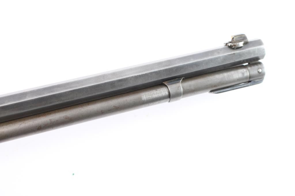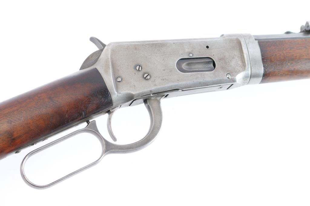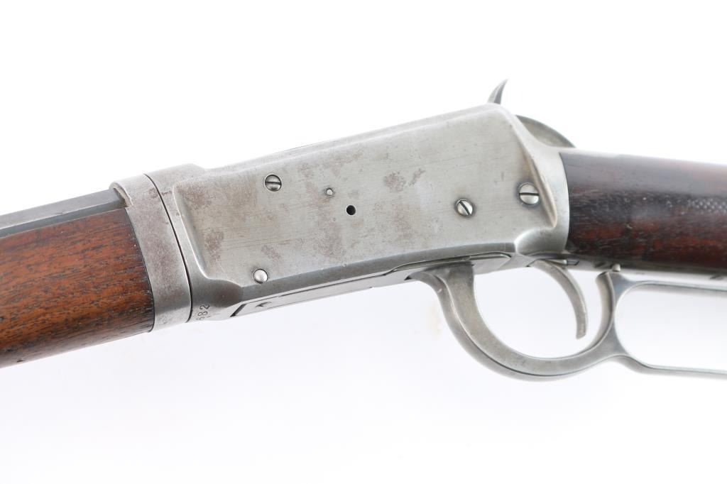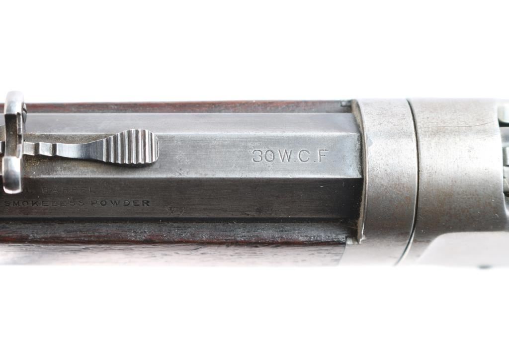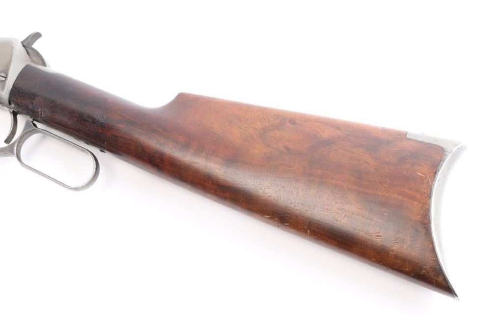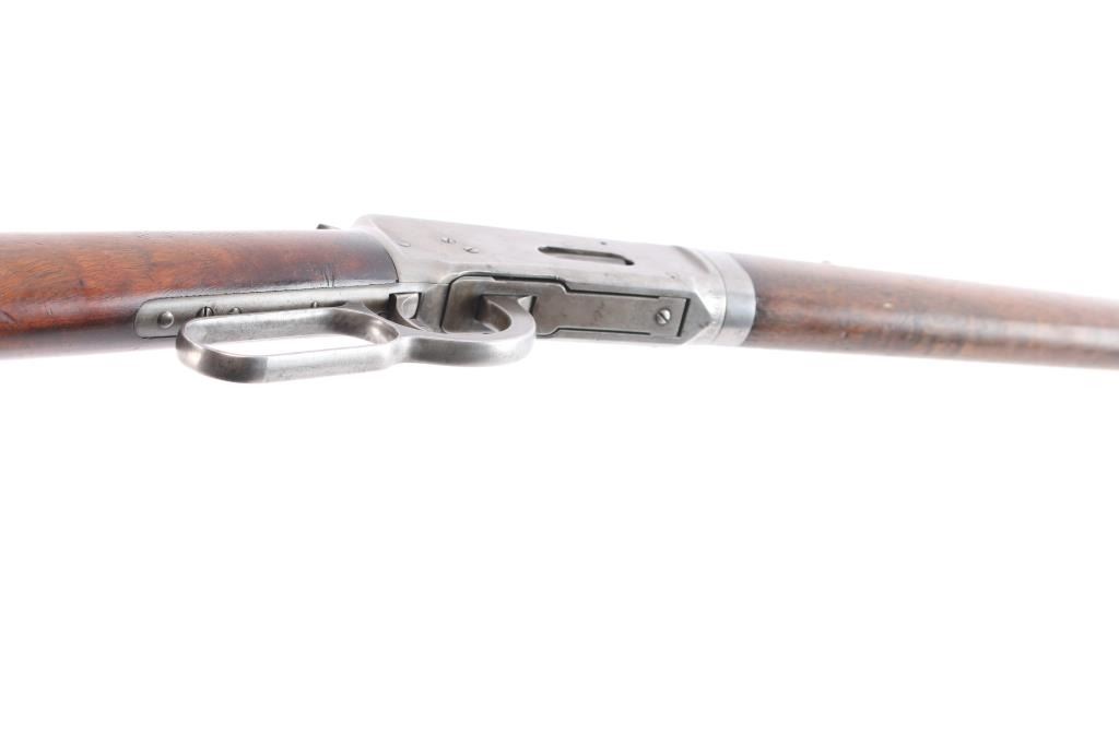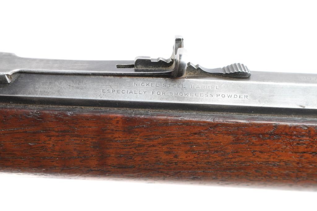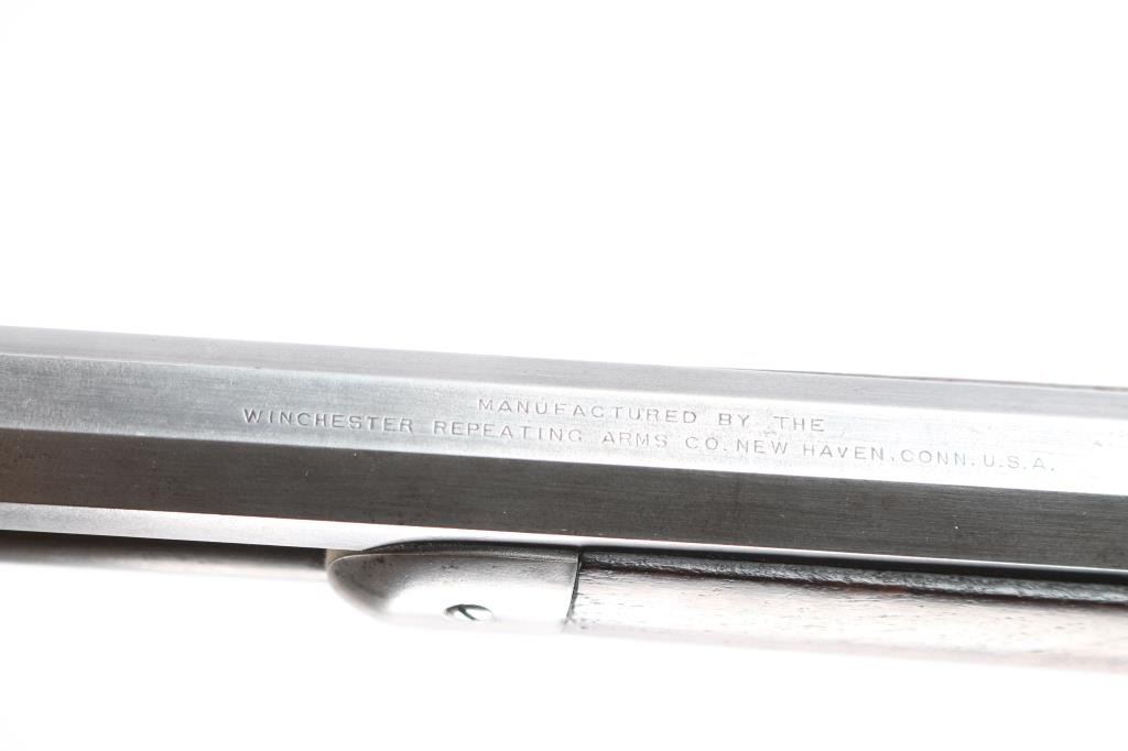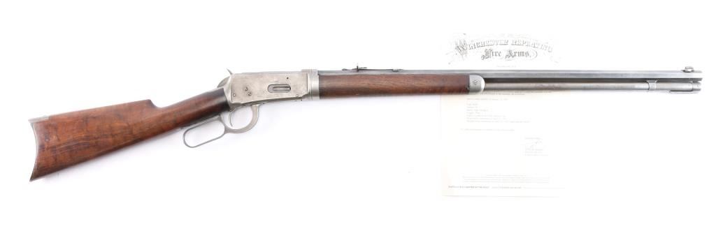 'Take Down' Early production rifle manufactured circa 1901. Features 26" octagon barrel, full length magazine tube, dovetailed Marbles No. 3 blade front sight, buckhorn rear sight, smooth walnut forend & straight wristed buttstock, steel crescent buttplate. Bore is fair to good condition, dark grooves, lightly frosted throughout, strong rifling. Barrel and magazine surfaces are mostly gray mixed with about 20% blue, smooth textured, with mostly gray patina color on receiver, some darker color blue retained in small areas. Areas of light pinprick patina across the receiver. Bare metal on mag tube where it slides forward during takedown. Wood isoverall very good condition, no chips or cracks, minor scratches/dings. Included factory letter confirms this rifle caliber, octagon barrel. Does not list take-down and lists sights as "Lyman front, leaf and rear cup. All Winchester markings are clear/readable.