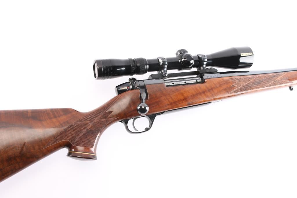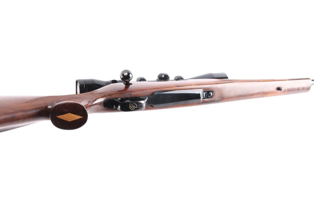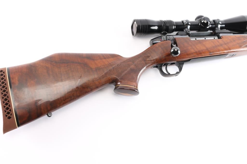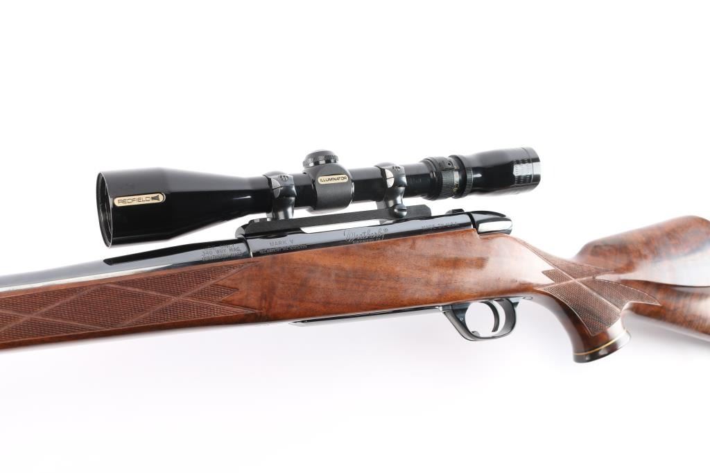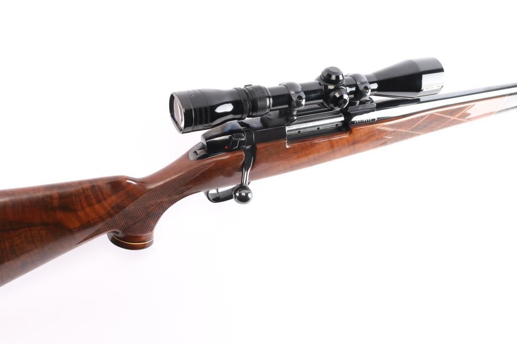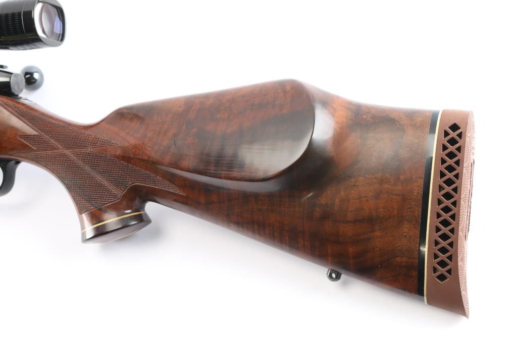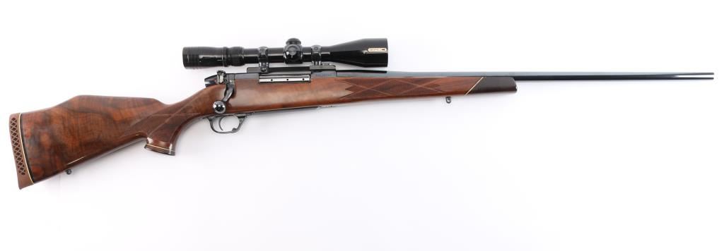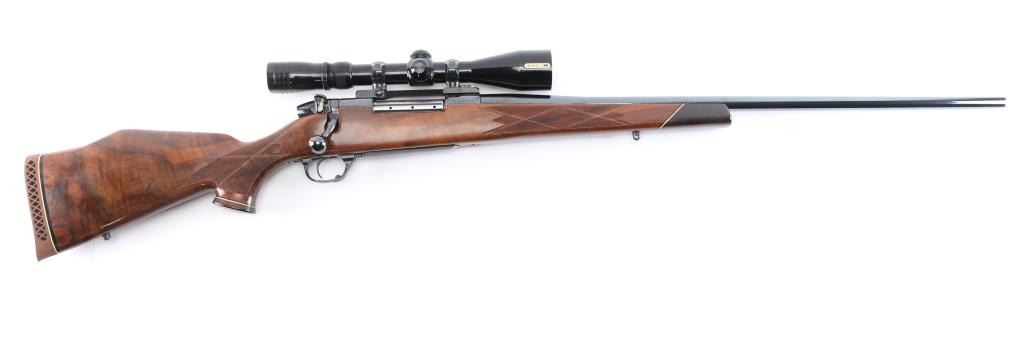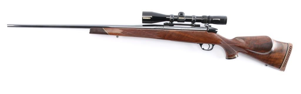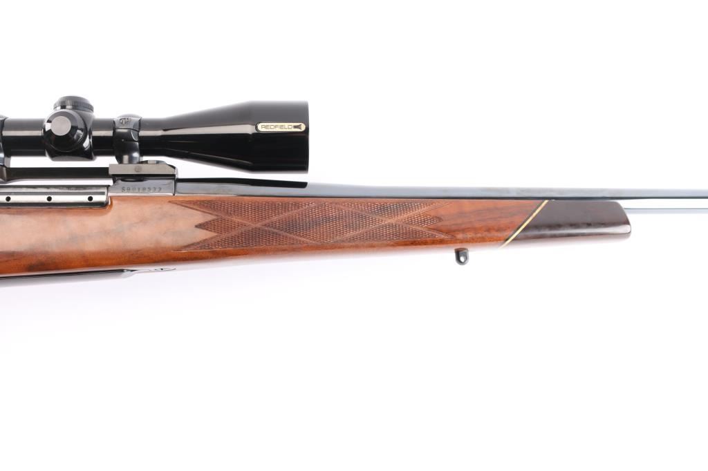 Bolt action rifle made in Atascadero CA. Features blued finish, extra fancy figured walnut stock, 26" barrel, no sights, one piece Redfield scope base & rings, manual safety on right side of bolt shroud, gold paint filled engraved "W" on triggerguard bow, sling studs, ventilated rubber recoil pad. Stock is Monte Carlo styled with contrasting grip cap & forend tip, white diamond inset on grip cap, curved grip, high combed right hand cheek piece, checkered panels at wrist & forend. serrated trigger, thumb safety on right receiver, hinged floorplate release in triggerguard. Bore is excellent condition. Retains 98% high polish blue finish with handling marks. Stock is excellent condition. Mounts a very good condition Redfield "Illuminator" 3-9x scope with wide "TV" view, duplex reticle, clear optics.