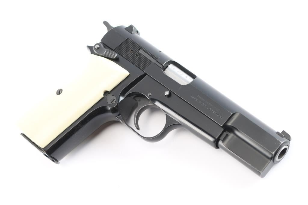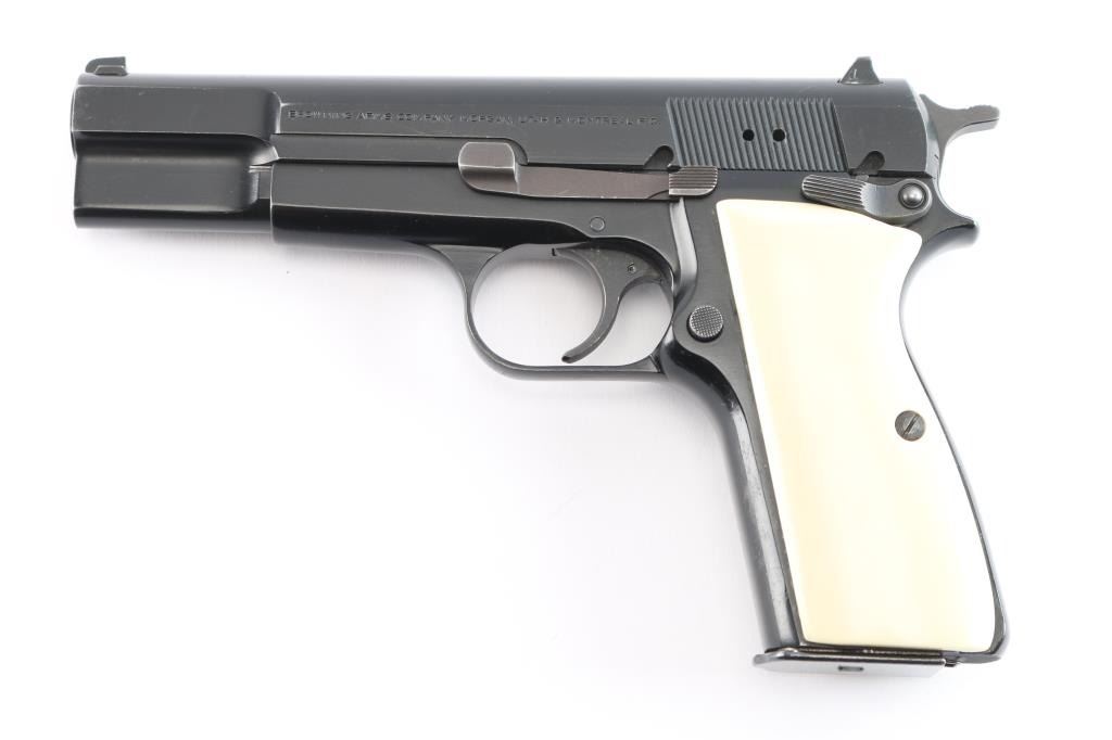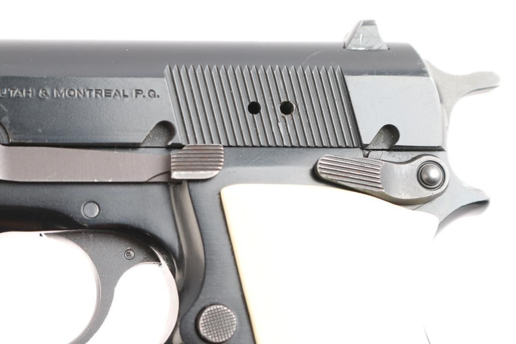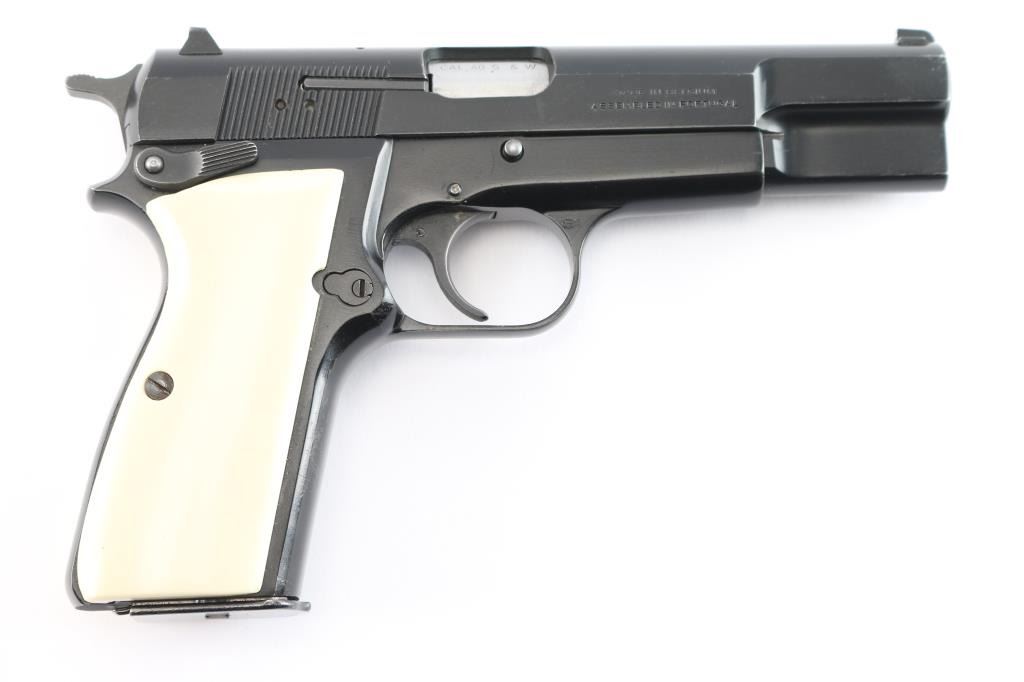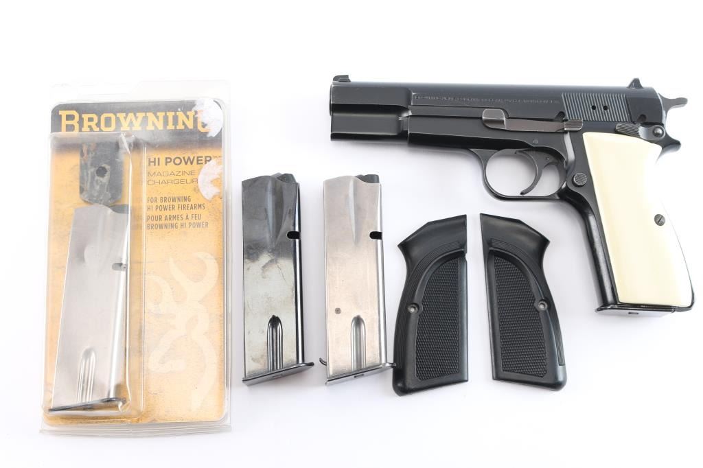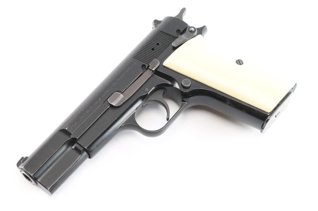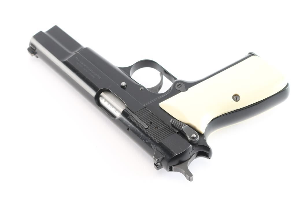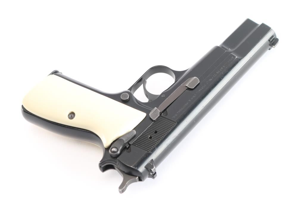 Single action semi-automatic pistol chambered in .40 Smith & Wesson, assembled in Portugal with Belgium made parts circa 1994. Features a black enamel finish, 4 21/32" two-piece barrel, external extractor, dovetailed Patridge front sight, dovetailed rear sight with square notch, smooth trigger, serrated hammer spur, ambidextrous manual safety/slide catch on the frame, magazine disconnect safety, push button magazine release, 10 round magazine with spring for positive ejection from the magazine well, steel frame and two-piece faux ivory grips. Pistol exhibits approximately 90-95% of it's original finish showing light scratches and minor wear observed on slide and frame. Action is strong, the bore is pristine, and the grips are fine. Also comes with original grips, and (3) spare magazines.