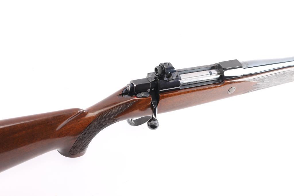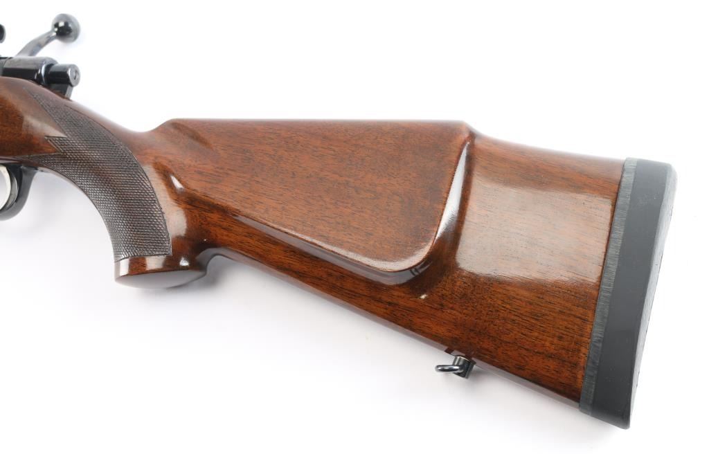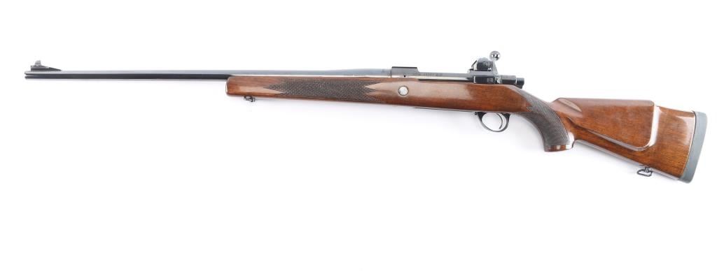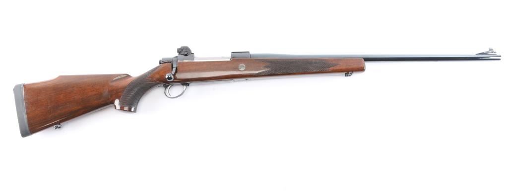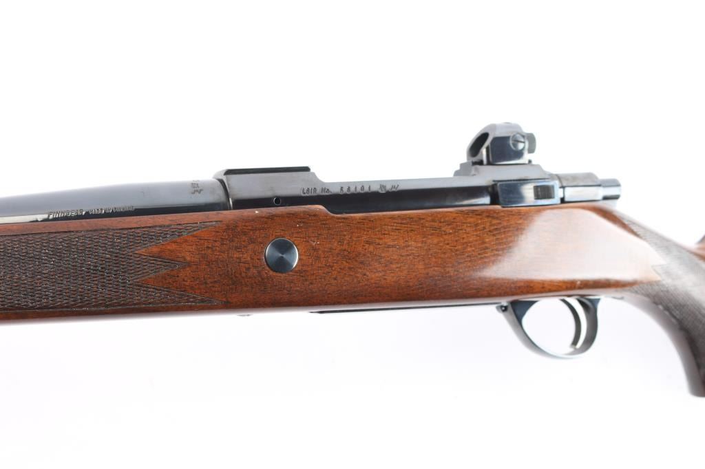 High quality Finnish bolt action rifle, manufactured circa 1971, no importer markings observed. Features high-polish blued finish, wood Monte-Carlo style stock with right hand cheek piece, solid rubber butt pad, checkered panels at forend & curved wrist, sling swivels, 24" barrel, dovetailed, ramped blade front sight, it has the detachable, and highly sought-after rear aperture (peep) sight, mounted onto the rear integral receiver dovetail with 100/200 yard, dual-range capability via a rotating eyepiece. Hinged floorplate, manual safety on right side of action, flat top receiver with integral dovetail rails. Bore is excellent/bright. Retains about 97% bluing with minor handling marks. Stock is overall excellent with minor blemishes. Action is smooth.