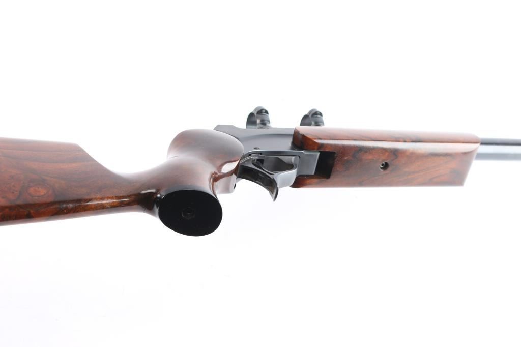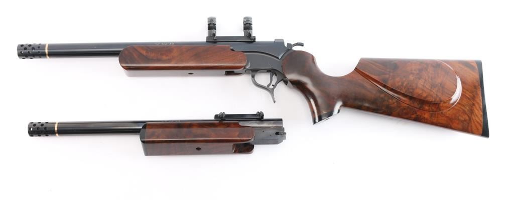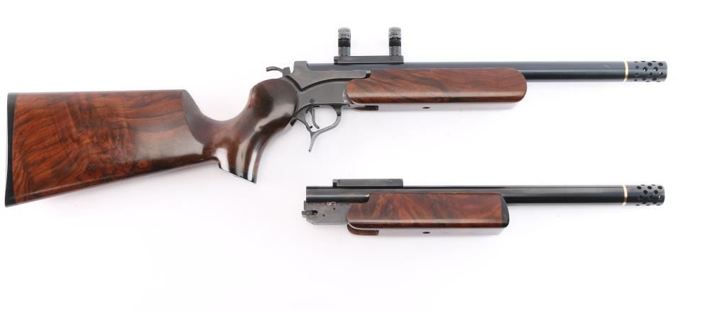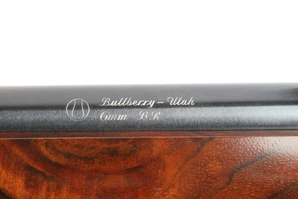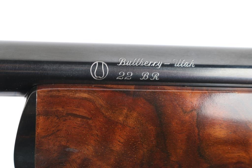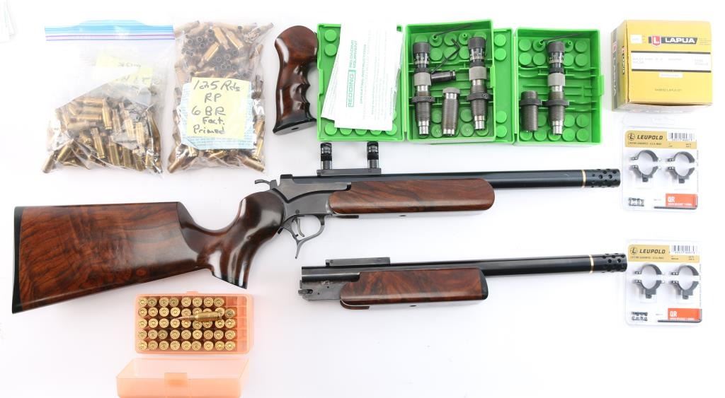 Highly customized modular break action single shot pistol or rifle with barrels chambered in 6mm Benchrest & .22 Benchrest (made from 6mm BR brass with a single pass through the provided sizing die). Features a blued finish, Bullberry 16" bull barrel with integral muzzle brake, recessed target crown, 3.2mm gold band & no provisions for iron sights, Leupold QR scope base with 1” rings, serrated curved trigger with adjustable overtravel stop in the trigger guard/lever, serrated hammer spur, Bullberry fancy walnut beavertail forend and right-handed semi-pistol grip shoulder stock with shadow line cheek piece, ebony grip cap, ebony buttplate & 14 ?” LOP. Includes a set of Bullberry fancy walnut pistol furniture with ebony forend tip & grip cap and a Bullberry 16” bull barrel chambered in .22 Benchrest with integral muzzle brake, recessed target crown, 3.2mm gold band, no provisions for iron sights and installed Leupold QR scope base. Additional Accessories: Two sets of Leupold QR 1” scope rings #49971 (low) & #49974 (medium). Ammo: 45 Rounds of Reloaded Ammunition. Reloading: Redding 6mm BR Competition Bushing Neck Sizing Die Set, Redding .22 BR Competition Bullet Seating Die Set, 100ct box of Lapua 6mm BR new brass cases, 125ct bag of R-P factory primed 6mm BR brass cases, 14ct resized & primed 6mm BR brass cases, 78ct bag of twice fired 6mm BR primed brass cases, 23ct bag of spent 6mm BR brass cases & 10ct bag of deprimed .22 BR brass cases. Condition is Excellent. Pistol/Rifle retains approximately 97% of its blued finish minor handling marks and light contact wear on the receiver & barrel from working the action. The action is mechanically sound, the bore is pristine and the stunning walnut stocks are excellent with minute finish loss & blemishes.