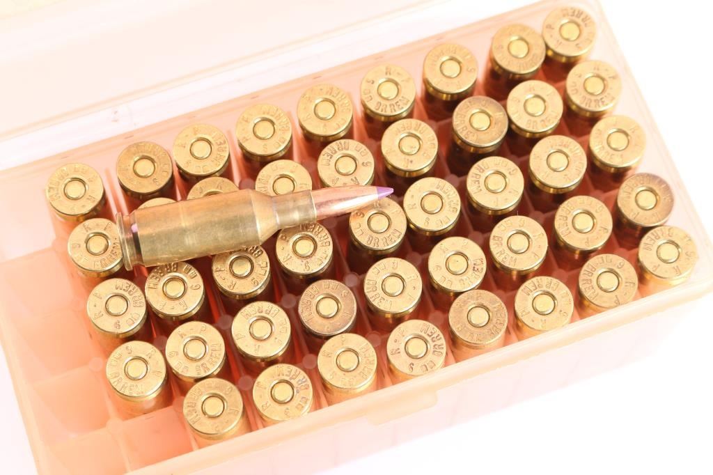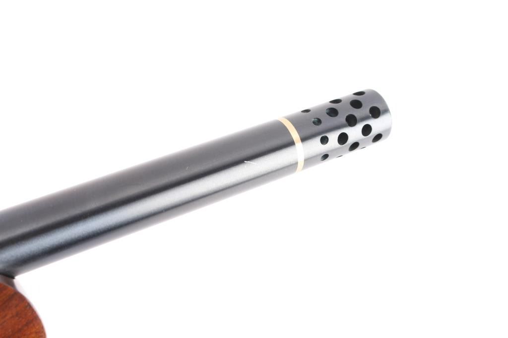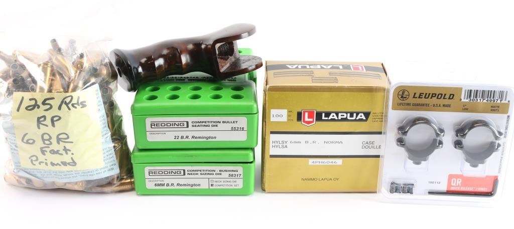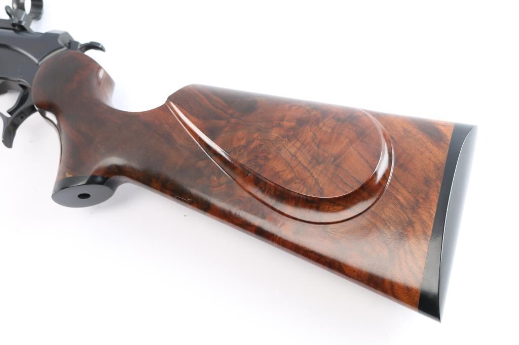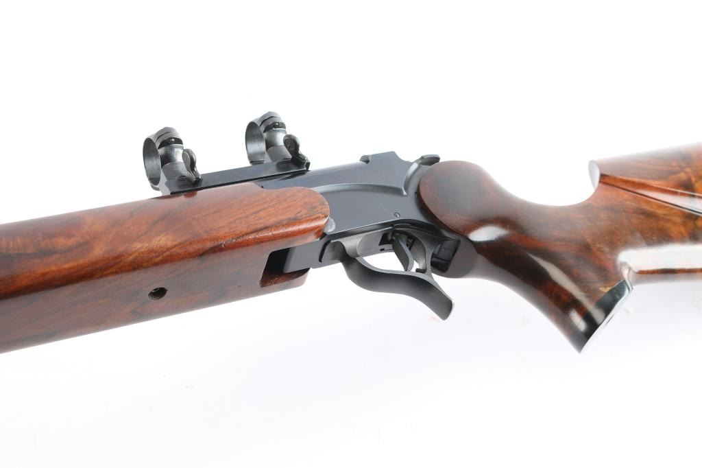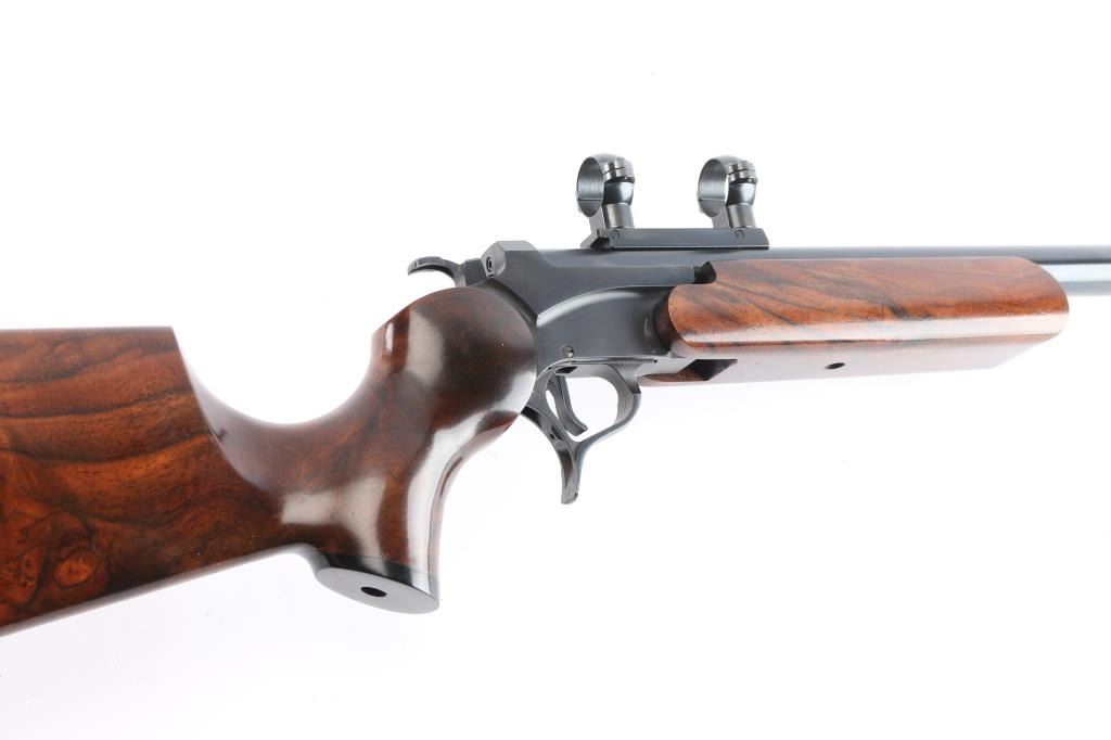 Highly customized modular break action single shot pistol or rifle with barrels chambered in 6mm Benchrest & .22 Benchrest (made from 6mm BR brass with a single pass through the provided sizing die). Features a blued finish, Bullberry 16" bull barrel with integral muzzle brake, recessed target crown, 3.2mm gold band & no provisions for iron sights, Leupold QR scope base with 1” rings, serrated curved trigger with adjustable overtravel stop in the trigger guard/lever, serrated hammer spur, Bullberry fancy walnut beavertail forend and right-handed semi-pistol grip shoulder stock with shadow line cheek piece, ebony grip cap, ebony buttplate & 14 ?” LOP. Includes a set of Bullberry fancy walnut pistol furniture with ebony forend tip & grip cap and a Bullberry 16” bull barrel chambered in .22 Benchrest with integral muzzle brake, recessed target crown, 3.2mm gold band, no provisions for iron sights and installed Leupold QR scope base. Additional Accessories: Two sets of Leupold QR 1” scope rings #49971 (low) & #49974 (medium). Ammo: 45 Rounds of Reloaded Ammunition. Reloading: Redding 6mm BR Competition Bushing Neck Sizing Die Set, Redding .22 BR Competition Bullet Seating Die Set, 100ct box of Lapua 6mm BR new brass cases, 125ct bag of R-P factory primed 6mm BR brass cases, 14ct resized & primed 6mm BR brass cases, 78ct bag of twice fired 6mm BR primed brass cases, 23ct bag of spent 6mm BR brass cases & 10ct bag of deprimed .22 BR brass cases. Condition is Excellent. Pistol/Rifle retains approximately 97% of its blued finish minor handling marks and light contact wear on the receiver & barrel from working the action. The action is mechanically sound, the bore is pristine and the stunning walnut stocks are excellent with minute finish loss & blemishes.
