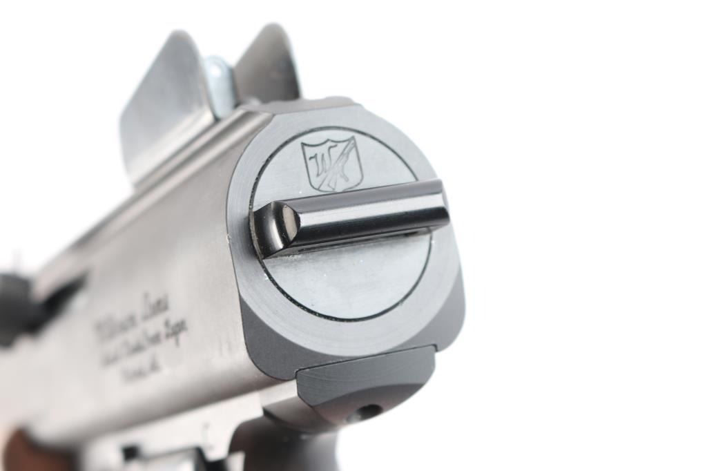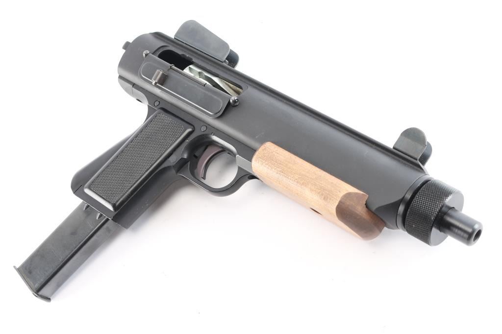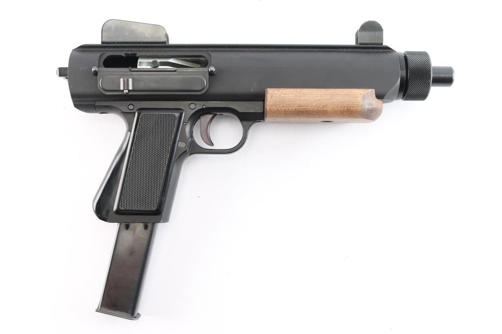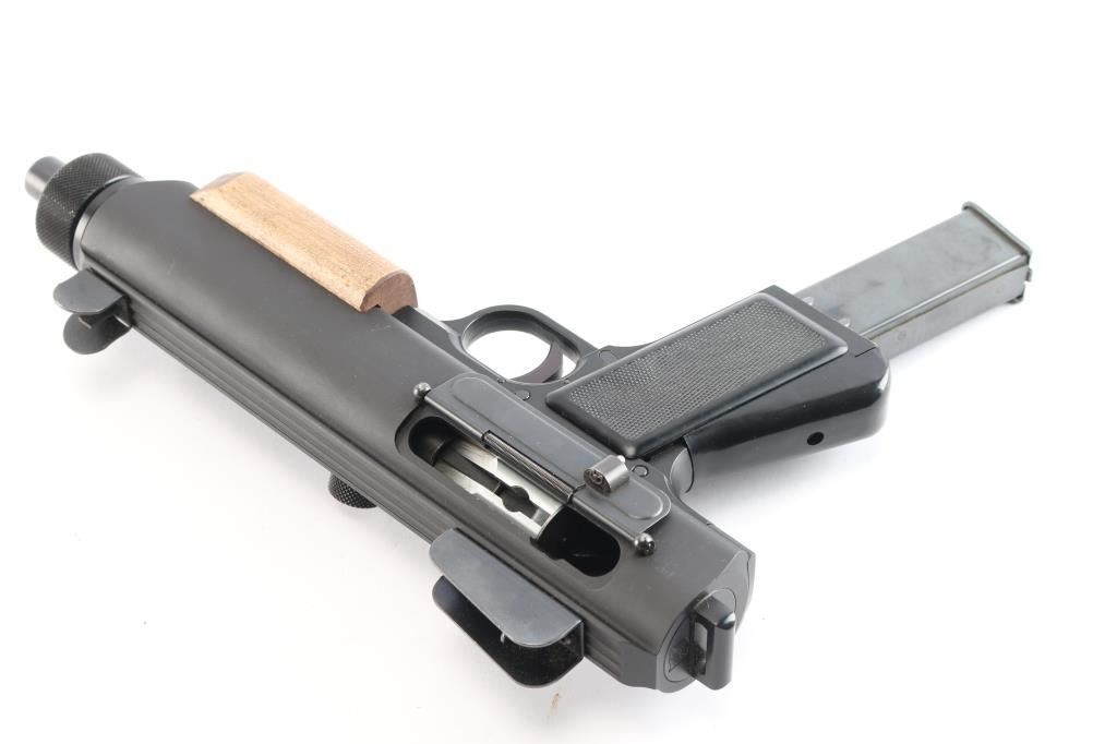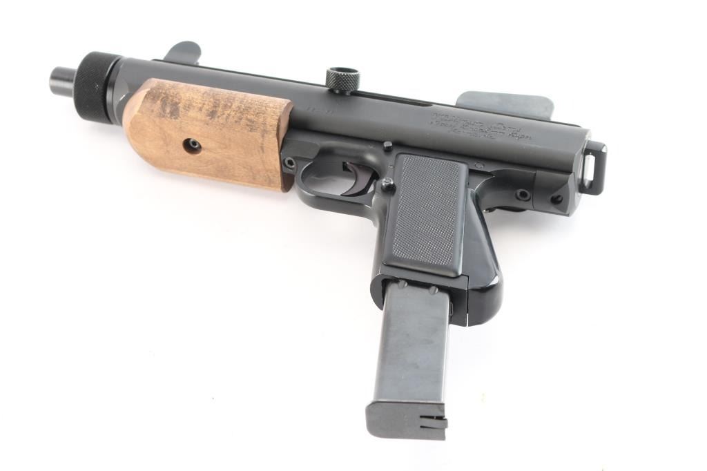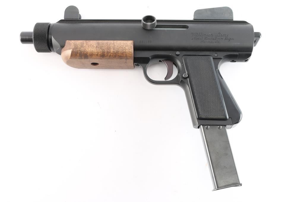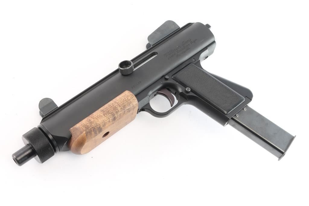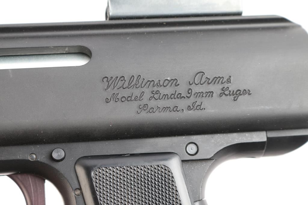 Unique American made straight blowback semi-automatic pistol chambered for 9x19mm Luger, and manufactured in Parma, ID. Named after Ray Wilkinson's daughter, Linda, and designed with law enforcement in mind. This was inspired by the Uzi and CZ SA 23, and projects 1980's aesthetics. Pistol features matte black finish, 8-3/8" barrel, fixed protected blade front sight, fixed peep rear sight, integral Weaver rail on the top of the receiver, smooth curved trigger, magazine in grip, frame mounted push-button cross-bolt safety, annular cut push-button mag release, flat smooth walnut forend, smooth front strap metal butt plate with sling loop, checkered black polymer grip panels, and spring loaded ejection port cover. The original matte black finish retained is approximately 97% showing light scratches on the front strap, and edge wear in front of the forend. Metal displays no rust, or deformation. The action is smooth and crisp, and the bore is bright with strong rifling. The wood forend is in excellent condition, and the polymer grip panels are also excellent. Pistol includes one magazine total.