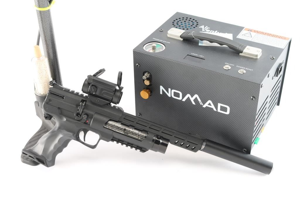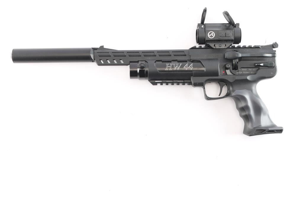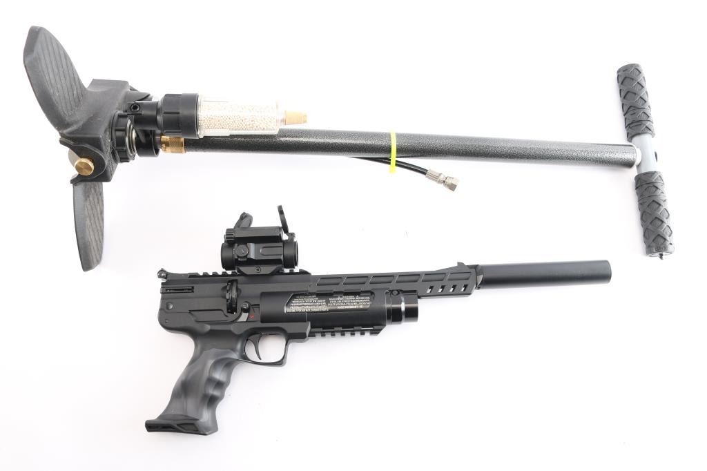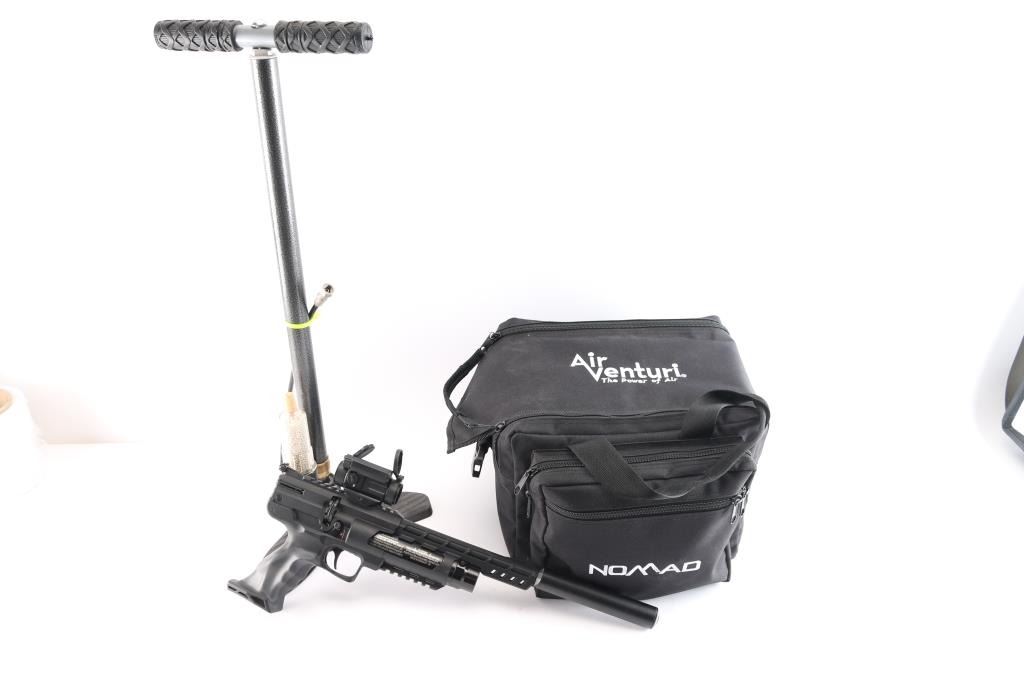 High Quality German made Air Pistol. known for excellent accuracy. Vibration free shot release, fast and easy repeating, 10-shot magazine capacity, built in, fillable air cartridge with 200 bar, integral pressure gauge and quick-fill equipment, regulator. .177" Cal. (4,5 mm), well-balanced, two stage adjustable match trigger with manual safety, slip-resistant pistol grip fits for right- and left-handed shooters, weaver-type rail mount. Moderator noise suppression device attached to the gun's muzzle, red-dot scope installed, in good working order. Included with this pistol is the manual, test target, a Hill Mk5 Pro Air Pump with Dry-Air System with manual, factory silicone grease, Air Venturi Nomad II 4500 PSI portable air compressor complete with hose/filter, charging cable, manual, factory Air Compressor Oil and factory nylon carrying case. two 10 round magazines. The pistol and accessories are in NRA excellent/like new condition. Antique firearm.