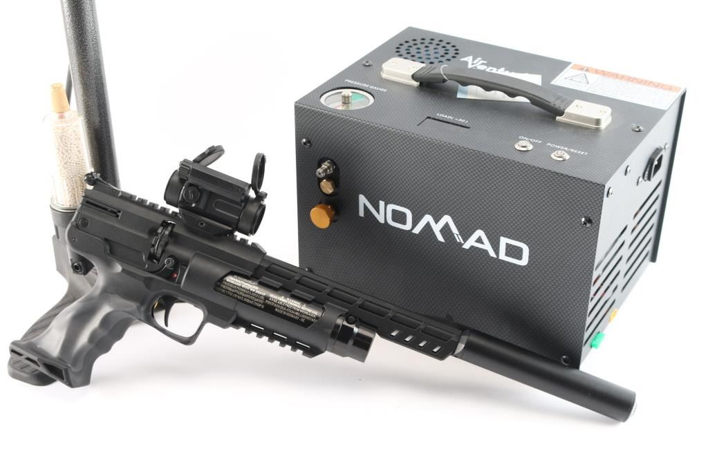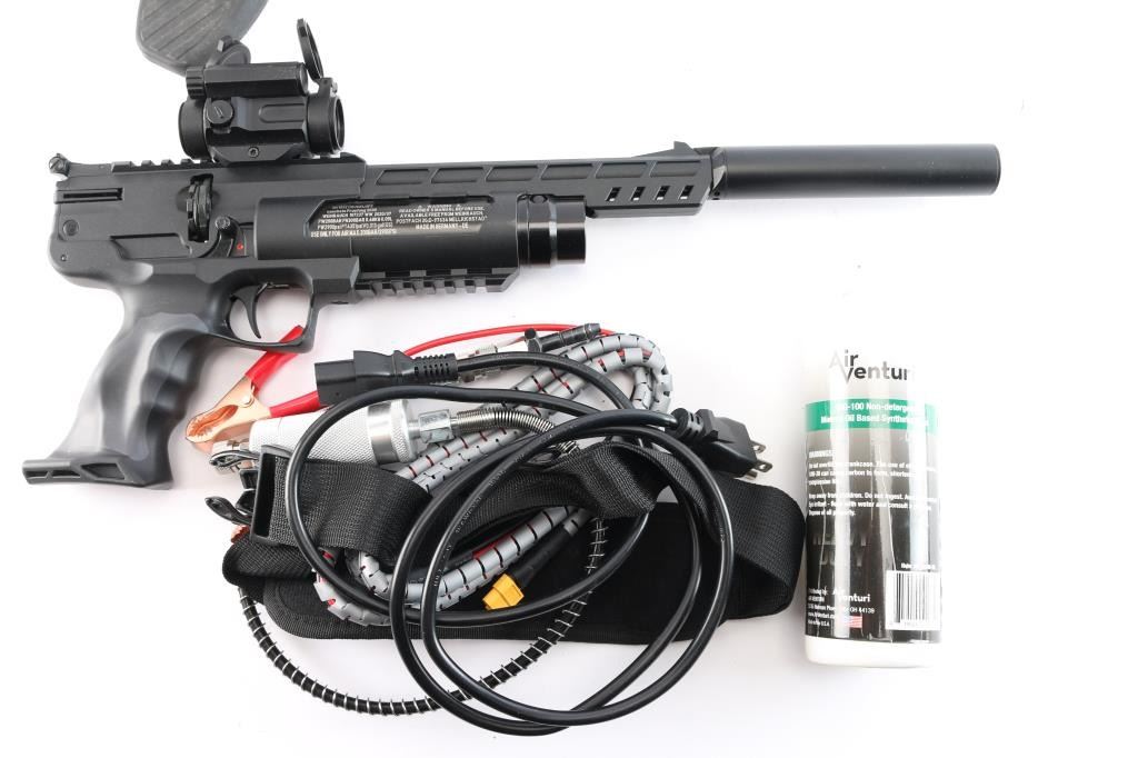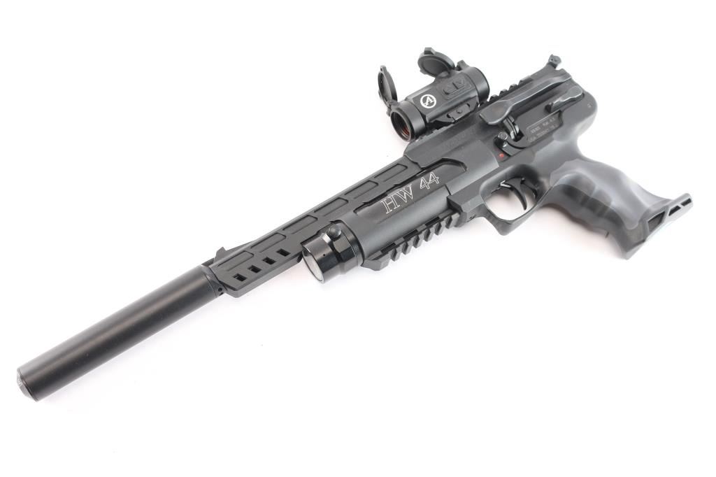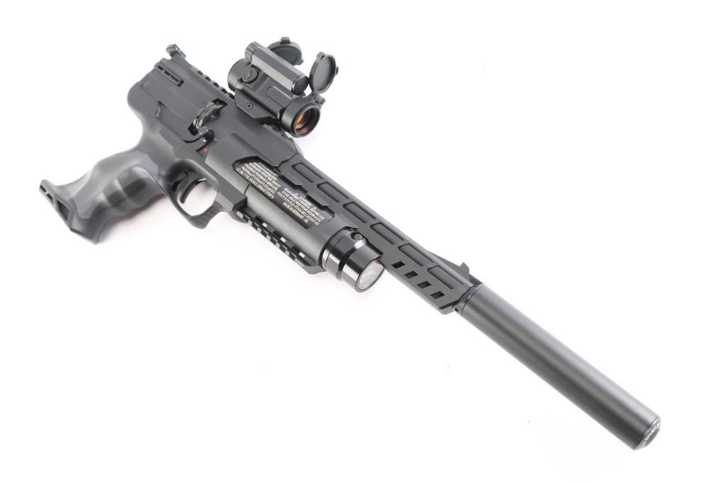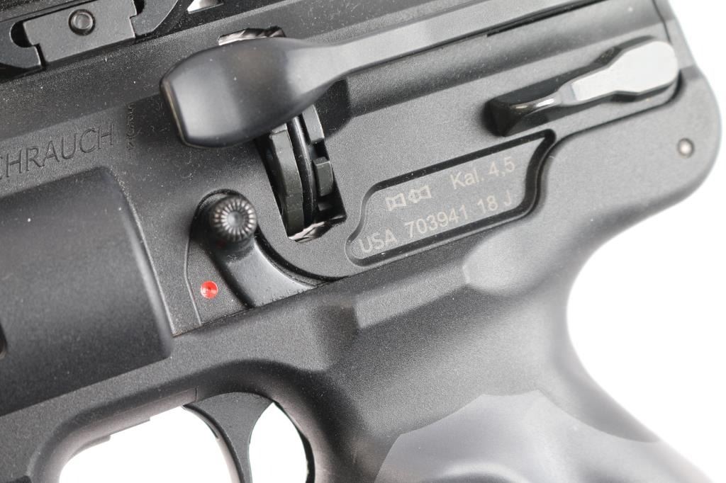 High Quality German made Air Pistol. known for excellent accuracy. Vibration free shot release, fast and easy repeating, 10-shot magazine capacity, built in, fillable air cartridge with 200 bar, integral pressure gauge and quick-fill equipment, regulator. .177" Cal. (4,5 mm), well-balanced, two stage adjustable match trigger with manual safety, slip-resistant pistol grip fits for right- and left-handed shooters, weaver-type rail mount. Moderator noise suppression device attached to the gun's muzzle, red-dot scope installed, in good working order. Included with this pistol is the manual, test target, a Hill Mk5 Pro Air Pump with Dry-Air System with manual, factory silicone grease, Air Venturi Nomad II 4500 PSI portable air compressor complete with hose/filter, charging cable, manual, factory Air Compressor Oil and factory nylon carrying case. two 10 round magazines. The pistol and accessories are in NRA excellent/like new condition. Antique firearm.