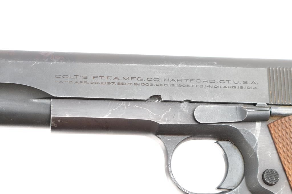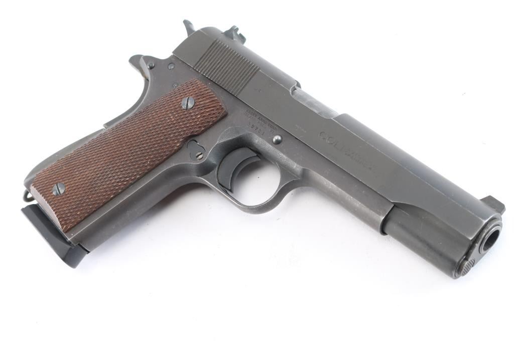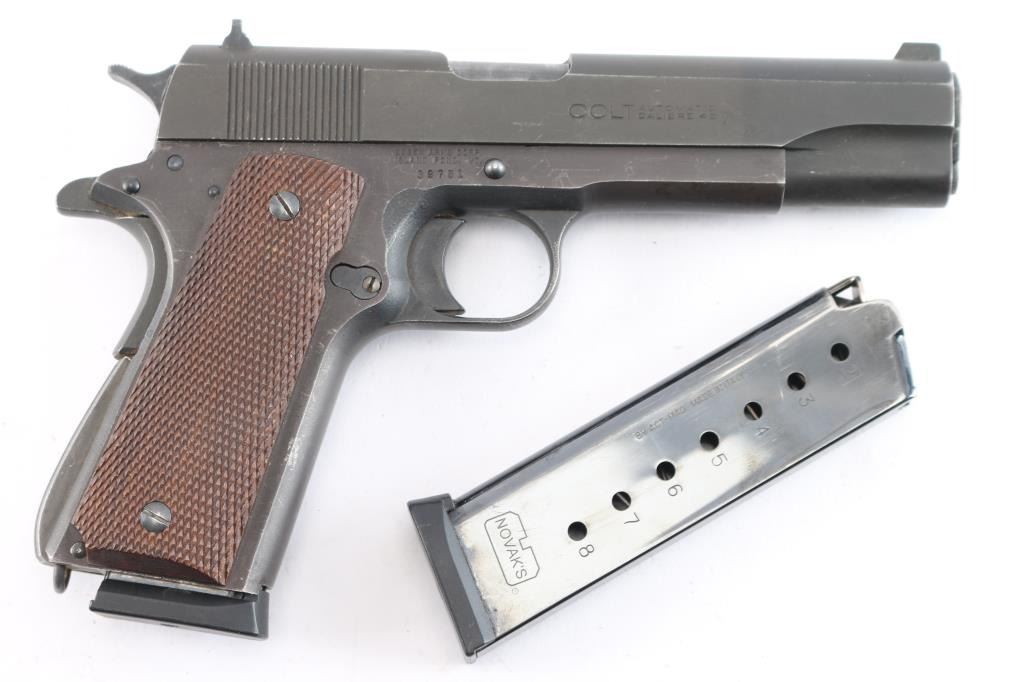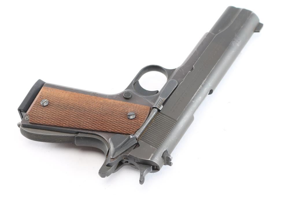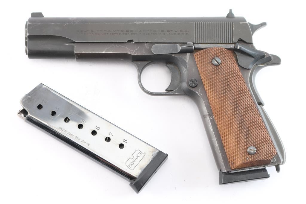 Semiautomatic pistol using a Colt Government Model slide (and probably barrel, etc) assembled on an aftermarket frame. Features matte dark gray finish, checkered wood grips, 5" barrel, fixed sights with front blade, notch rear, beavertail grip safety, thumb safety, serrated arched mainspring housing with lanyard loop. Bore is very good/bright. Retains about 90% finish with many minor scratches and edge wear. Grips are very good condition. Includes (2) blued 8 rd magazines, one Novak and one Act-Mag.