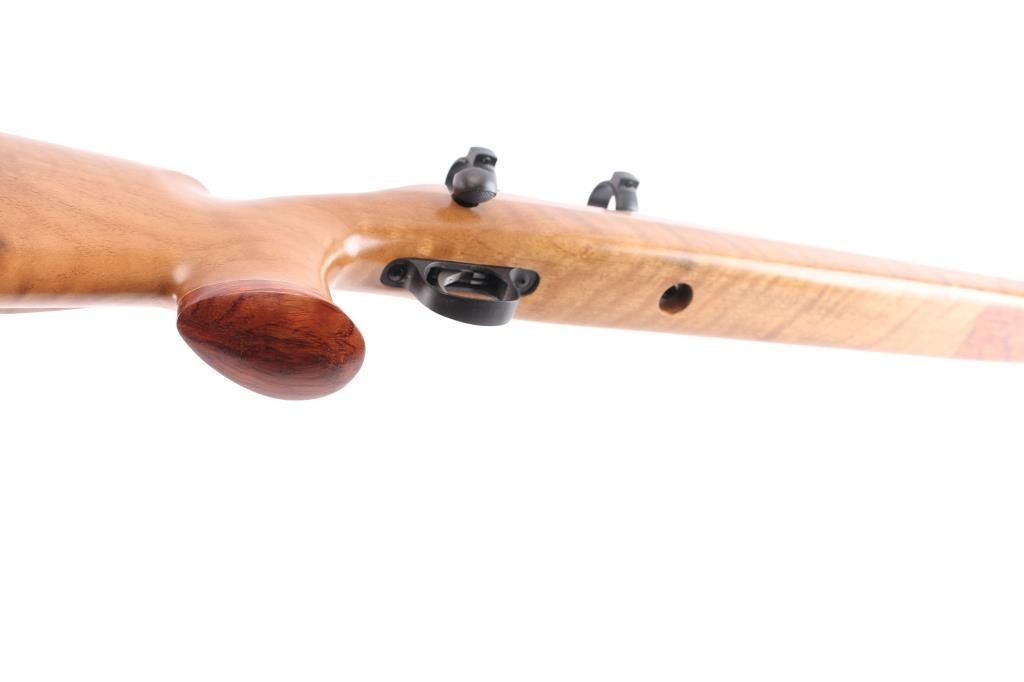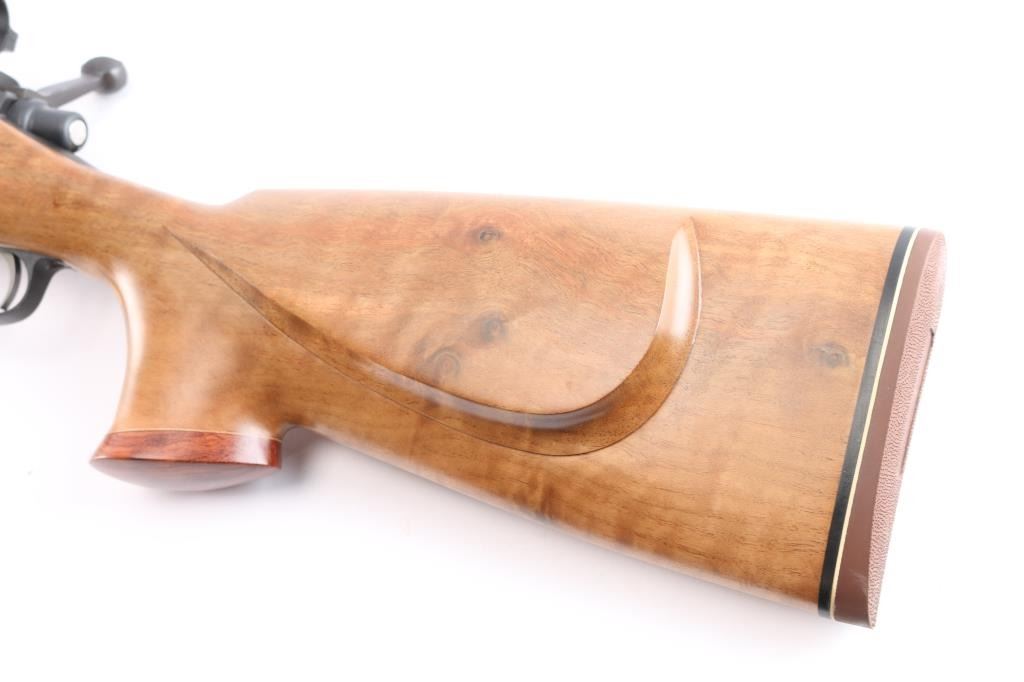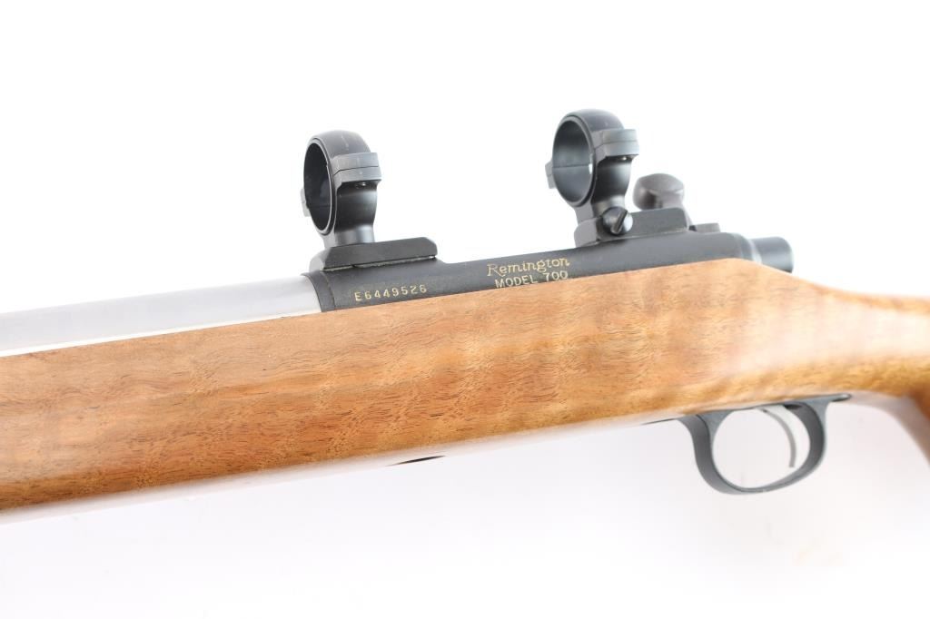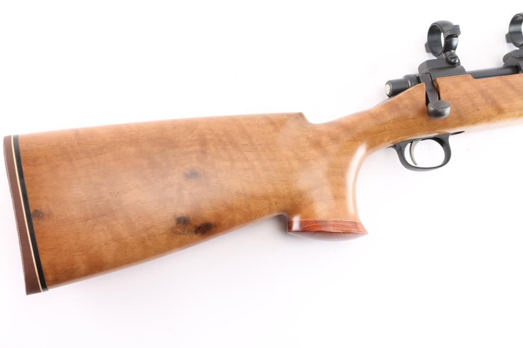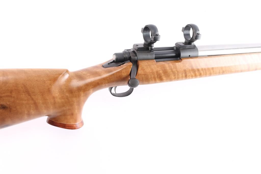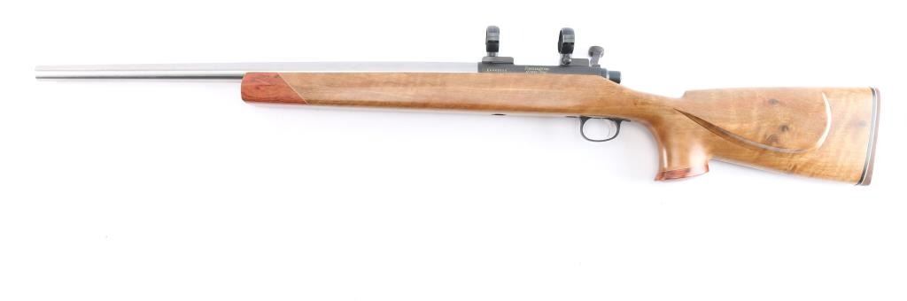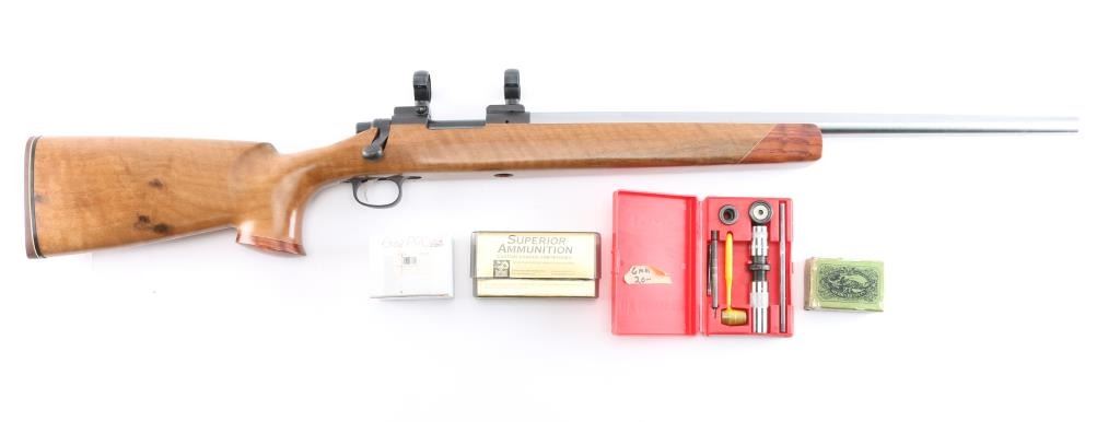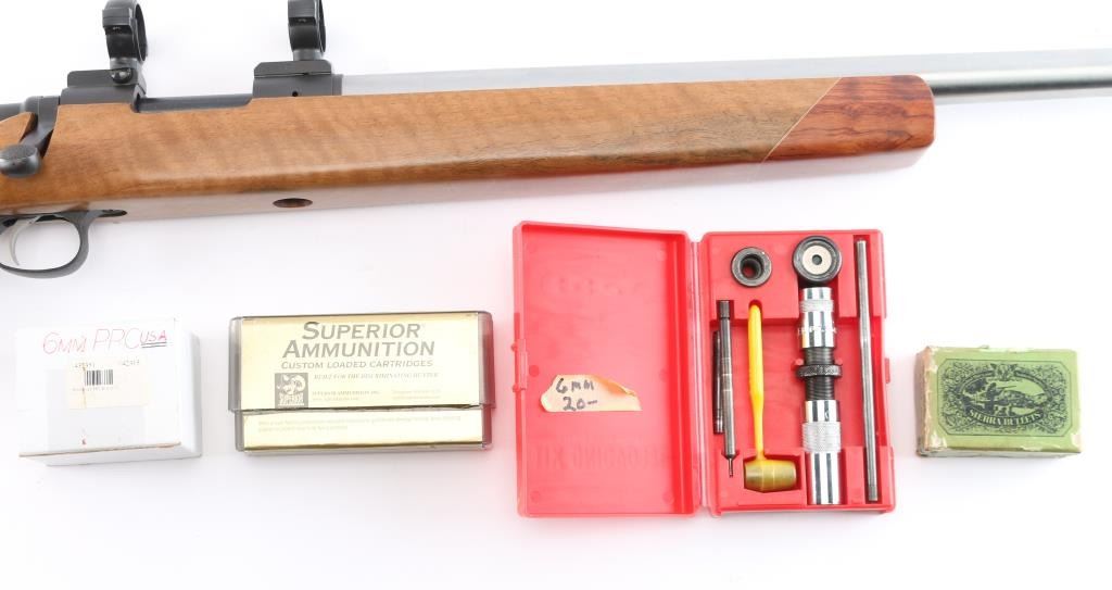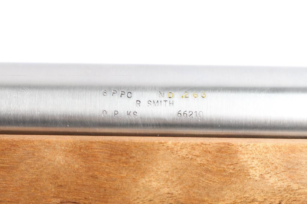 Custom single-shot benchrest target rifle built on a Remington 700 action, chambered in 6mm PPC. The 6mm PPC (Palmisano & Pindell Cartridge) is widely regarded as the most accurate 100-200 yard benchrest cartridge ever developed. Barrel marked with caliber & "R. Smith O.P. KS 66210" signifies that the barrel was custom-made by gunsmith Ron Smith based in Overland Park (O.P.), Kansas (KS), using the zip code 66210. 24" heavy stainless steel barrel, no provisions for sights, matte black receiver & triggerguard. Safety removed, converted to single-shot. The Jewell adjustable trigger has a very light pull. Nice blonde wood benchrest stock with contrasting grip cap & forearm tip, shadow line cheek rest for right-handed shooting. Optics ready with two piece Redfield scope bases/rings installed on the receiver. The bore is pristine, finishes are excellent and the wood is overall excellent with some minor chips around the upper tang. Comes with Lee 6MM PPC reloading kit, a box of twenty Norma cased various target loads, box of twenty brass Norma cases and a box of 100 Sierra .243, 60 gr. hollow point bullets.