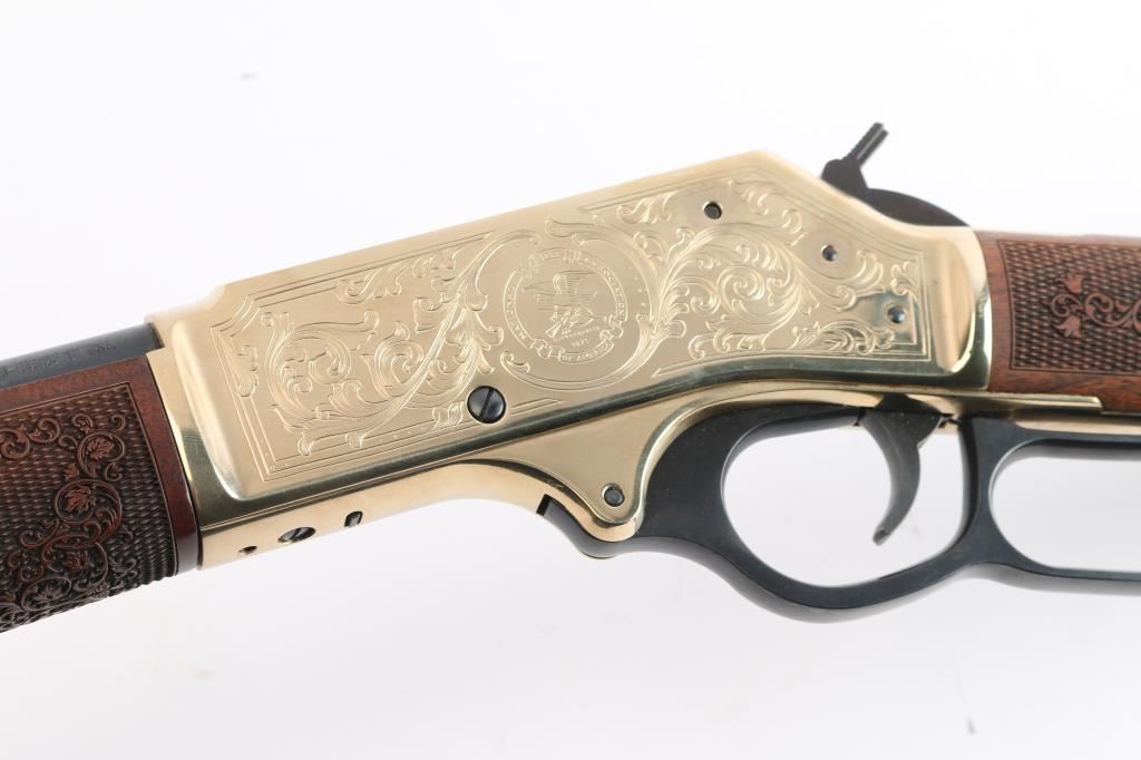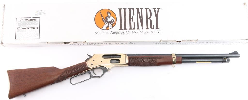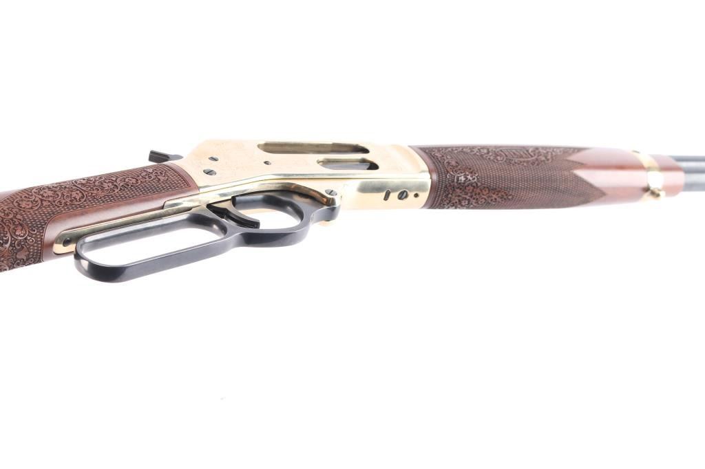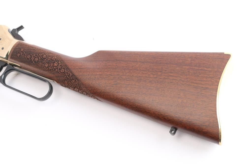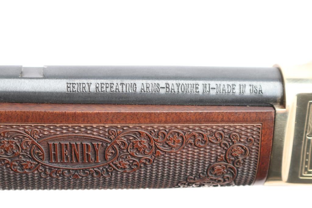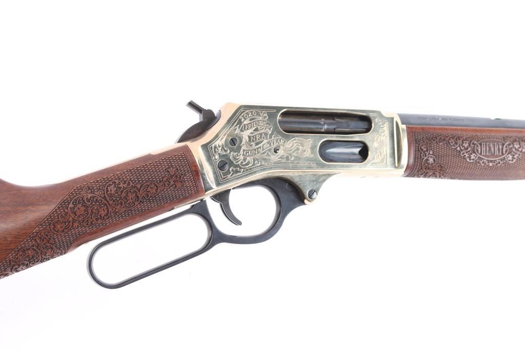 #2020nra0817 American made side gate lever action rifle chambered for .45-70 Government, and manufactured in Bayonne, NJ. Rifle features a blued and polished brass finish, 20" round barrel, blade front sight with white bead, dovetailed for a rear sight, receiver drilled and tapped for optic mounting, smooth curved trigger, removable tube magazine and a side loading gate, brass barrel band with a sling stud, external hammer with a serrated spur, knurled magazine button, and medium sized lever handle. The American walnut furniture consists of a straight grip shoulder stock with checkering and floral scrolls at the wrist, a forend with checkering and floral scrolls (Henry insignia is centered in the floral scrolls), sling stud on the bottom of the shoulder stock, and a smooth brass butt plate. A hardened brass receiver displays limited coverage of floral scrolls with edge designs. Both sides of the receiver have NRA commemorative markings with the left side having NRA's logo, and the right side is marked '2020 FRIENDS of NRA GUN of the YEAR.' The original blued finish retained is approximately 99% with superficial blemishes. Metal displays no rust or deformation. The brass finish on the top of the receiver has some residue left behind from mounting optics, and the residue can be removed. Bore is bright with strong rifling, and the action works well. The walnut furniture is excellent with very minor handling marks. Rifle includes the original factory cardboard box with end label, and a set of aluminum 1" rings.