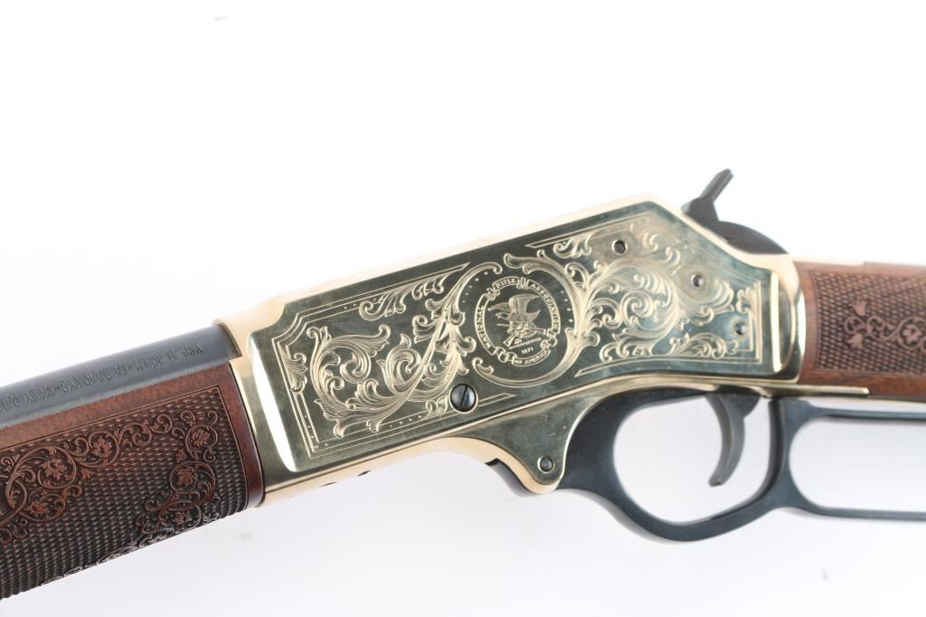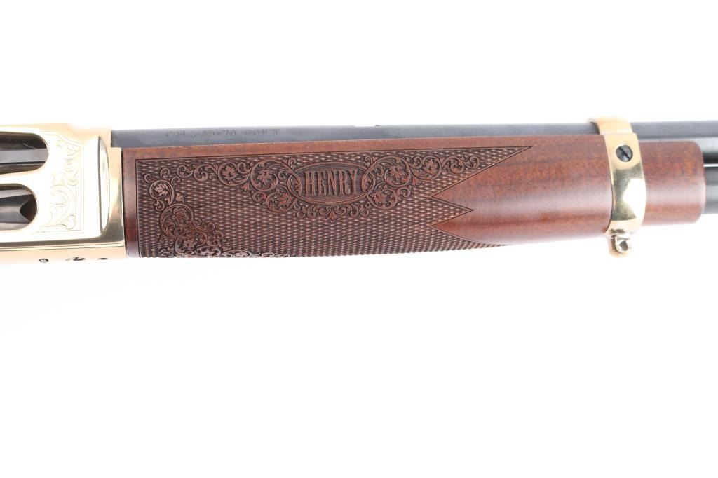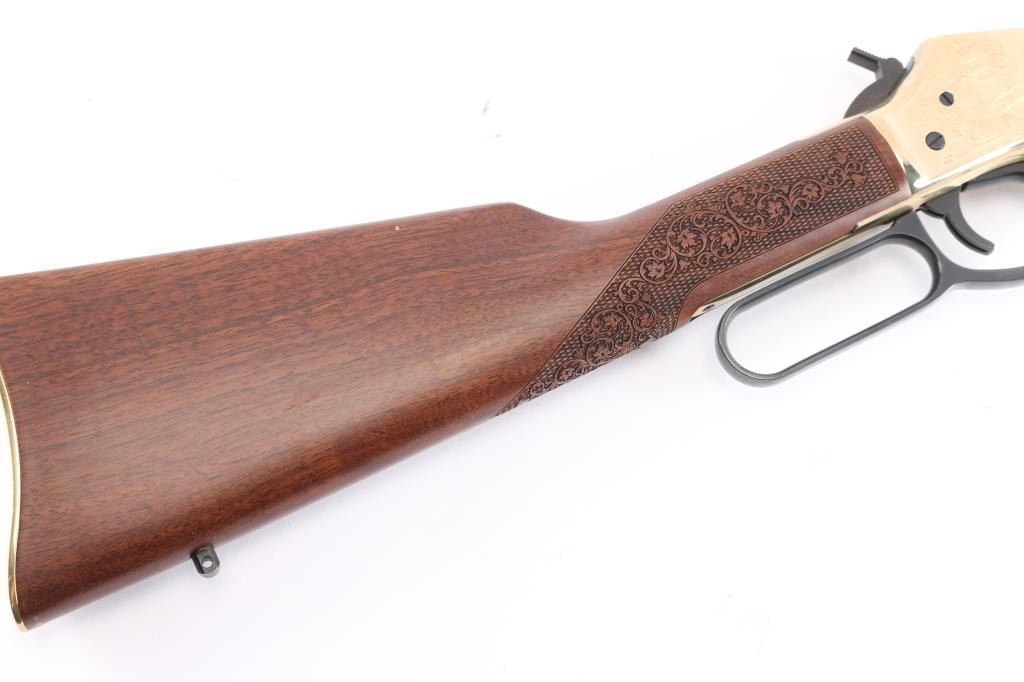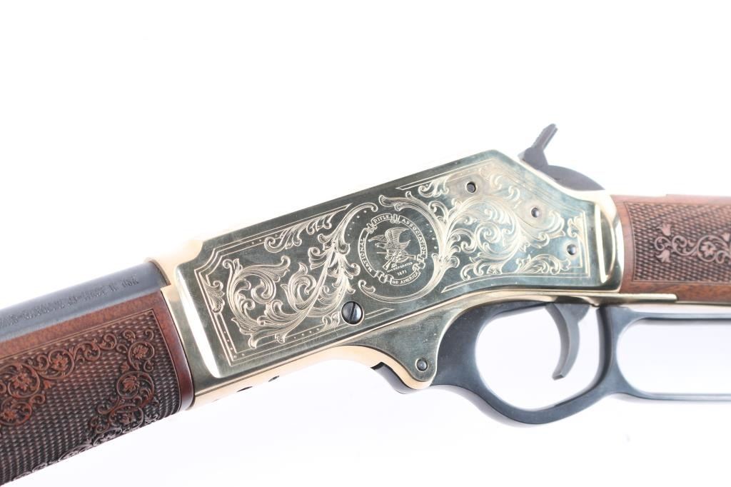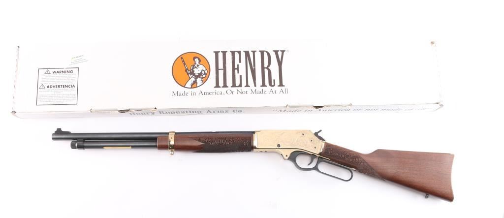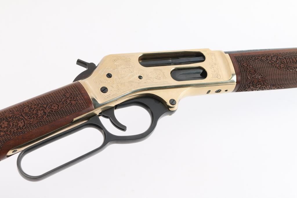#2020nra0817 American made side gate lever action rifle chambered for .45-70 Government, and manufactured in Bayonne, NJ. Rifle features a blued and polished brass finish, 20" round barrel, blade front sight with white bead, dovetailed for a rear sight, receiver drilled and tapped for optic mounting, smooth curved trigger, removable tube magazine and a side loading gate, brass barrel band with a sling stud, external hammer with a serrated spur, knurled magazine button, and medium sized lever handle. The American walnut furniture consists of a straight grip shoulder stock with checkering and floral scrolls at the wrist, a forend with checkering and floral scrolls (Henry insignia is centered in the floral scrolls), sling stud on the bottom of the shoulder stock, and a smooth brass butt plate. A hardened brass receiver displays limited coverage of floral scrolls with edge designs. Both sides of the receiver have NRA commemorative markings with the left side having NRA's logo, and the right side is marked '2020 FRIENDS of NRA GUN of the YEAR.' The original blued finish retained is approximately 99% with superficial blemishes. Metal displays no rust or deformation. The brass finish on the top of the receiver has some residue left behind from mounting optics, and the residue can be removed. Bore is bright with strong rifling, and the action works well. The walnut furniture is excellent with very minor handling marks. Rifle includes the original factory cardboard box with end label, and a set of aluminum 1" rings.