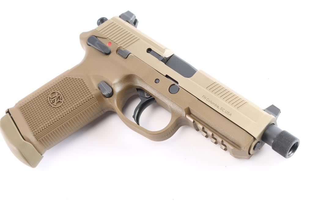 American made high capacity double/single action semi-automatic full-size pistol chambered in .45 Auto. Manufactured in Columbia, SC. It features a Flat Dark Earth (FDE) finished stainless steel slide with front and rear cocking serrations, a matte black finished stainless steel 5.3" cold hammer forged threaded barrel, knurled thread protector, dovetailed Trijicon three-dot suppressor height night sights, full-length steel guide rod, smooth curved polymer trigger, skeletonized hammer with serrated round hammer spur, ambidextrous thumb safety/decocker on the frame, serrated ambidextrous slide stop, ambidextrous push-button magazine release, factory 15 round magazine, FDE polymer frame with integral accessory rail on dust cover, and checkered grip with interchangeable backstraps. The original FDE finish has approximately 99% remaining showing nothing remarkable. The action is smooth and crisp, and the bore is bright with strong rifling. The polymer is in excellent condition. Includes a factory fitted Cordura nylon case, manual, lock, three fifteen-round magazines total, three additional backstraps, and a sight mounting kit.