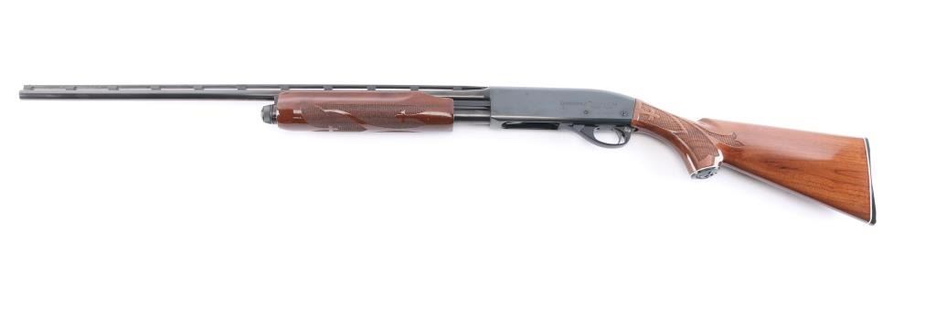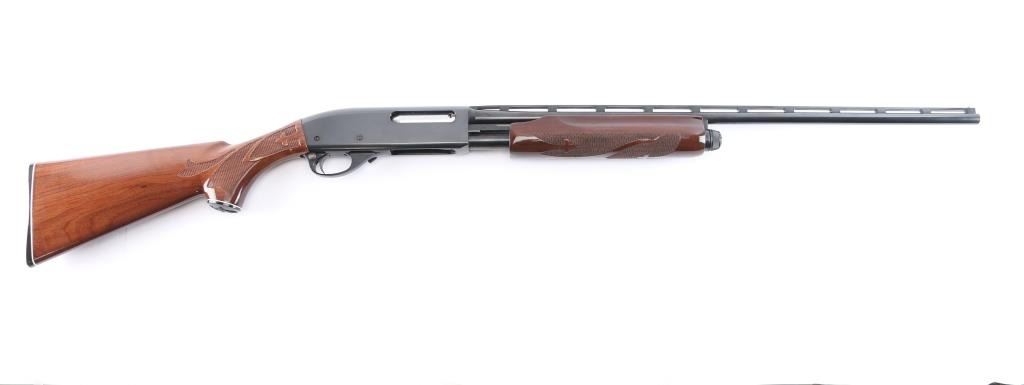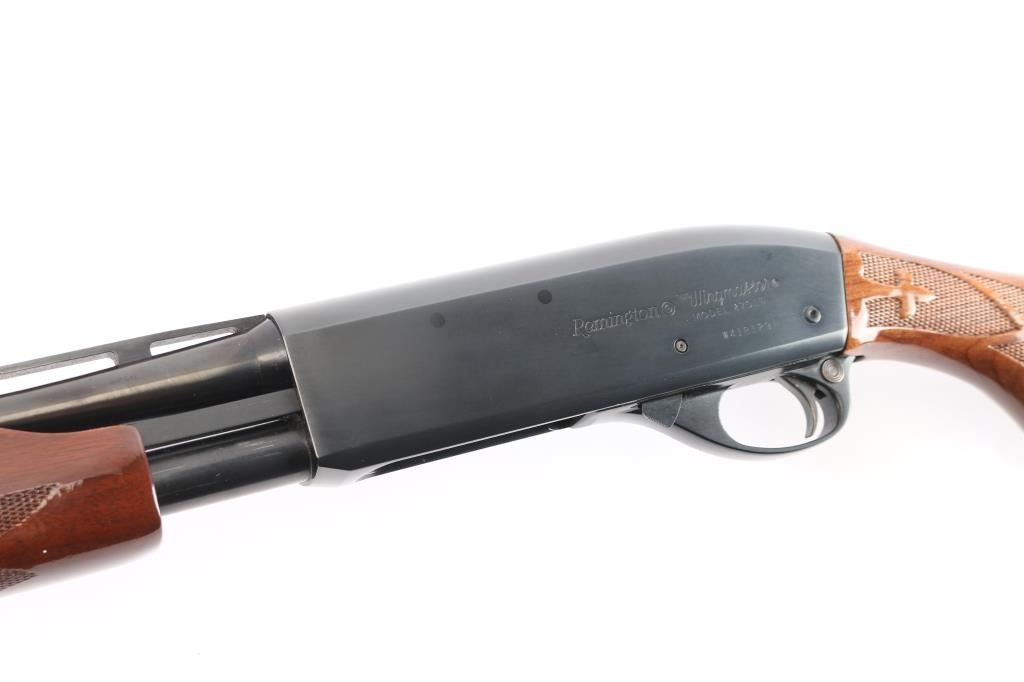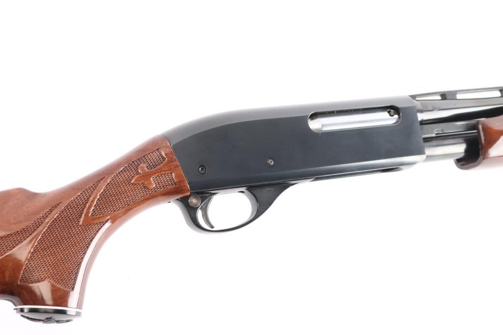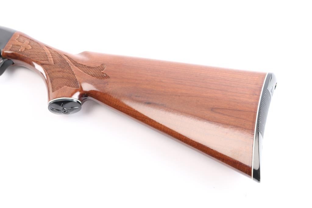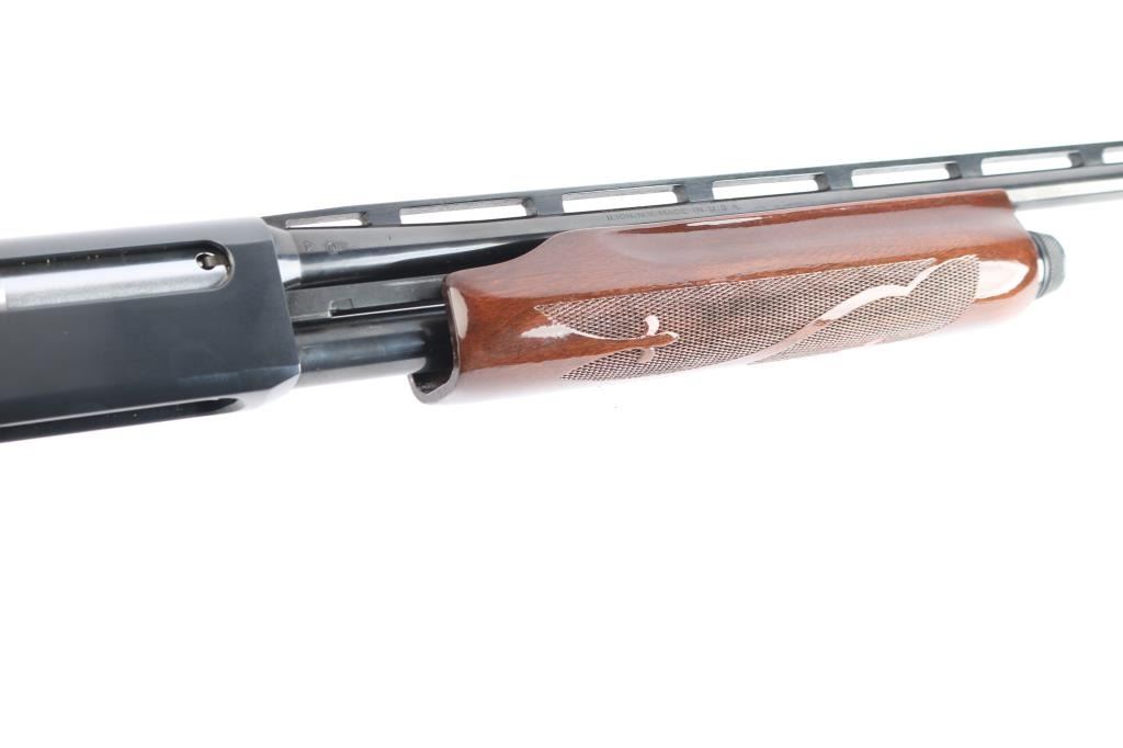 American made pump action shotgun chambered for .410 Gauge, manufactured by Remington between 1984-1990 (barrel date code is illegible) in Ilion, NY. Featuring a blued approximately 25" raised vent rib barrel, chambered for 3" shells, bore measures 'IC' with a drop-in gauge (also marked on barrel), steel bead front sight, smooth curved trigger, push button safety, 14" length-of-pull, and dual action bars. The high gloss hardwood furniture consists of a checkered pump handle, semi-pistol grip shoulder stock with checkering at the wrist, black plastic grip cap with an embossed duck and a white spacer, and a black factory plastic serrated buttplate. Bore condition is smooth, bright, but looks dirty. The action is smooth and crisp. The blued finish remaining is approximately 98% with only superficial blemishes. Wood furniture is excellent with little remarkable to speak of. The metal condition is also excellent with no rust, pitting, or deformation.