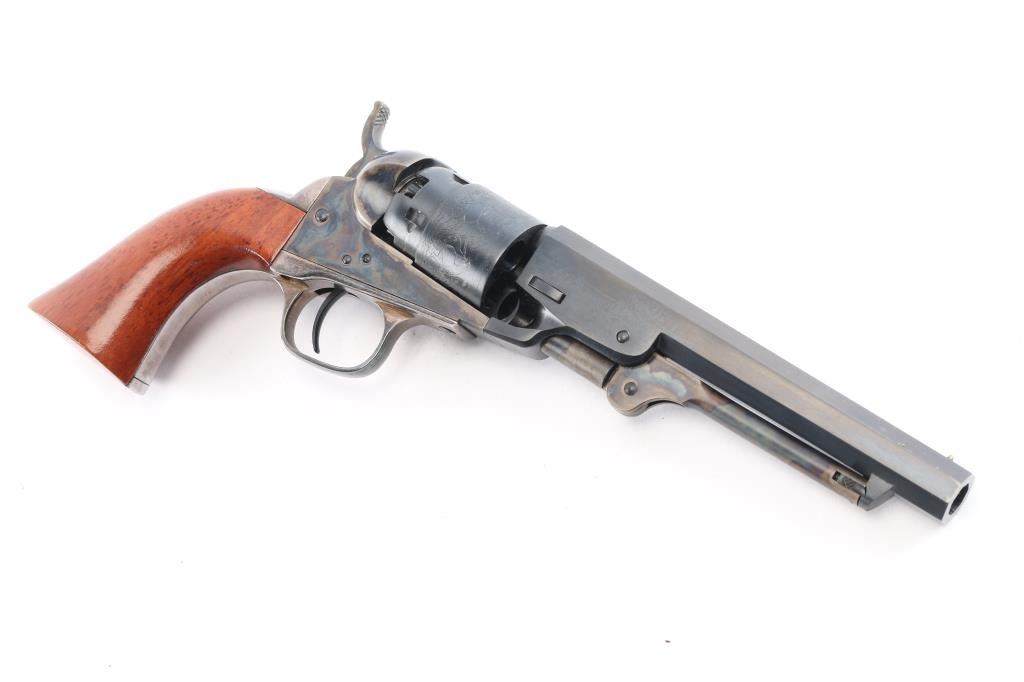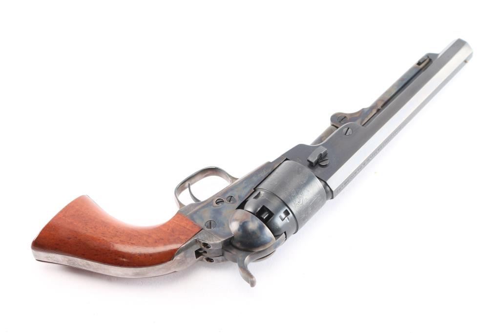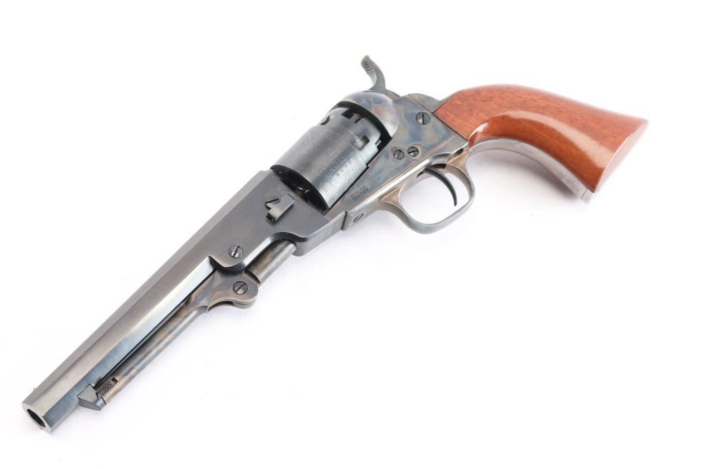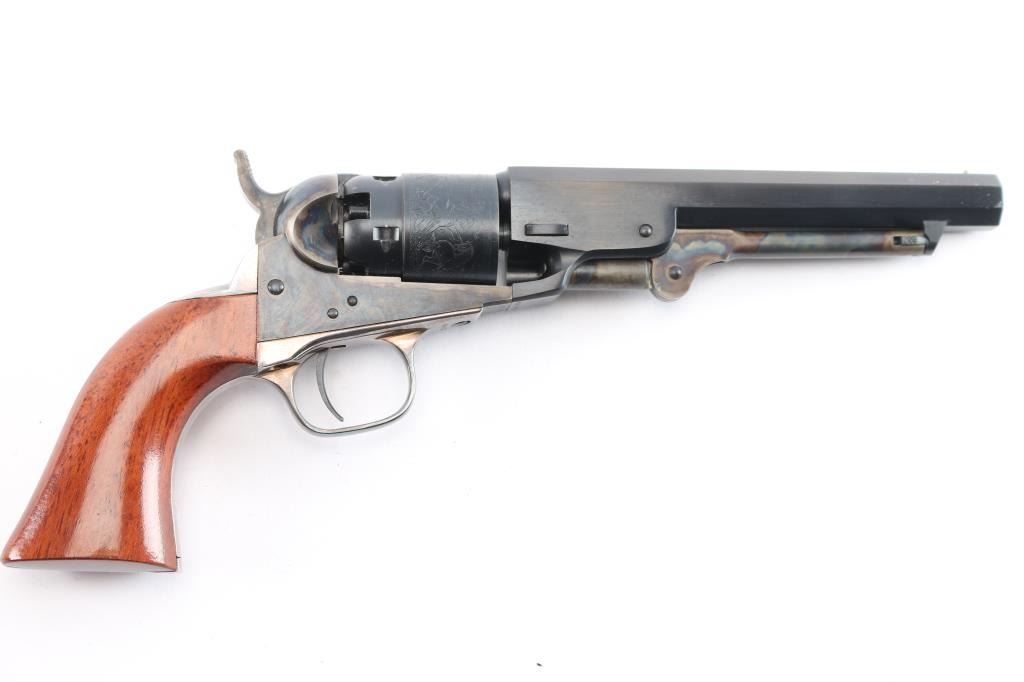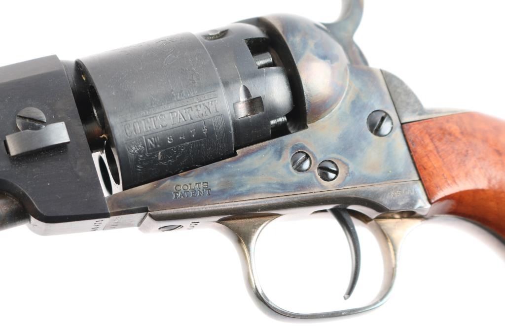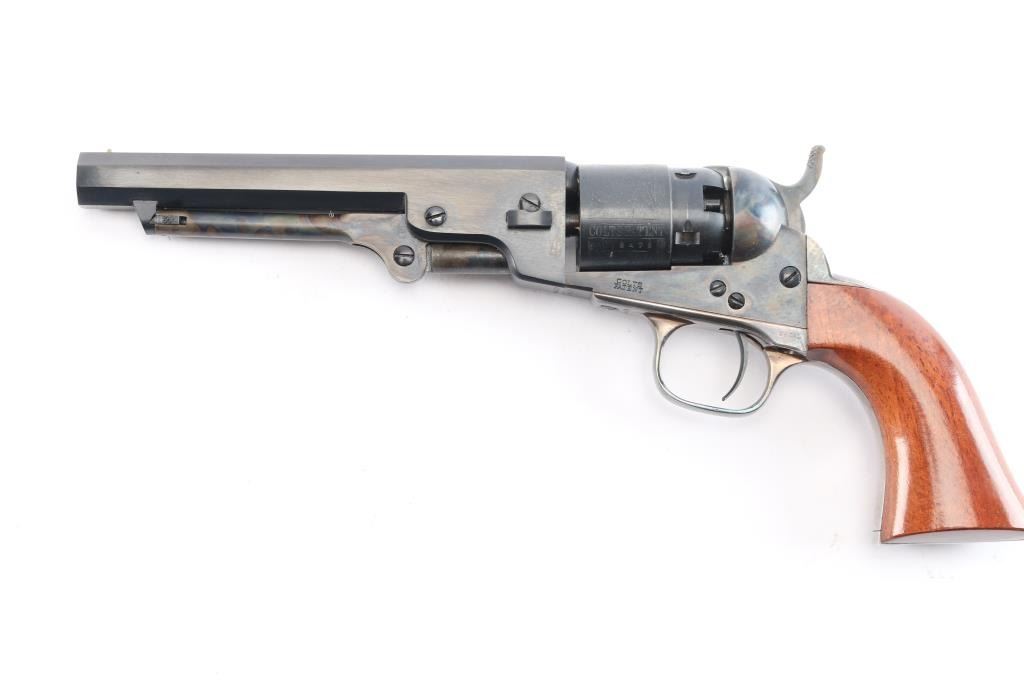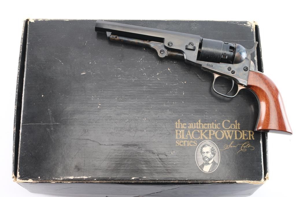 'The Authentic Colt Black Powder Series' 2nd generation reproduction of the Colt 1862 Pocket Navy. A single action percussion revolver chambered for .36 caliber ammunition, and manufactured circa 1979-1984. It features a 5.5" octagonal barrel, brass cone front sight, 'V' notched rear sight cut in the hammer nose, smooth curved thin trigger, checkered hammer spur, and an unfluted five shot rebated cylinder with a roll stamped stage coach hold-up scene. The backstrap & triggerguard have a silver plated finish, and are in excellent condition. The frame, hammer, and loading lever are color-case hardened and in excellent condition. The barrel, trigger, and cylinder have a blued finish and retains approximately 99% of that finish. It is fitted with a one-piece varnished walnut grip, and is in excellent condition. The bore, rifling and cylinder are in excellent condition. Revolver is in like new condition. The action works properly but needs to be cleaned because it has hardened oil residue keeping things from moving smoothly. This firearm includes the original factory black cardboard with foam inserts, and its documents.