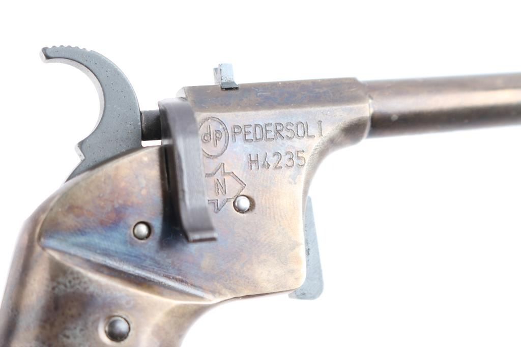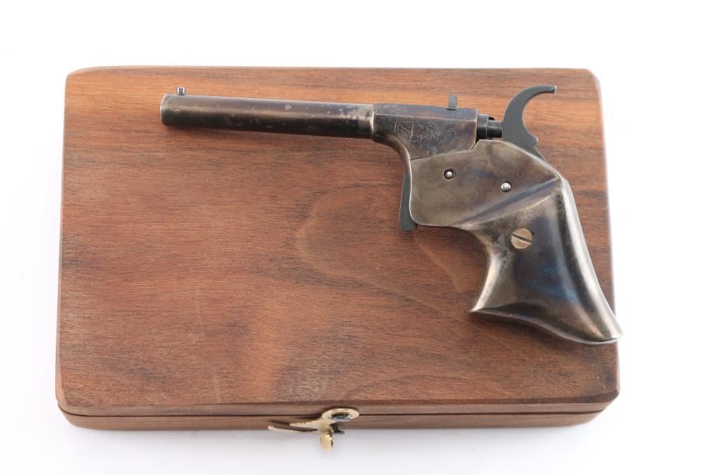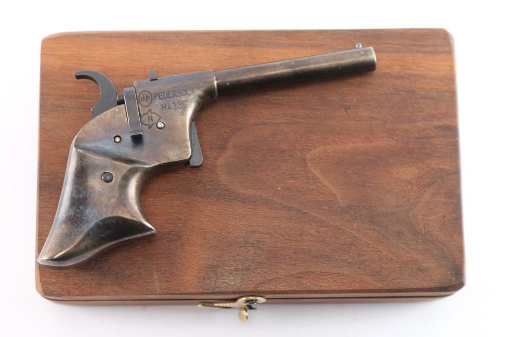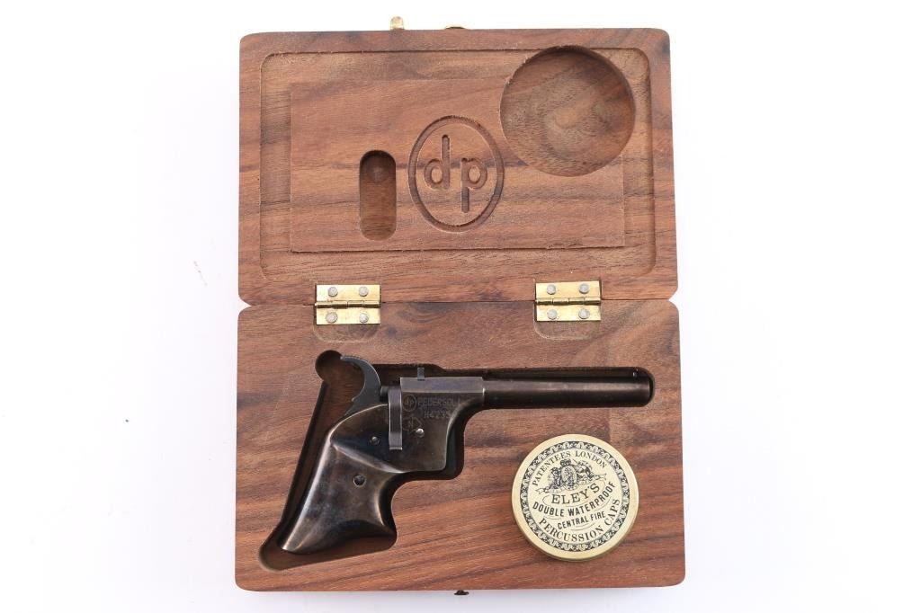 Pedersoli marked .17 cal percussion "vest pocket" Derringer in wood case. Copied from mid-19th Century Remington of this style. 4 1/2" overall with removable nipple acting as breech. Metal grips with case hardened finish overall. Near fine condition. No evidence of firing.