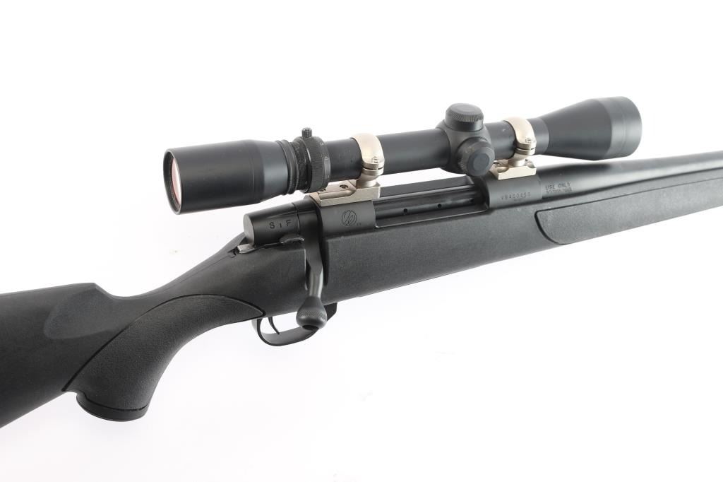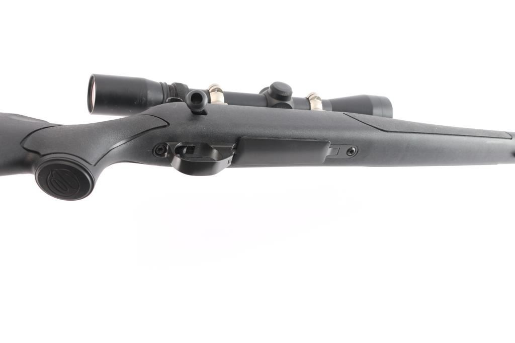 Quality SUB MOA bolt action rifle made in Japan by Howa, chambered for .300 Winchester Magnum. Features matte bead blasted blued finish, 24" threaded barrel, no provisions for sights, stainless steel two piece bases & rings, manual 3-Position Safety: Rear (safe, bolt locked), Middle (safe, bolt unlocked/operable for loading/unloading), Forward (fire) thumb safety, hinged floorplate, serrated trigger, sling studs, swept back bolt handle, solid rubber factory recoil pad. Black Monte Carlo Griptonite stock with checkered panels at wrist & forearm, cheek rest . Mounts a very good condition Burris 3X-9X scope with duplex reticle, clear view. Bore is excellent/bright. Retains 99% finish, action is smooth and the stock is excellent.