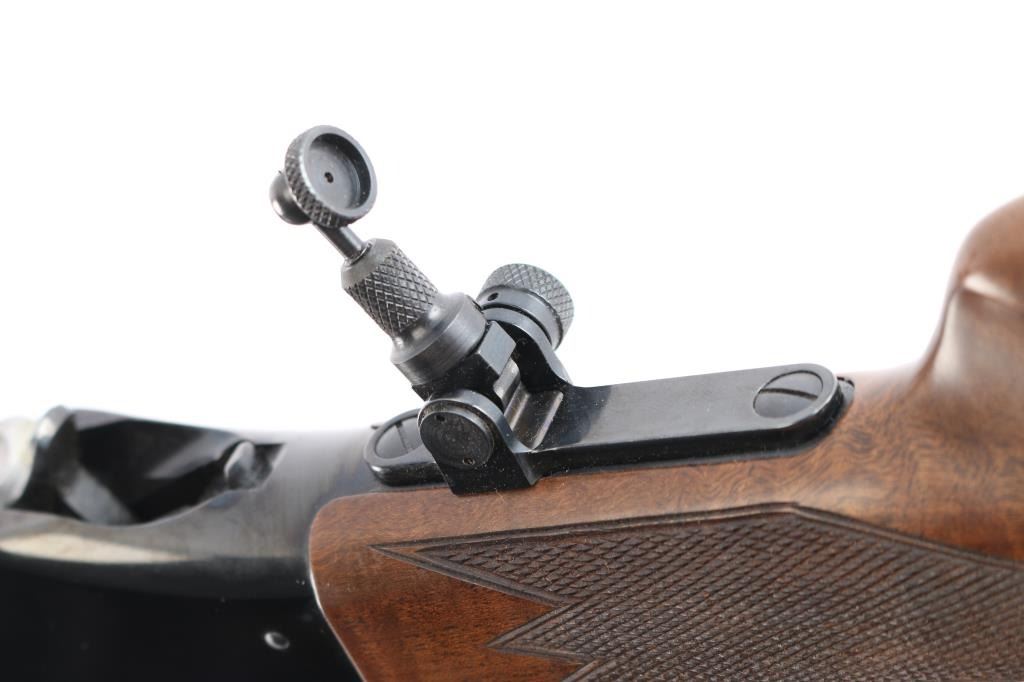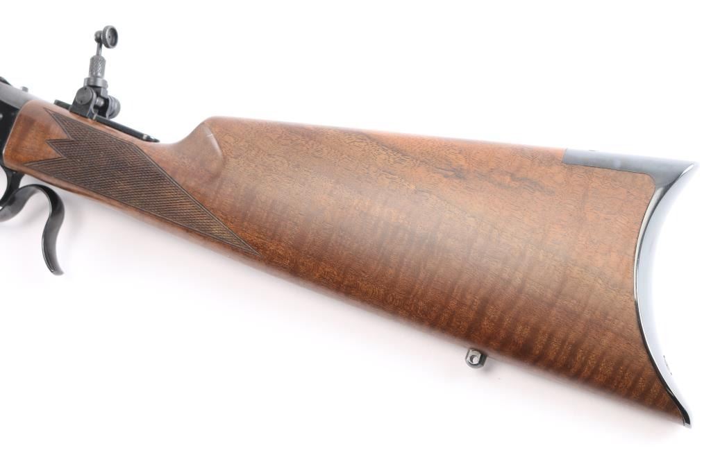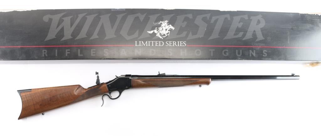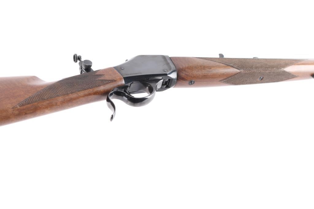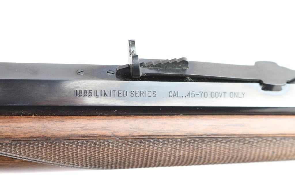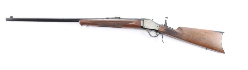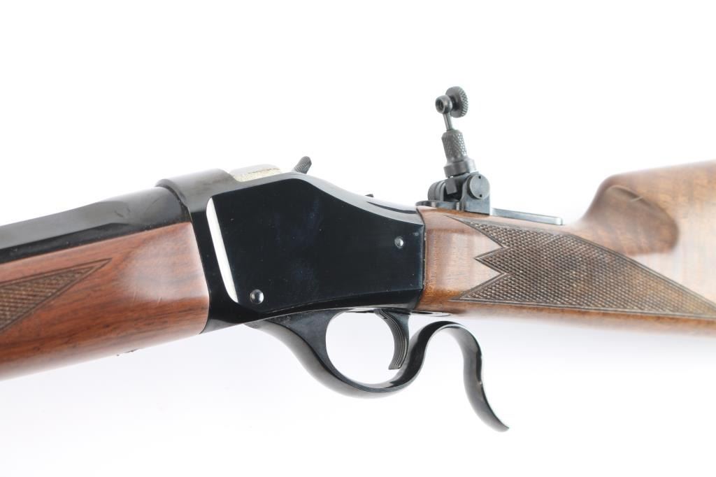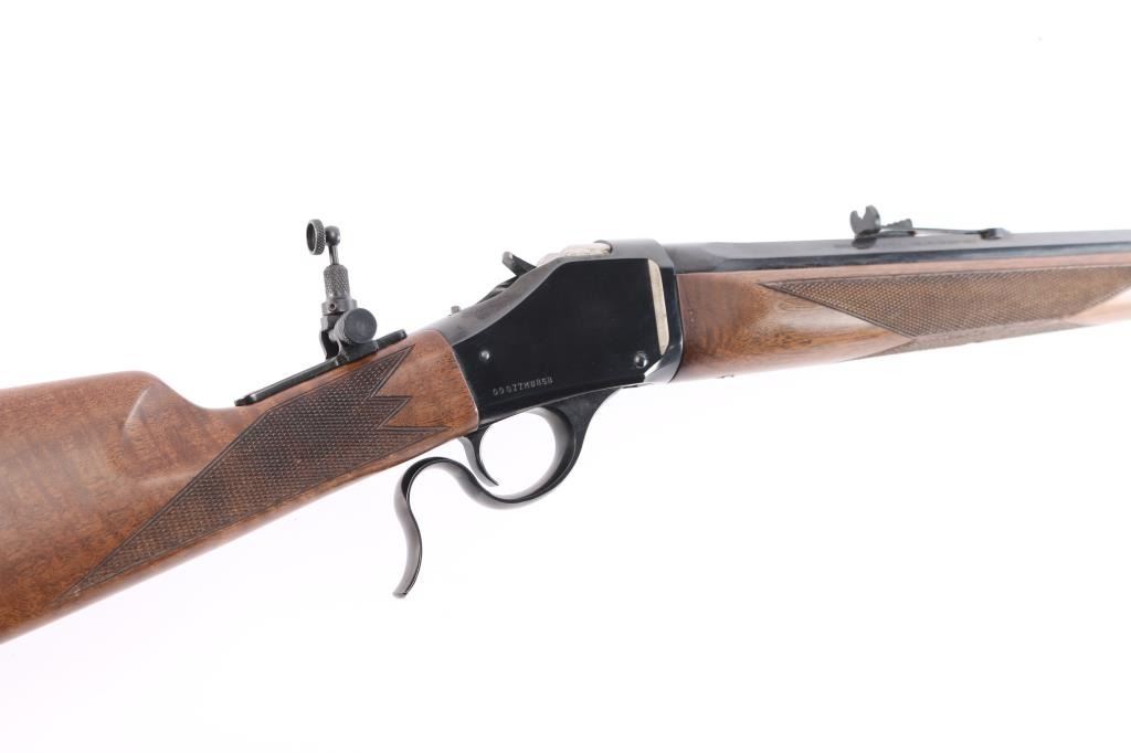 .45-70 Gov't. SN: 00077MW85B. Quality single-shot rifle manufactured in Japan by Miroku, imported by US Repeating Arms, New Haven CT. "High Wall". Features lever action falling block action, 28" octagon heavy barrel, blade/bead front sight, semi-buckhorn sporting rear sight, tang mounted folding, adjustable peep sight, high polish blued finish, walnut forend with schnabel tip, straight grip buttstock with finely checkered panels at the wrist & forearm, crescent buttplate, sling studs . Bore is excellent/bright, action is smooth, blue is and wood are excellent. Action is smooth. Comes in original factory box with manual.