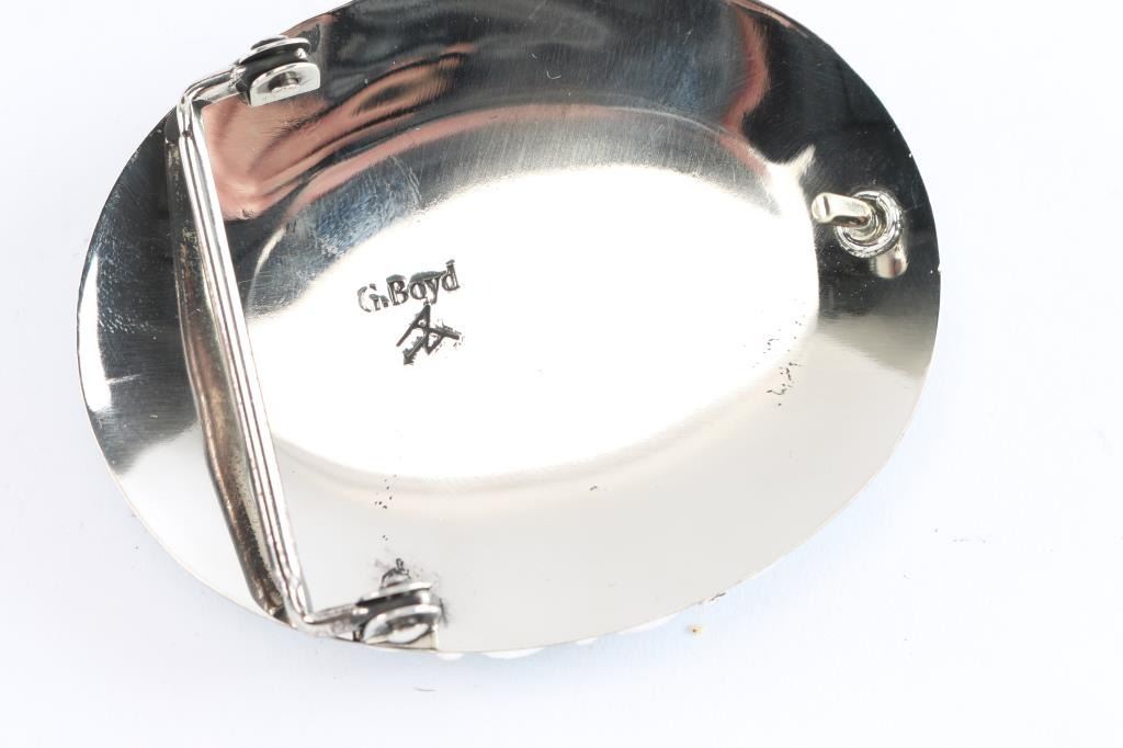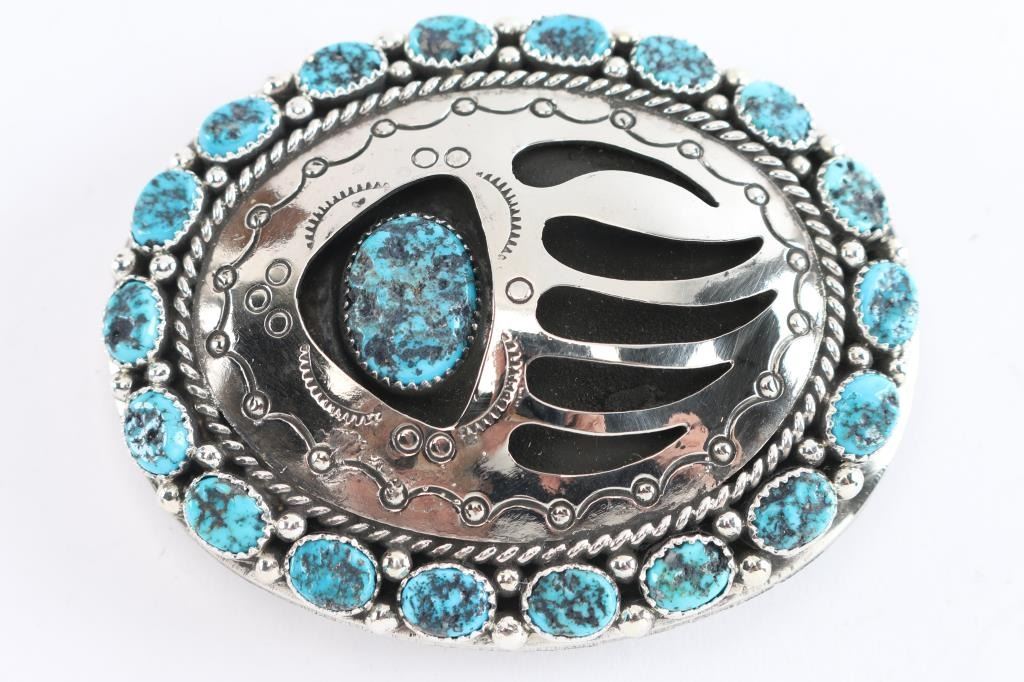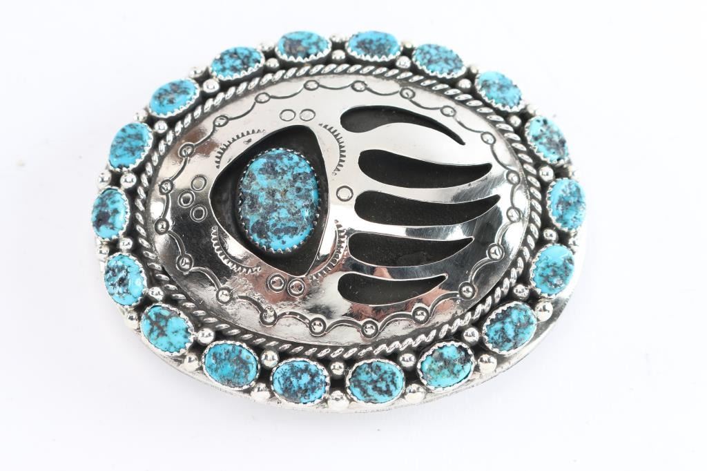 With center bear paw print design surrounded by oval cut turquoise stones. Set in sterling silver, maker marked G. Boyd. Measures 4" x 3.5".