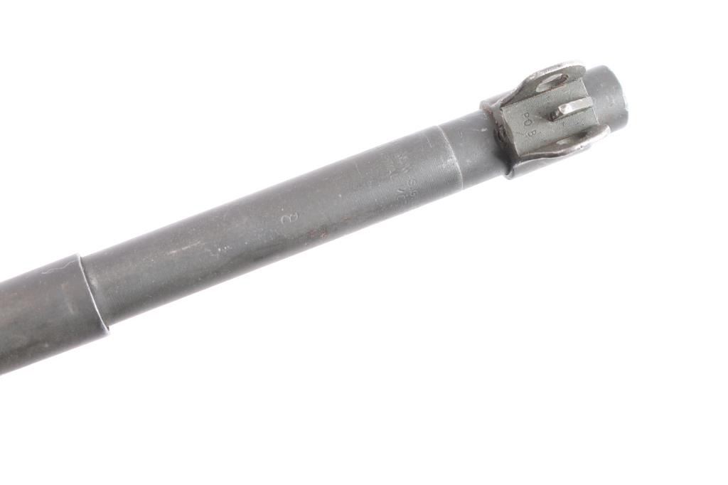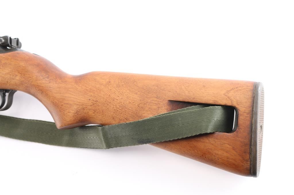 SN: 3279941. US military semiautomatic rifle manufactured during WWII, serial number indicates manufacture 05/43-02/44, imported back into the US by Blue Sky, Arlington VA. Metal parts show original gray parkerized wartime finish. Features 18" barrel, protected blade front sight,marked "PO B" (Prestole Division of Detroit Harvester Co.), type 3 stamped adjustable rear peep sight with range slide, type III barrel band with bayonet lug marked "KI" (Inland) smooth low wood, "I" cut birch stock with 4 rivet handguard, checkered steel buttplate, round top bolt, later type IV rotary safety, type IV mag catch marked with underlined "M", later style stamped trigger housing. . Barrel is marked "Saginaw SG Div. General Motors" with ordnance flaming bomb under it., importer stamp on left side near front sight. Retains 85% coverage of finish, with edge losses & handling marks. The bore is excellent/bright, wood is excellent, appears to have been lightly sanded with no visible cartouches. Includes a good condition 15 rd blued magazine marked "U" (Union Hardware), later green nylon sling with correct oiler.