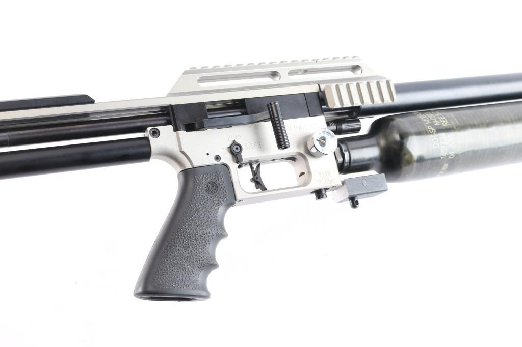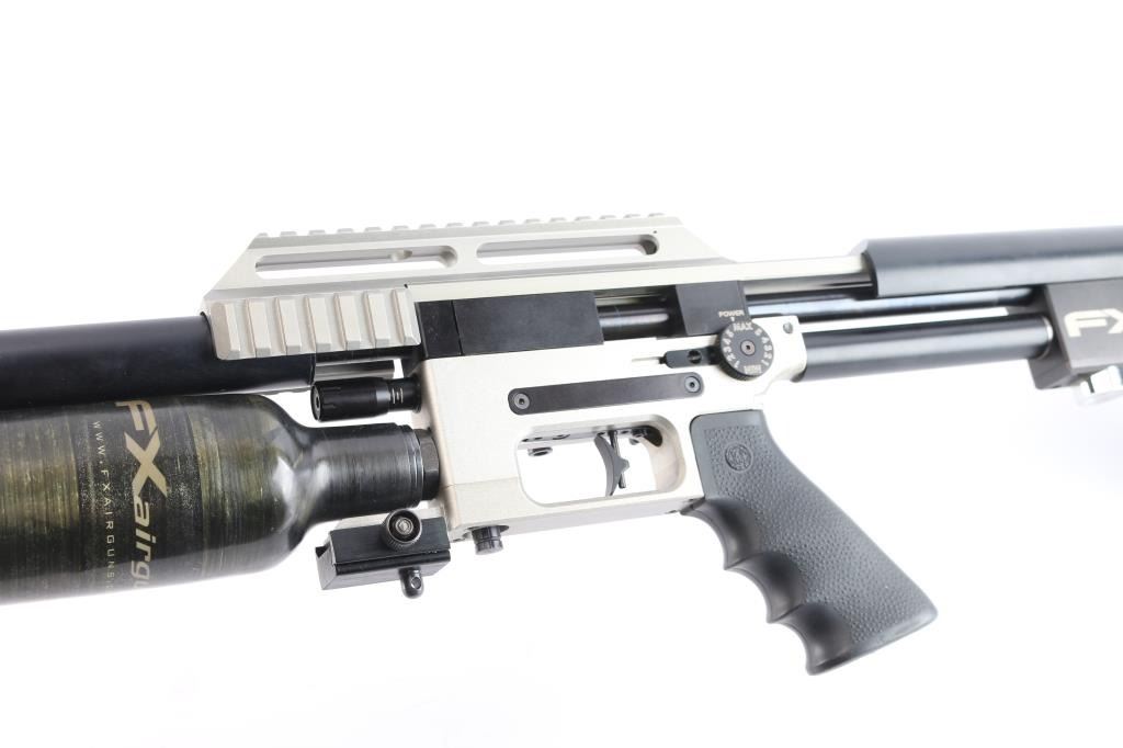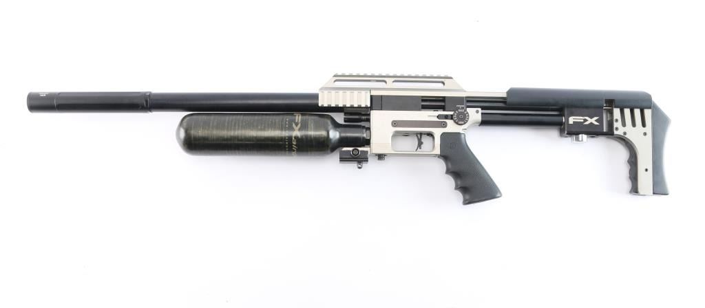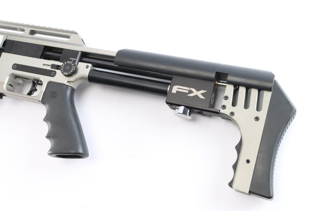 Quality Swedish manufactured FX Impact X Silver Features: Fixed stackable moderator system, FX smooth twist X barrel with DonnyFL KOI Moderator, forward positioned sidelever cocking action, Interchangeable caliber system (additional caliber barrels available) externally adjustable pressure regulator, hammerspring tension power adjuster, valve adjuster (valve flow tuning). Two pressure gauges: one for airtube pressure, one for regulator pressure, removable 480cc carbon fiber air cylinder, max fill pressure is 250 bar (3600 psi), removable rotary magazine, fully adjustable match trigger (factory set at 1 lb 11 oz), picatinney/Weaver scope rail, picatinney accessory rails on either side of the forearm and one rail beneath, Hogue rubber pistol grip, adjustable recoil pad (height), AR15 style safety switch (manual), male quick-disconnect foster fitting for fast refills. excellent, like new condition. Comes in form fitted factory hard case with manual, one magazine, spare gaskets, pins and barrel shroud.