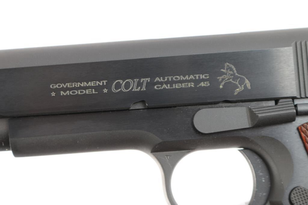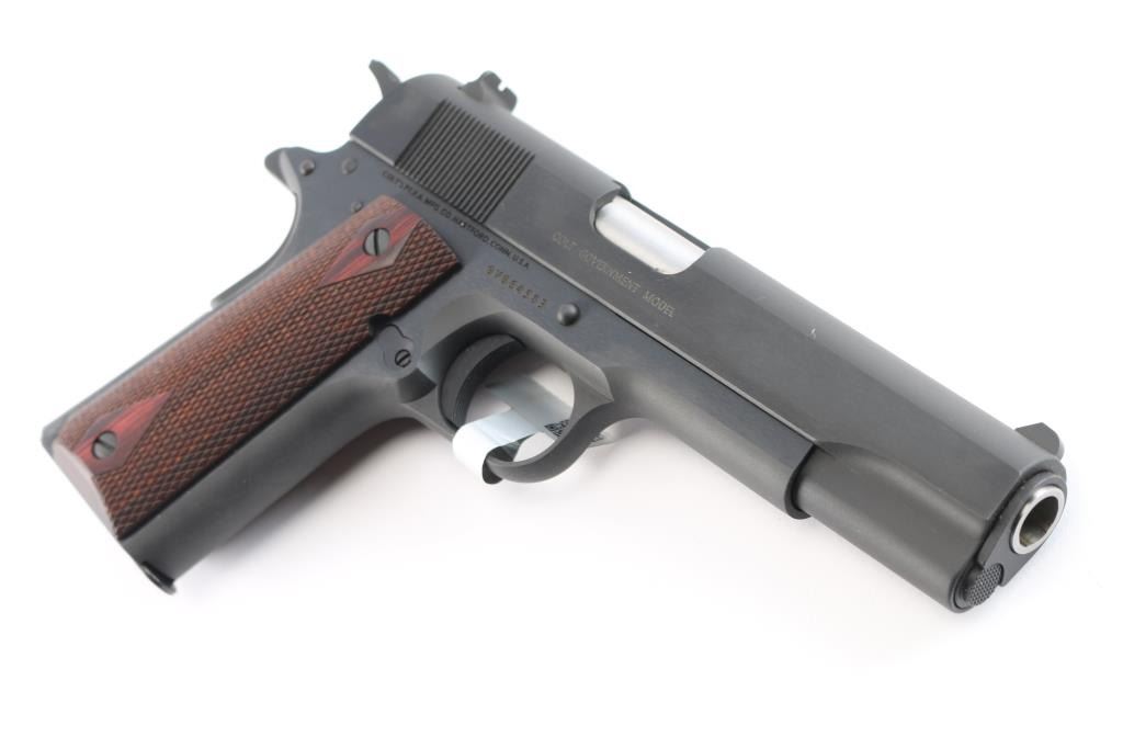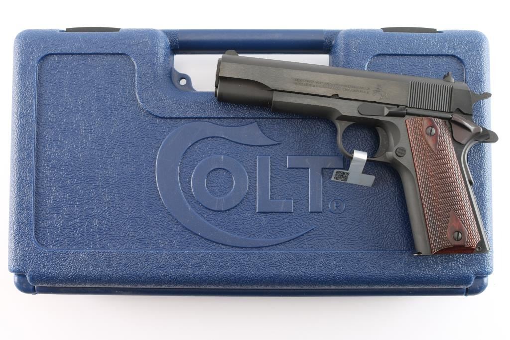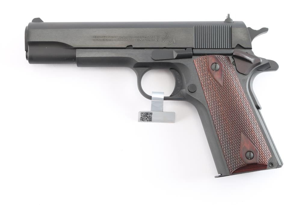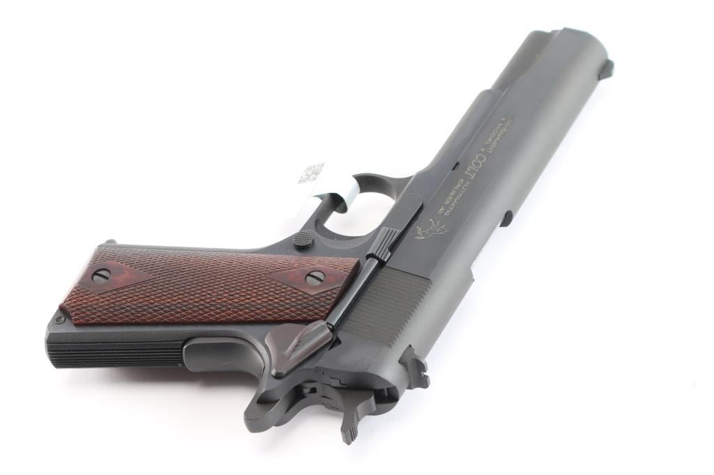 American made ‘MK IV Series 70’ single-action semi-automatic 1911 pattern pistol chambered in .45 ACP manufactured circa 2020's in Hartford, CT. It features a satin blued finish with polished flats, 5" barrel, GI type sights, serrated curved trigger, GI hammer with serrated spur, frame mounted GI thumb safety on the left side, GI grip safety, serrated flat mainspring housing, smooth front strap, checkered push button magazine release, and factory 8 round magazine. The checkered hardwood grips have diamond cuts around the screws. Pistol retains approximately 99% of its original finish showing little to no visible wear. The action is smooth and crisp. The bore is bright with strong rifling, and the wood grips are excellent. Includes the original factory blue plastic hard case with documents, one total magazine, and lock.