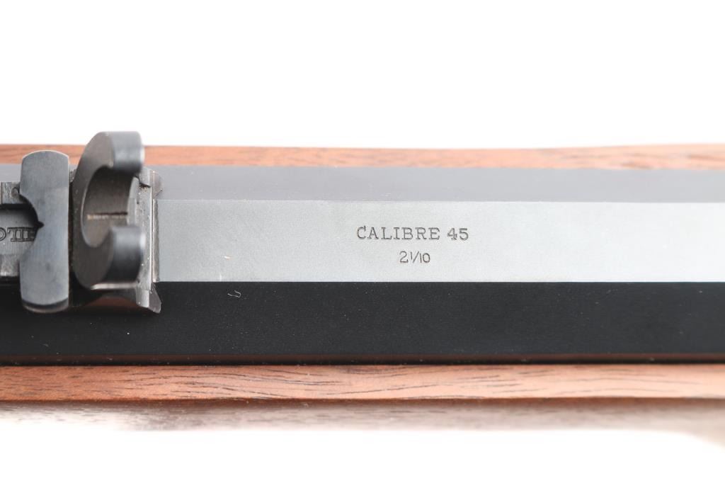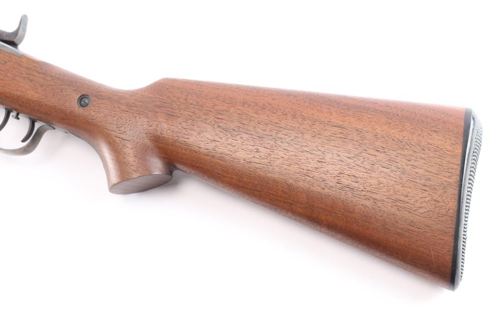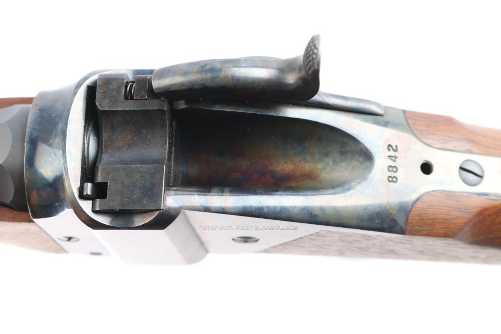 'Shiloh-Sharps' American made breech loading falling-block rifle chambered in .45-70 Government, manufactured by Shiloh Rifle Mfg. Company out of Big Timber, MT. The "Old Reliable" rifle features a matte blued heavy 26" half octagonal and half round barrel, adjustable Lawrence style flip-up rear sight, blade front sight, checkered lower tang, double-set smooth curved triggers, and checkered hammer spur. Receiver, triggerguard/lever, block, and hammer are color-case hardened, with the barrel and some sight parts blued. The walnut furniture consists of a smooth semi-pistol grip buttstock, smooth schnabel forend, and a checkered black plastic buttplate. Bore appears bright with strong rifling, and the action is smooth and crisp. Furniture wood is excellent with only superficial blemishes. The original blued finish is about 98% with a very small loss at the muzzle. The color case finish is also very good with very light scratches on the left side of the receiver.