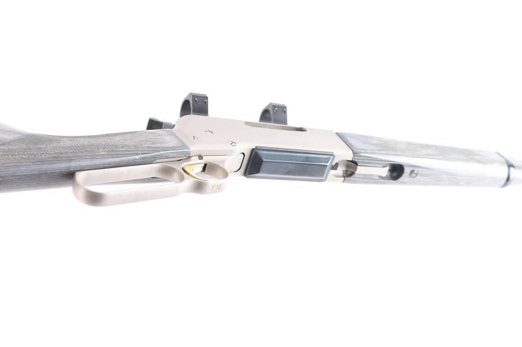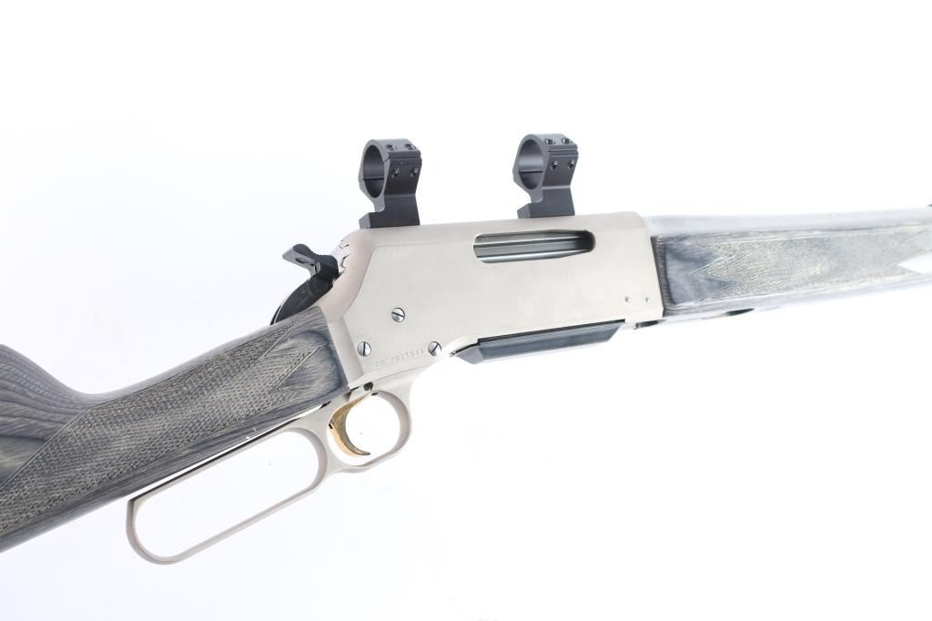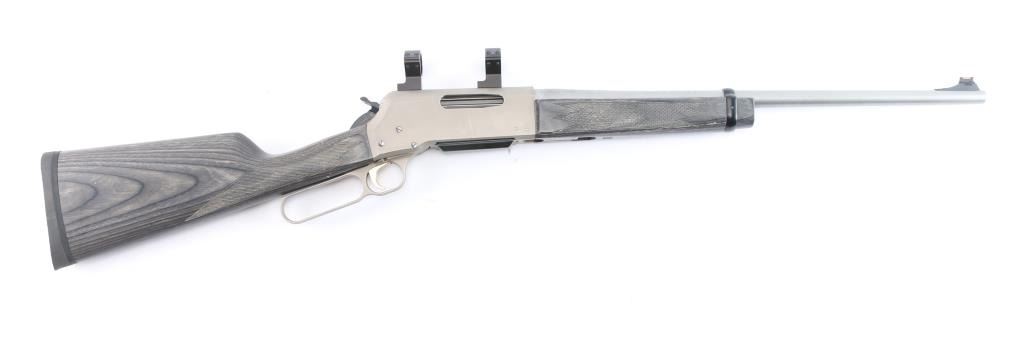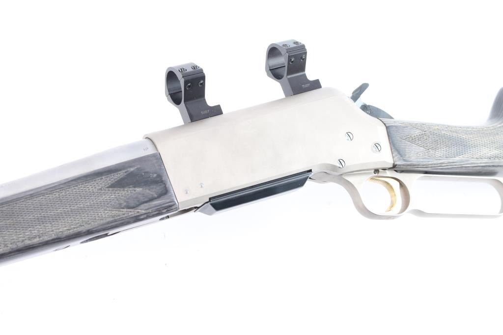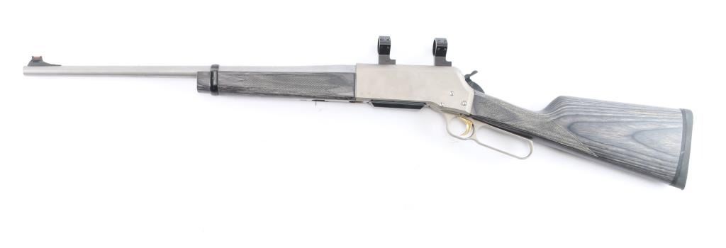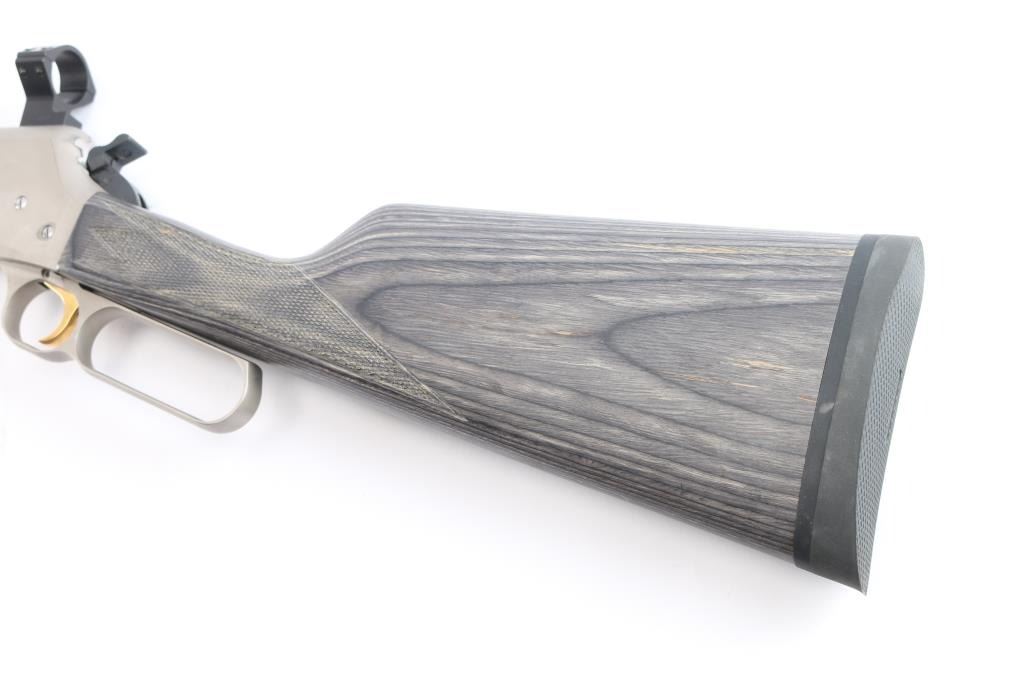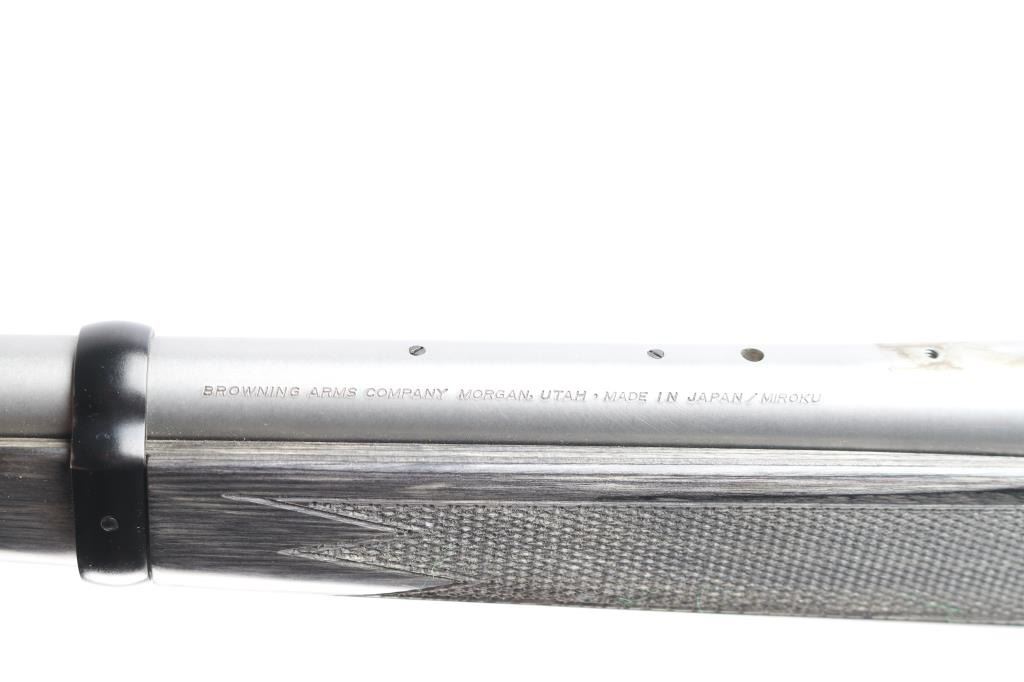 #06220zt341 Made in Japan by Miroku for Browning, this is a lever-action center fire rifle chambered for .308 Winchester, and manufactured circa 2016. Rifle features a 20" tapered stainless barrel, raised blade front sight with a red fiber optic insert, rear sight removed (included), barrel and receiver drilled and tapped for optic mounting, accepts detachable magazines, external wide folding hammer with serrated spur, gold-toned Browning "Buckmark" logo on bottom of lever, gold-toned curved serrated trigger, and medium sized lever. The two piece grey laminate wood furniture consists of a straight gripped shoulder stock with checkering at the wrist, checkered forend, satin black metal barrel band, and Browning factory checkered rubber recoil pad with black spacer. The original satin stainless finish retained is approximately 99% with only superficial scratches. The satin nickel receiver and lever finish is very good with light blemishes on the right side of the receiver and on the bottom of the lever. Metal displays no rust, or deformation. Bore is bright with strong rifling, and the action is smooth and crisp. The laminate furniture is excellent with a few small nicks on the shoulder stock by the right side of the lever, and on the left side's checkering. Rifle includes rear sight.