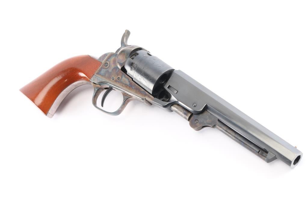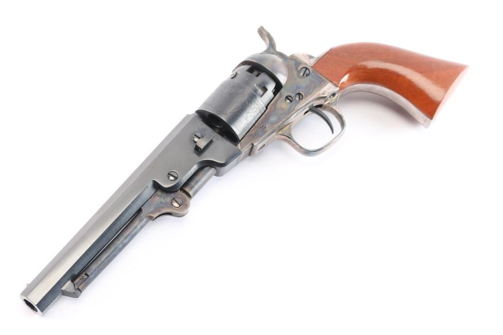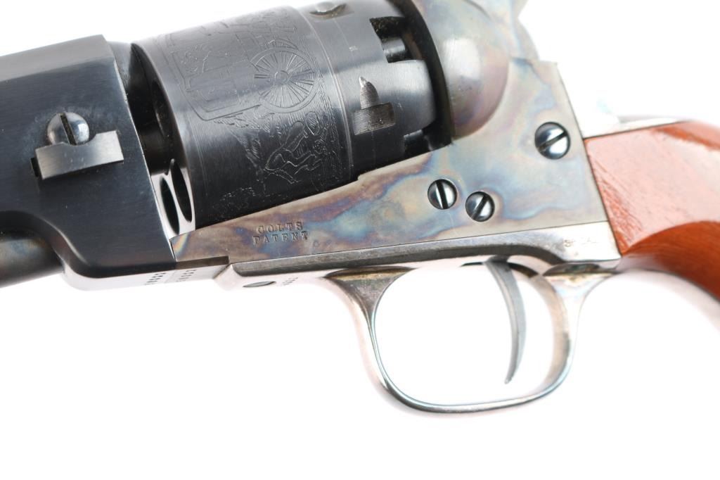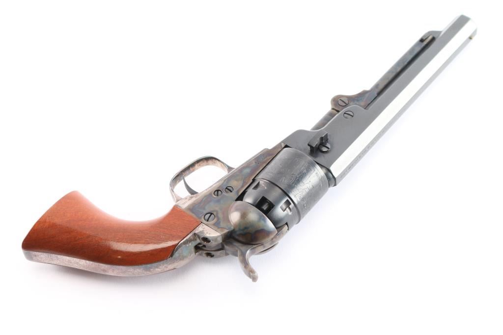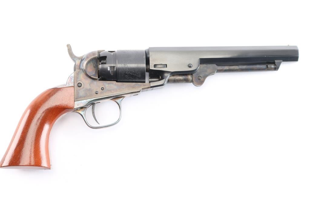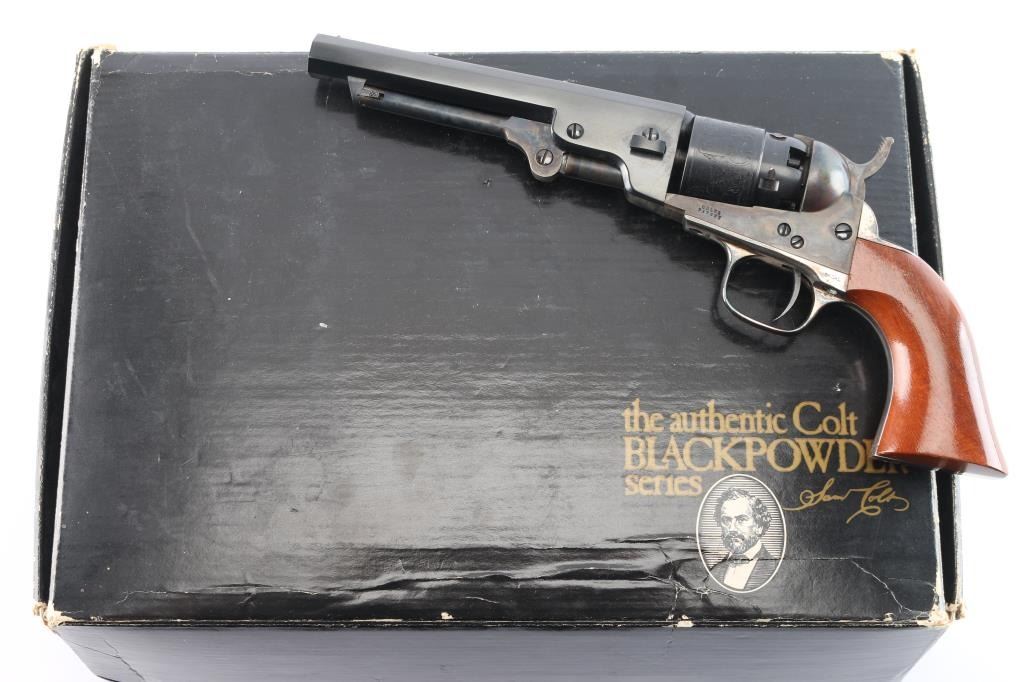 Second Generation' Finely crafted single action percussion revolver chambered for .36 caliber ammunition, manufactured circa 1979-1981. Features a blued & case hardened finish, 5.5" octagonal barrel, brass cone front sight, 'v' notch rear sight cut in the hammer lip, smooth thin trigger, knurled hammer spur, non-fluted five shot cylinder with roll stamped stage coach hold-up scene, silver wash backstrap & triggerguard, case colored frame, hammer, loading lever and one-piece varnished walnut grip. Total production was 5,765, not including special issue. Includes the original factory black cardboard with foam inserts and documents. Retains 99% original finish. Never fired. Revolver is in like new condition. Condition is NRA Excellent in box.