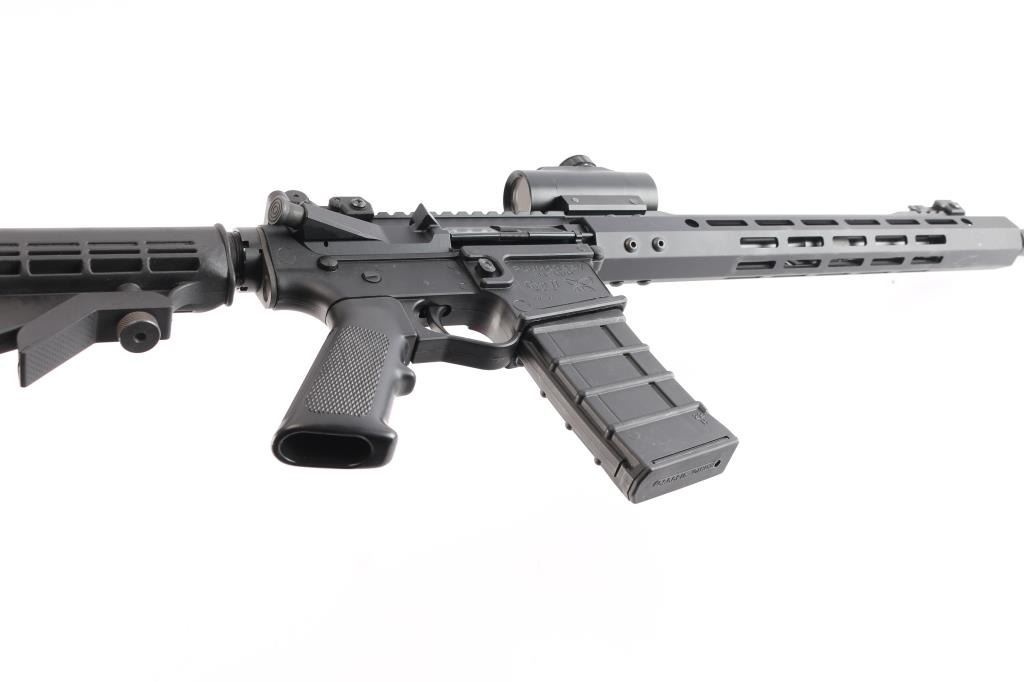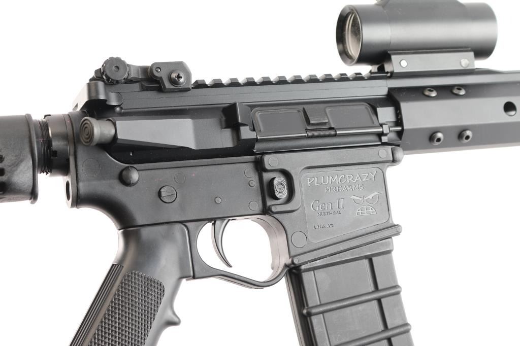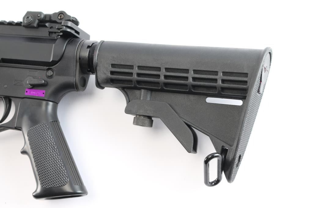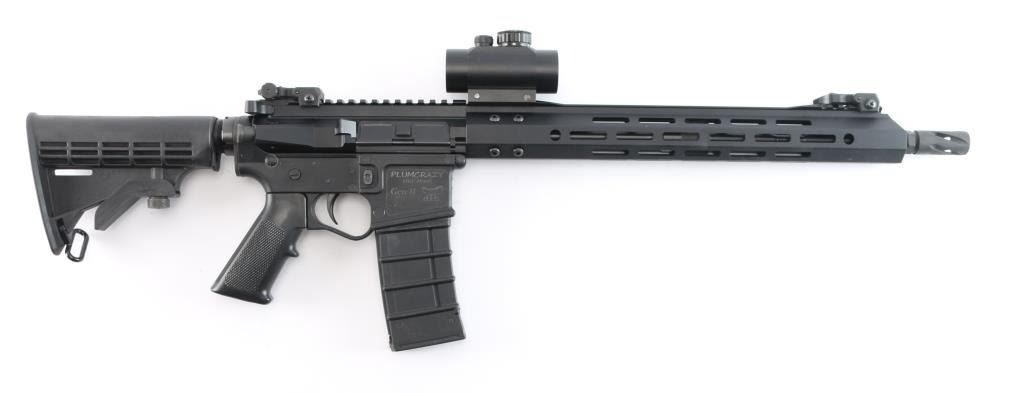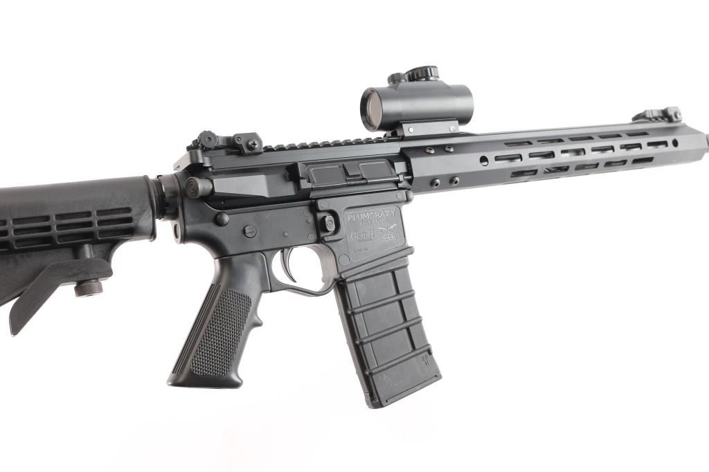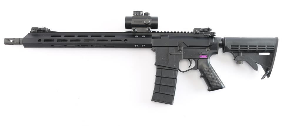 Built on a Plum Crazy Gwen II lower by Pig Pig Armory. Semi-Automatic 5.56x45mm AR-15 Rifle with a 16" Barrel and 15" M-LOK Handguard. Upper nitride M4 profile barrel 1:7 twist, ported muzzle break, carbine length gas system, BCG with MPI bolt, standard charging handle. Adjustable post and aperture flip-up sights installed on rail, matte black finish, forward assist, shell deflector, dust cover, A2 style grip, collapsible stock. Mounted with a BSA Red-Dot sight in good working order. The bore is excellent/bright, rifle is in like new condition. Comes with a polymer Thermold 30 rd magazine.