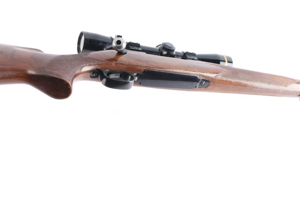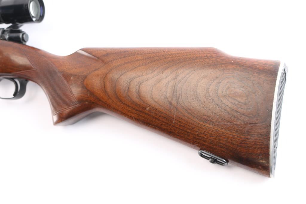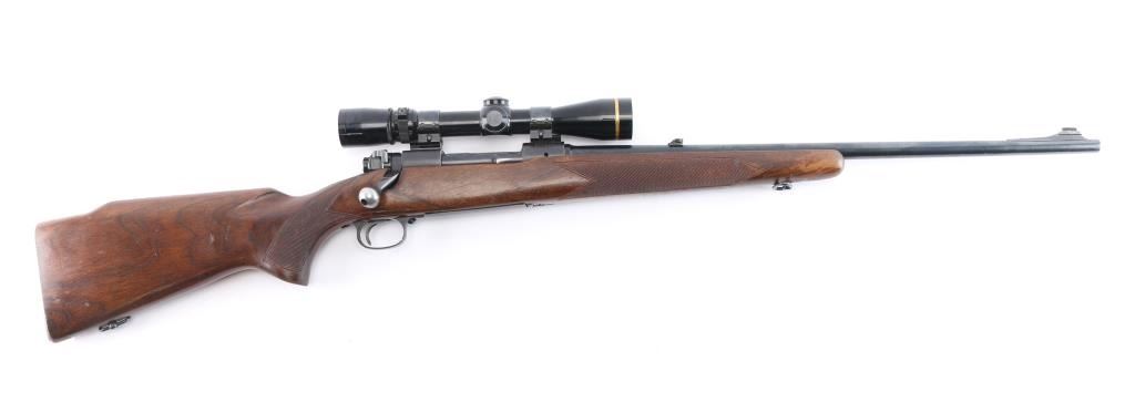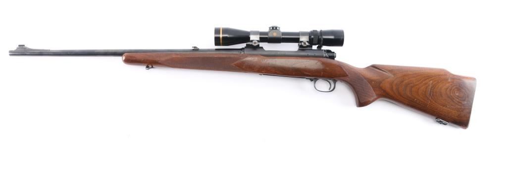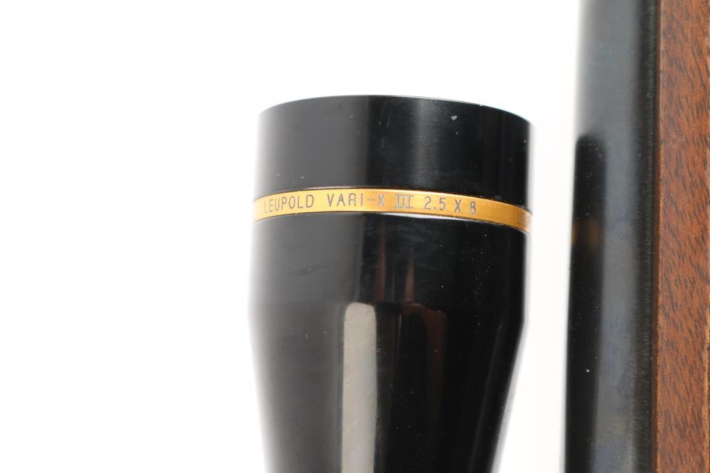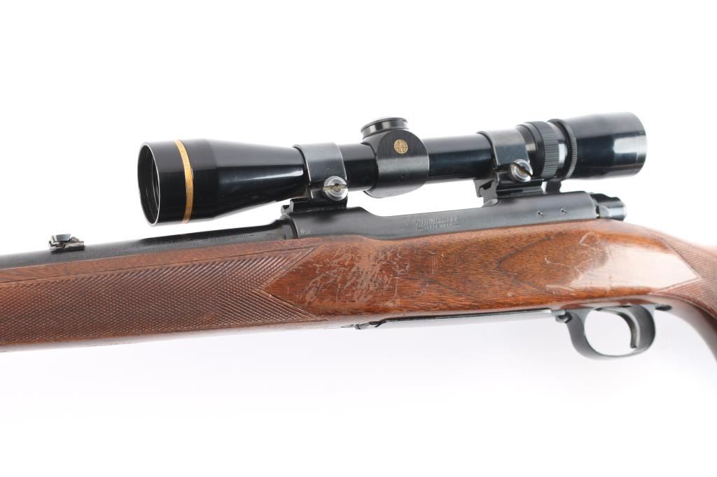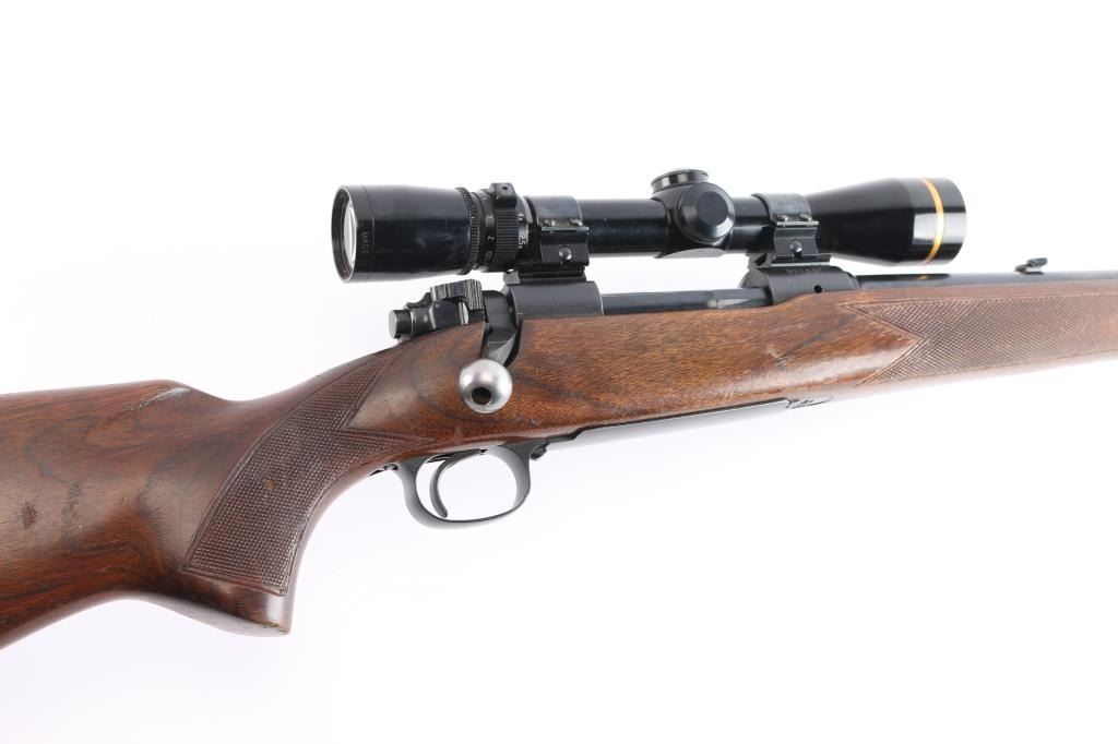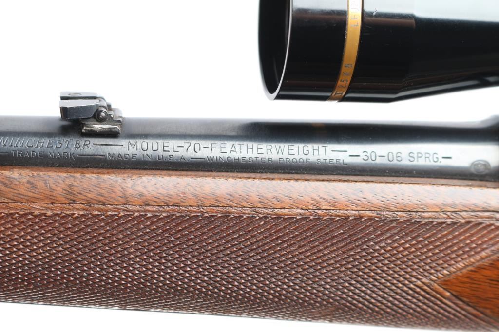 Sn: 398321. 'Featherweight' Bolt action rifle. Pre-64, manufactured circa 1957. Features blued finish, matte receiver, wood stock with semi-pistol grip, checkered metal buttplate, checkered panels at wrist & forend, 22" barrel, raised blade/brass bead front sight, adjustable folding u-notch rear sight with white diamond, three position manual safety, hinged floorplate, sling swivels, two Weaver rings mounting a Leupold Vari-X III 2.5x8 scope, duplex reticle, clear optics. Bore is excellent/bright, strong rifling. Blued barrel is very good with very slight muzzle wear, a few minor rubs, a couple of minor scratches to the floorplate, matte is excellent, handling wear to the bolt knob, action is smooth, and the stock is overall good/sound with minor scratches/dings, handling wear with finish loss to the forearm.