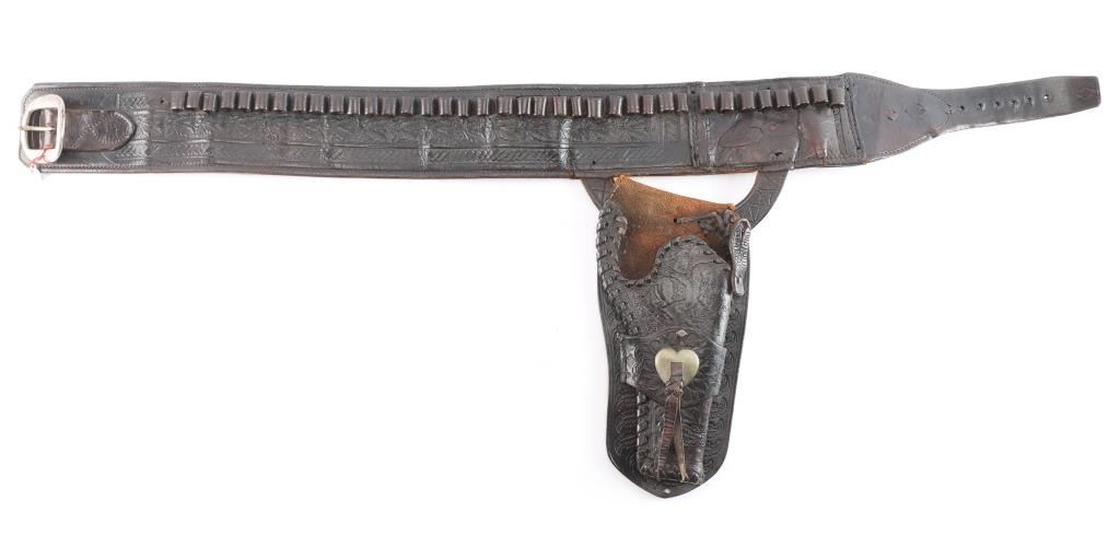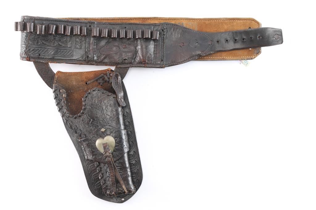 For 5 1/2" Colt single action. Shows carving of cowboy on horseback at top center with German silver "heart" shaped concho on single loop. Wide belt with large nickel oval shaped buckle. Belt is approximately 3 1/4" wide and appears to have been a money belt before being repaired, back lined and holster cut and reinforced. Fred Mueller, Denver mark on hammer loop. Good as period repaired.
