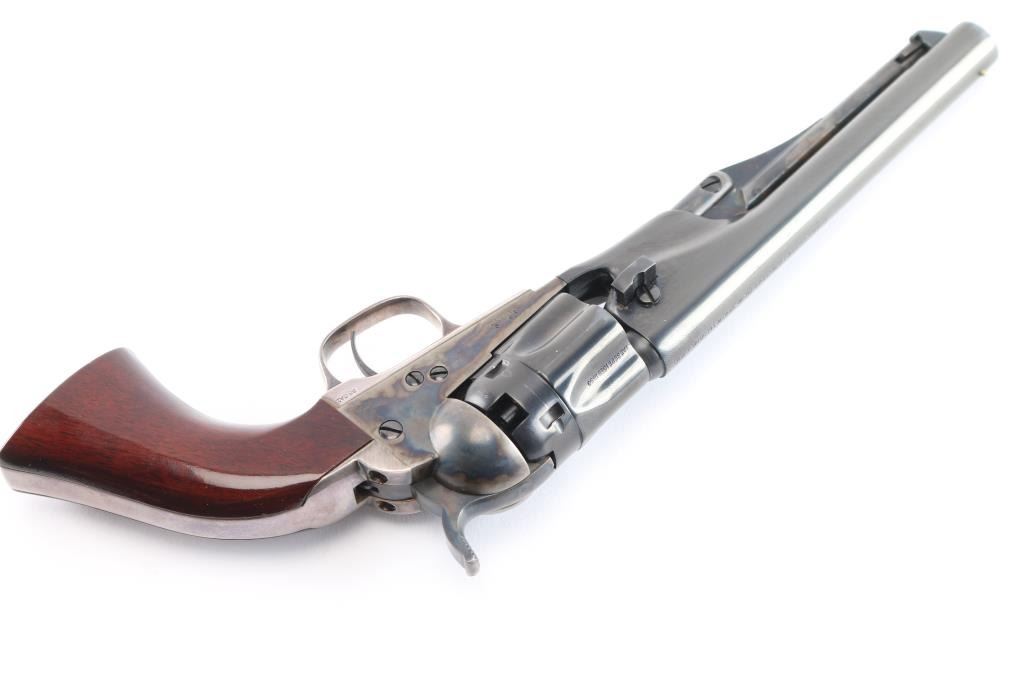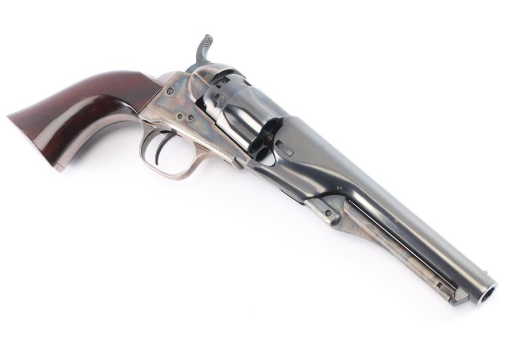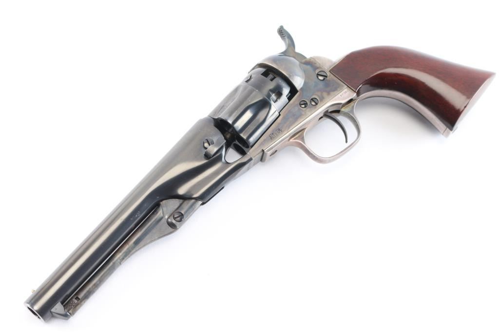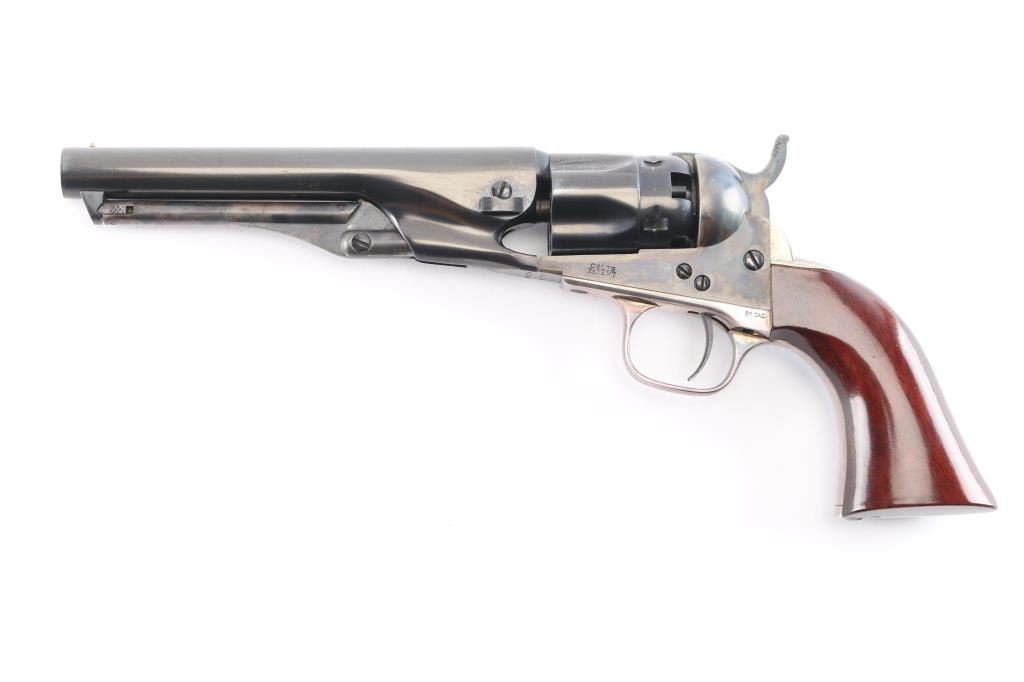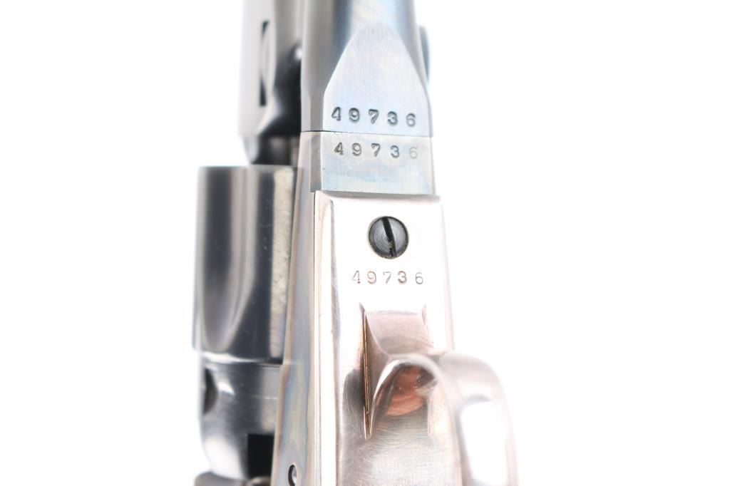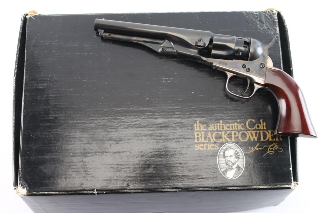 Second Generation' Finely crafted single action percussion revolver chambered for .36 caliber ammunition, manufactured circa 1980-1981. 'The Authentic Colt Blackpowder Series' Black powder percussion revolver with 5 1/2" barrel, bead front sight, rear sight is a “V” notch at the front of the hammer, visible when cocked, checkered hammer spur, three screw side plate, smooth trigger, silver-colored grip module, blue finish with case colored frame, hammer and loading lever, one-piece wood grips. Barrel is marked "Address COL Sam L Colt New York U.S. America," left side plate is marked "Colts Patent" and left flat of trigger guard is marked "36 cal". Revolver is in like new condition. Total production was 4,801, not including special issues. Never been fired. Includes the original box with matching label, form fitted foam lining, instruction manual/paperwork.