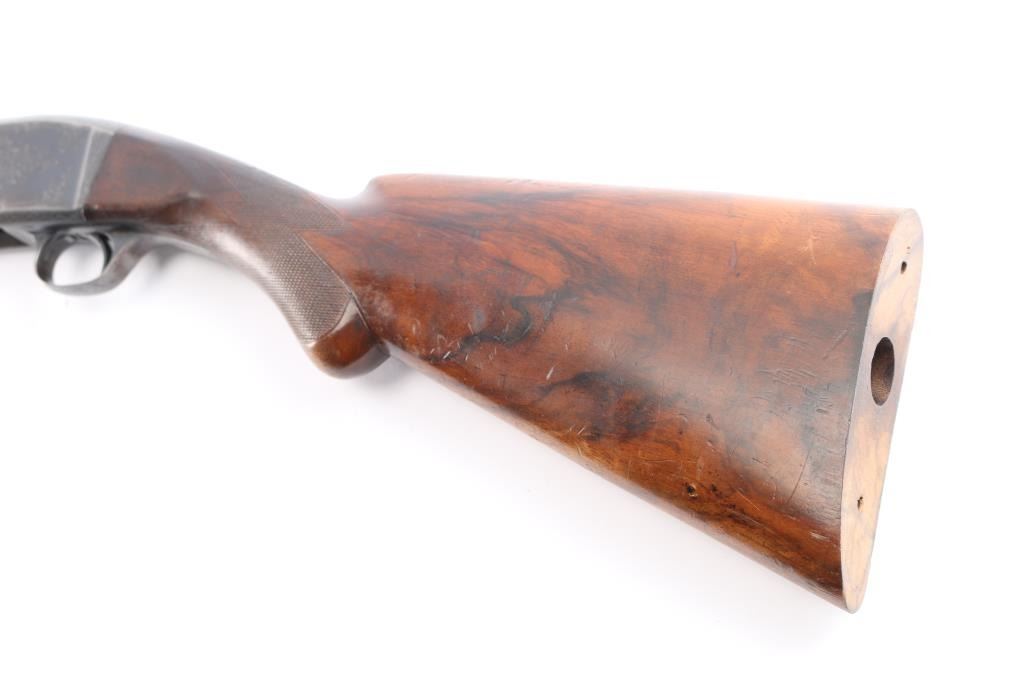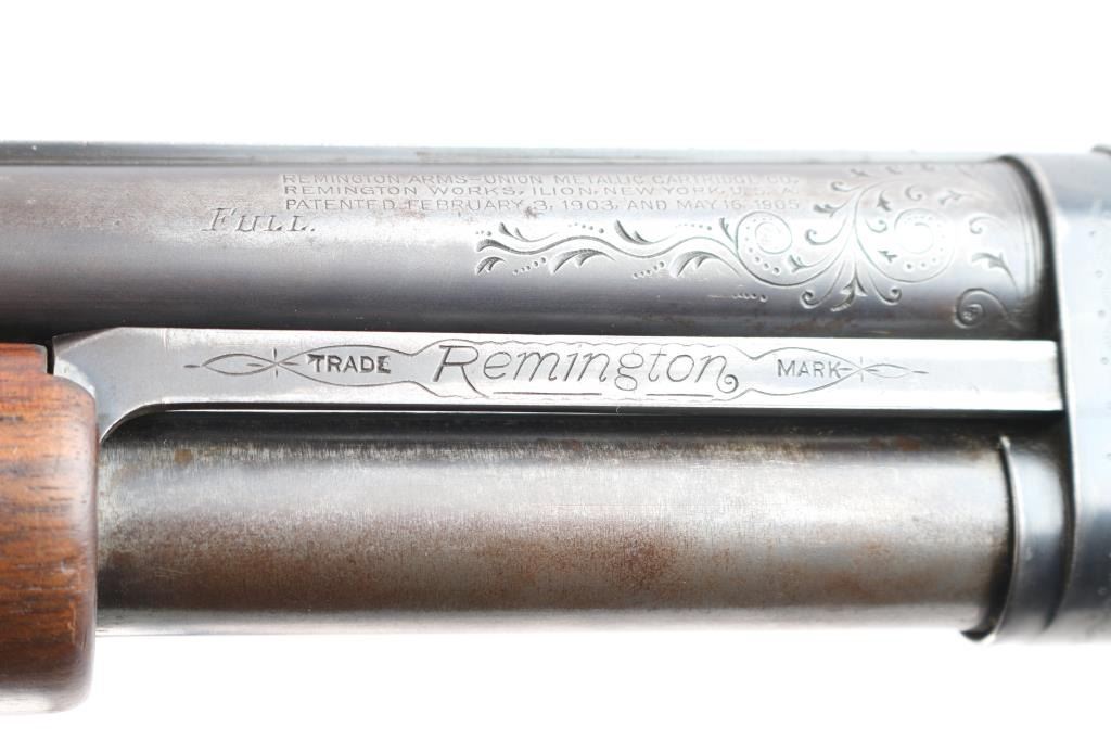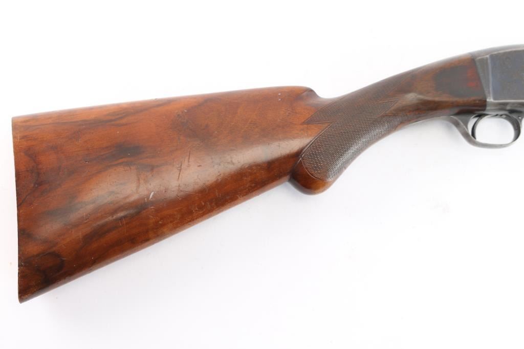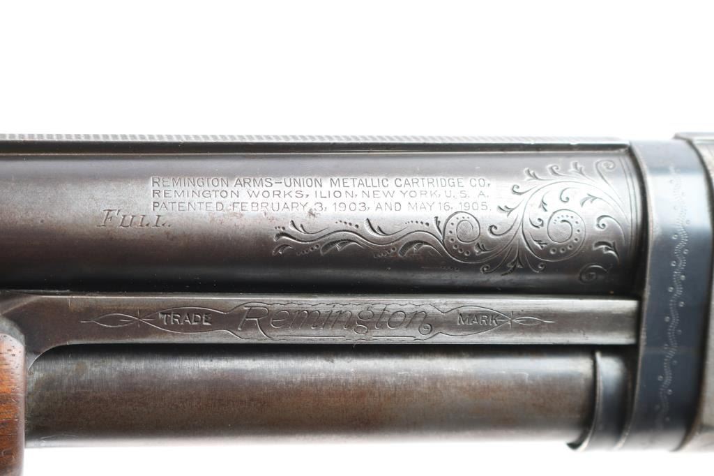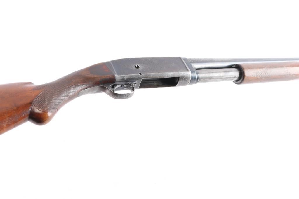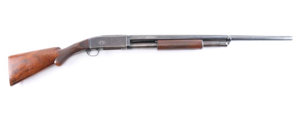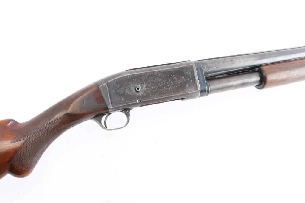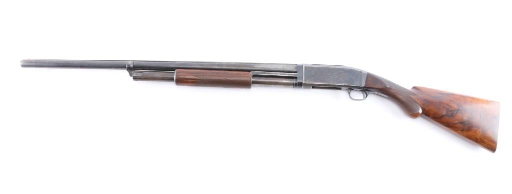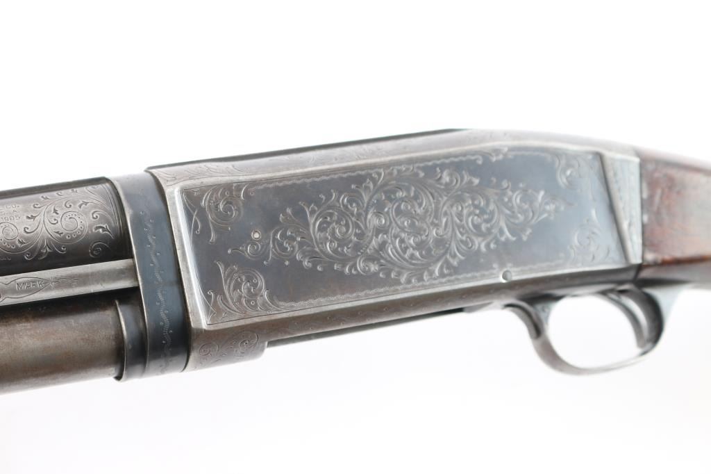 American made, and factory engraved, deluxe vintage slide-action shotgun chambered for 2-3/4" 12 Gauge shells, and manufactured in Ilion, NY. Shotgun features a blued finish, a 28" ribbed barrel, bore measures 'Full' with a drop-in gauge, steel bead front sight, smooth curved trigger, serrated trigger guard mounted manual safety, and right receiver mounted slide release. The select hardwood burl furniture consists of a round knob shoulder stock, checkered slide handle, and no recoil pad or butt plate. The receiver, barrel, and trigger guard are hand engraved with nearly full coverage of floral scrolls and edge designs. The original blued finish retained is approximately 50% with general thinning, edge wear, handling blemishes, and the original bluing turning to patina. The metal displays no observed rust, but there is slight deformation in some of the screw slots. The engravings and markings are sharp. The wood furniture is in good condition showing wear to the checkering, some blemishes, and scratches. The action is smooth and crisp, and the bore is bright and shiny. This is an excellent candidate for restoration with pleasing engraving.