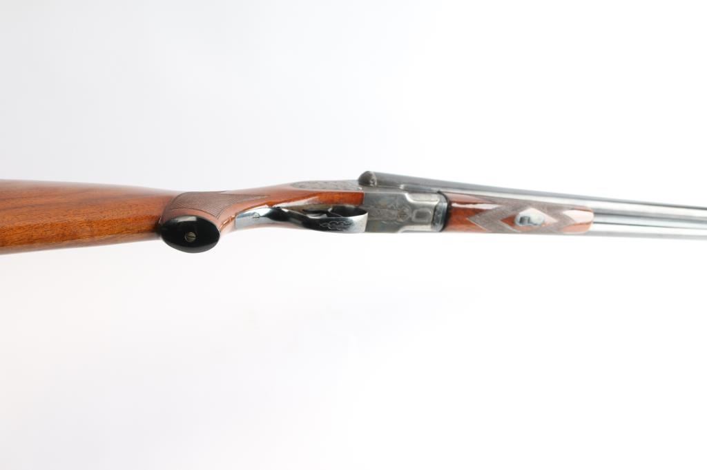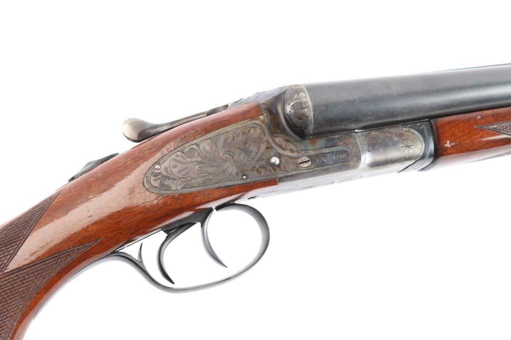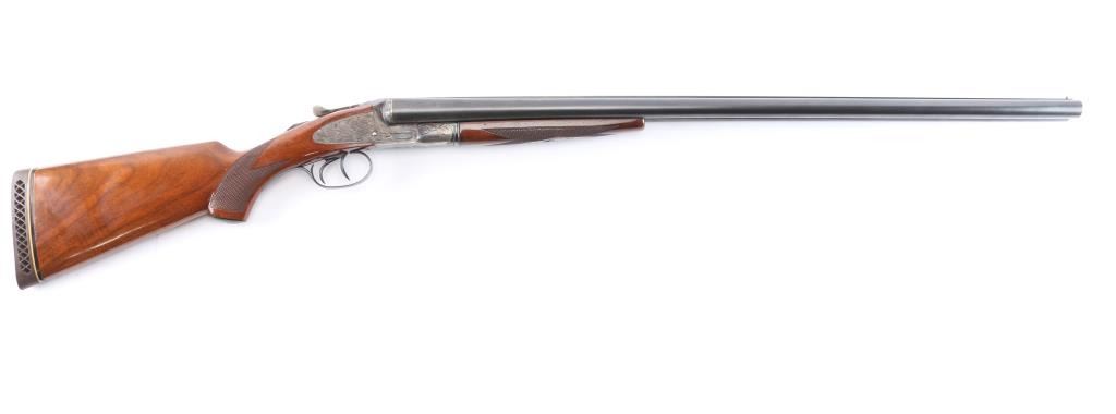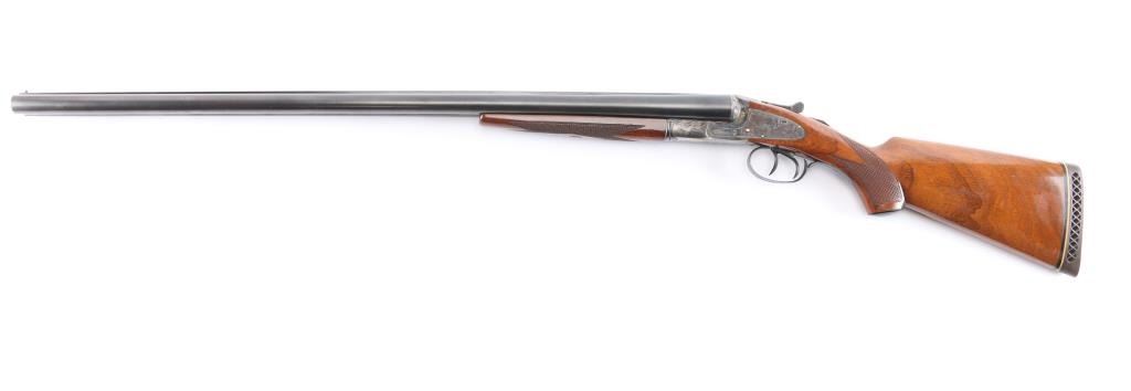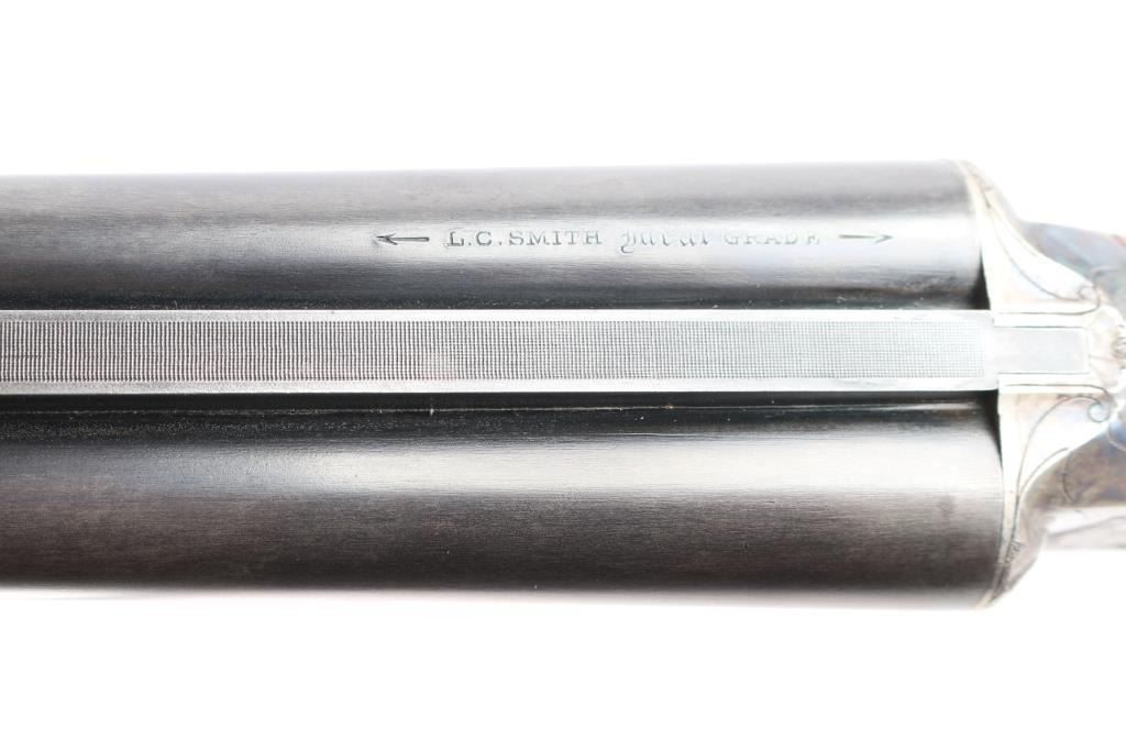 'Ideal Grade' vintage side-by side double barrel sidelock shotgun chambered for 2 3/4" 12 Gauge shells, manufactured between 1912 and 1950. Featuring blued approximately 30" London steel barrels, raised solid rib, extractor, brass bead front sight, double triggers, left bore measures 'IC' and the right measures 'CYL' (drop-in gauge), 14" length-of-pull to front trigger, serrated sliding tang safety, checkered and engraved top lever. The furniture consists of a checkered semi-pistol grip shoulder stock, checkered walnut splinter forend, black grip cap, and brown ventilated Pachmayr rubber recoil pad. The receiver, trigger guard, and top lever have limited coverage of oak leaf engravings. Locks are marked "L.C. Smith," and the right barrel is marked "L.C. Smith Ideal Grade". Matching serial numbers on the receiver, barrels, and forend metal. Retained original blueing is approximately 70% with very light edge wear, general thinning along the barrels, and heavier losses on the trigger guard. The receiver, triggers, locks, and lever are all color-case hardened and still exhibit brilliant colors . Action is smooth and crisp, and the bores are bright. Markings are crisp, with exception of the nitro proof. Furniture wood condition is very good for its age with superficial scratches/dings, some finish loss and a 1/4" hairline crack extending from the left lock. The forend clasp does not properly engage leaving it loose on the shotgun.