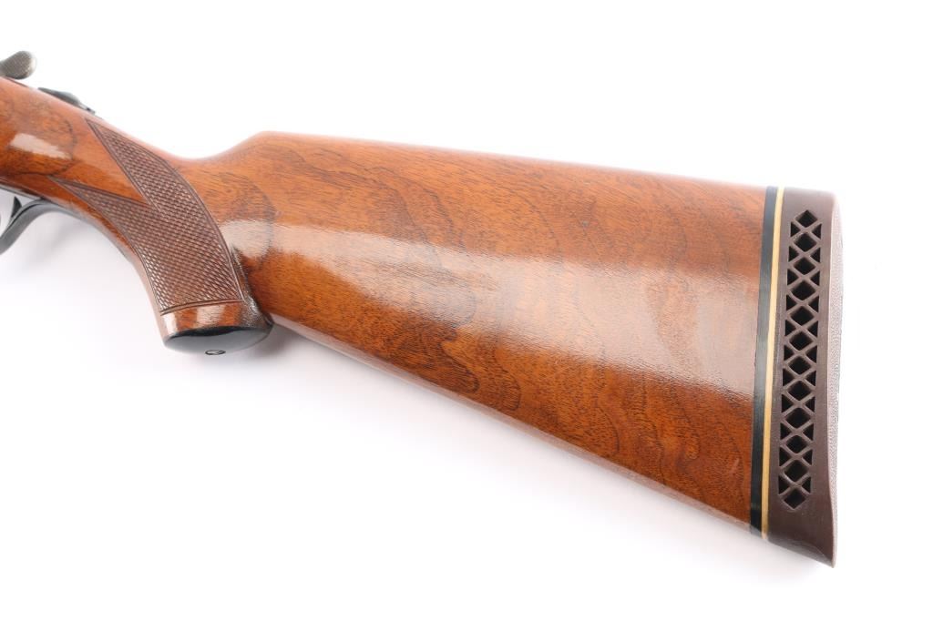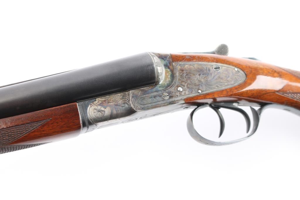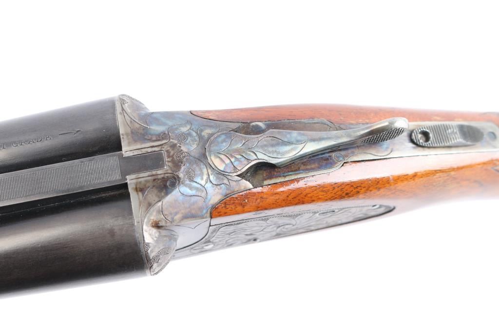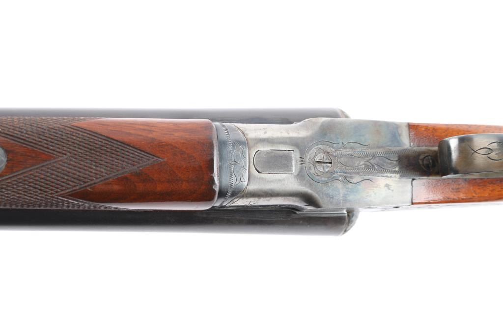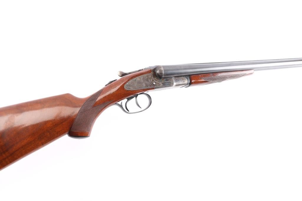 'Ideal Grade' vintage side-by side double barrel sidelock shotgun chambered for 2 3/4" 12 Gauge shells, manufactured between 1912 and 1950. Featuring blued approximately 30" London steel barrels, raised solid rib, extractor, brass bead front sight, double triggers, left bore measures 'IC' and the right measures 'CYL' (drop-in gauge), 14" length-of-pull to front trigger, serrated sliding tang safety, checkered and engraved top lever. The furniture consists of a checkered semi-pistol grip shoulder stock, checkered walnut splinter forend, black grip cap, and brown ventilated Pachmayr rubber recoil pad. The receiver, trigger guard, and top lever have limited coverage of oak leaf engravings. Locks are marked "L.C. Smith," and the right barrel is marked "L.C. Smith Ideal Grade". Matching serial numbers on the receiver, barrels, and forend metal. Retained original blueing is approximately 70% with very light edge wear, general thinning along the barrels, and heavier losses on the trigger guard. The receiver, triggers, locks, and lever are all color-case hardened and still exhibit brilliant colors . Action is smooth and crisp, and the bores are bright. Markings are crisp, with exception of the nitro proof. Furniture wood condition is very good for its age with superficial scratches/dings, some finish loss and a 1/4" hairline crack extending from the left lock. The forend clasp does not properly engage leaving it loose on the shotgun.