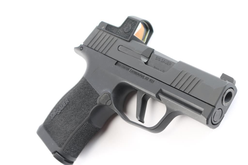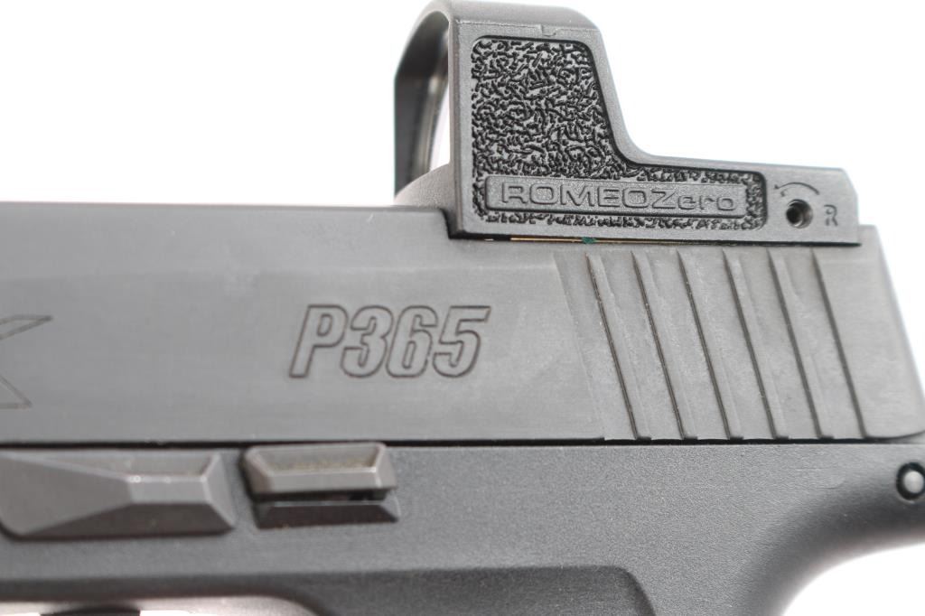 American made semi-automatic pistol, Micro-Compact, striker fired, black polymer frame with Nitron finished slide, approximately 3" black barrel, bore is bright, green dot blade front sight, SIG RomeoZero red dot. SIG Rail accessory rail, flat face trigger, textured grips, double stack factory 12-round magazine. 100% finish. Includes a Sig Sauer plastic case with instruction manual and extra 12-round magazine. NRA Condition - Excellent.