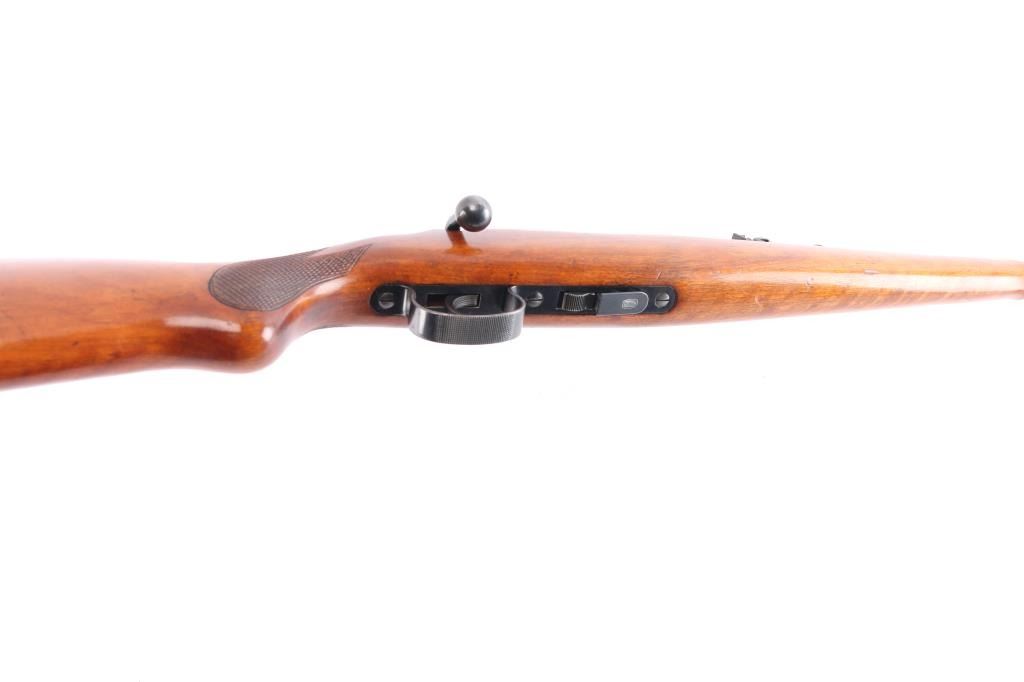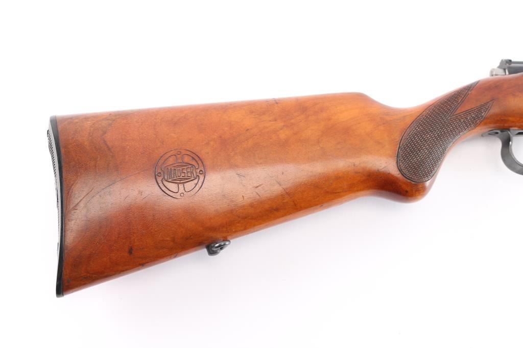 Rare High Quality Pre-war German Sporting rifle. Manufactured c. 1934-35. The rifle uses a detachable spring loaded box magazine and has an interchangeable beaded blade front sight and tangent rear sight graduated to 200 meters mounted on the barrel. There are claw mount scope bases on the receiver. The trigger is serrated and the bottom of the trigger guard is knurled. The Schnabel tipped walnut stock is checkered at the rounded "Prince of Wales" grip and has the Mauser logo on the right side of the buttstock as well as the hard rubber buttplate. Narrow European sling swivels. Crown over "U", "B" and "G" commercial proofs. Matching serial numbers on the barrel, receiver and bolt. The rifle comes with one nicely blued magazine stamped with the Mauser banner on the bottom. The markings are crisp and highlighted in white. The bore is excellent/bright, action is smooth, wood is overall excellent with a few minor scratches/dings and the original blue finish is about 94% with edge wear on the triggerguard, light handling wear on the bolt knob and a very light patch of patina on the mid left barrel.