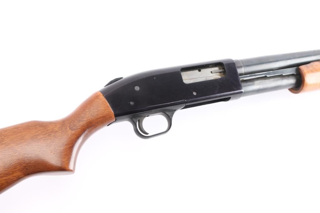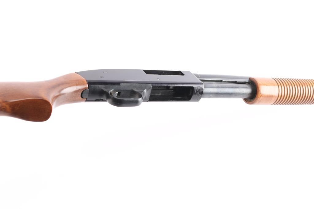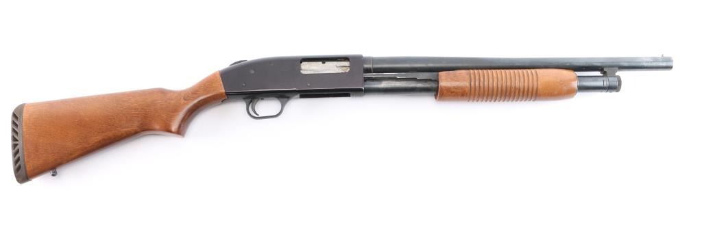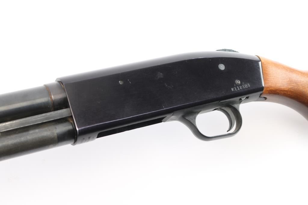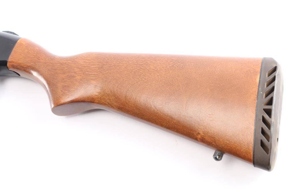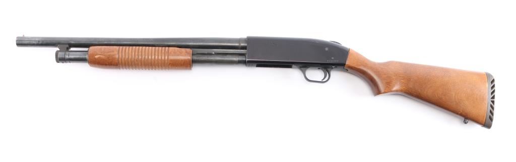 Slide action home defense style shotgun chambered for 2 3/4" or 3" 12 gauge shells. Features a blued finish, black anodized receiver, 19" cylinder bore barrel, brass bead front sight, 3/4 length tube magazine, duel action bars sliding tang safety, smooth trigger, sling stud in buttstock, grooved wood slide handle and smooth pistol grip stock with recoil pad. Shotgun exhibits approximately 85% of it's original finish showing few scattered handling marks and slide wear on the magazine tube & slide arms, some scattered light patina on the lower barrel. Action is smooth, bore is excellent/bright and the wood stocks are overall very good/sound with some minor scratches/dings.