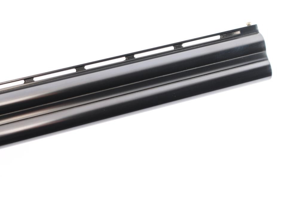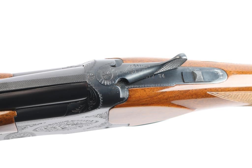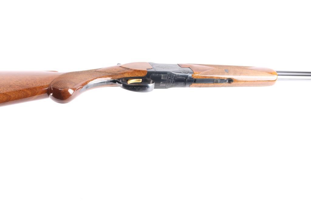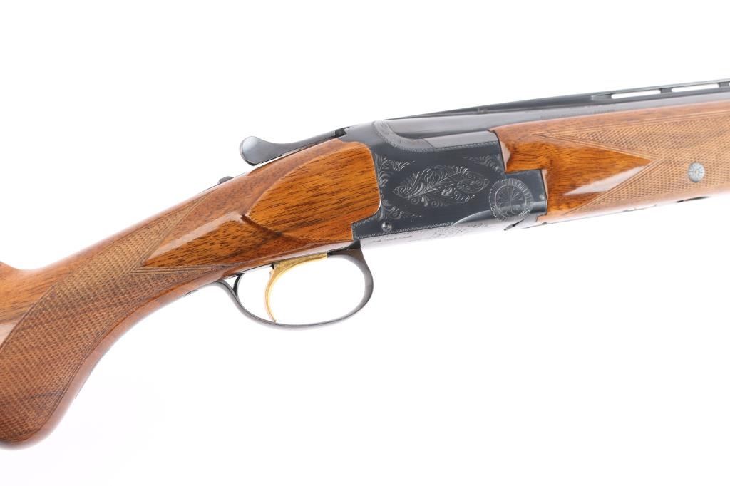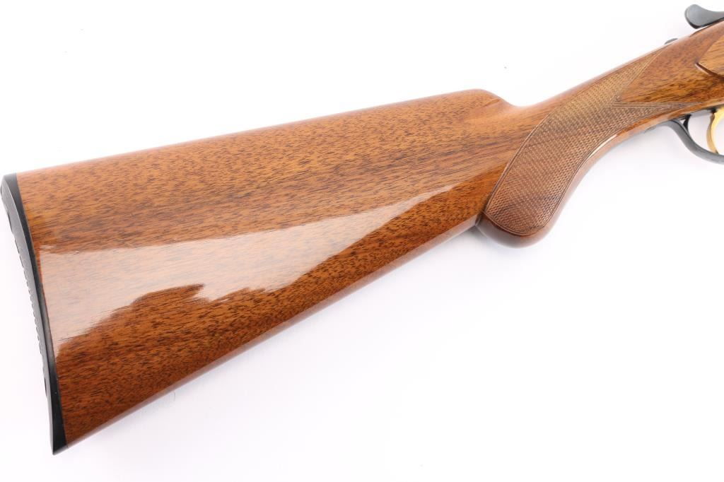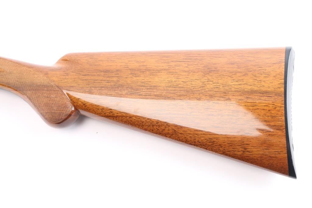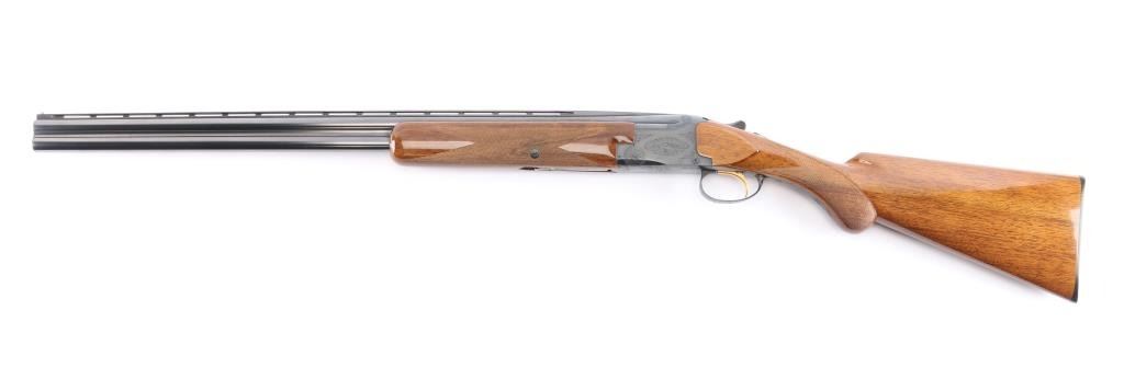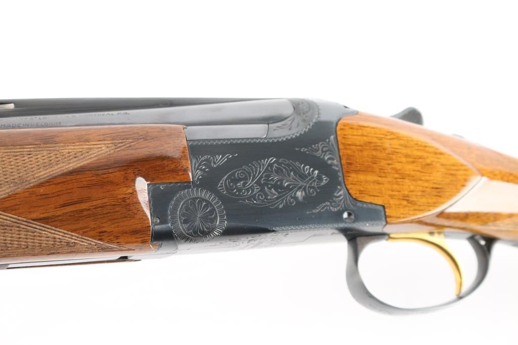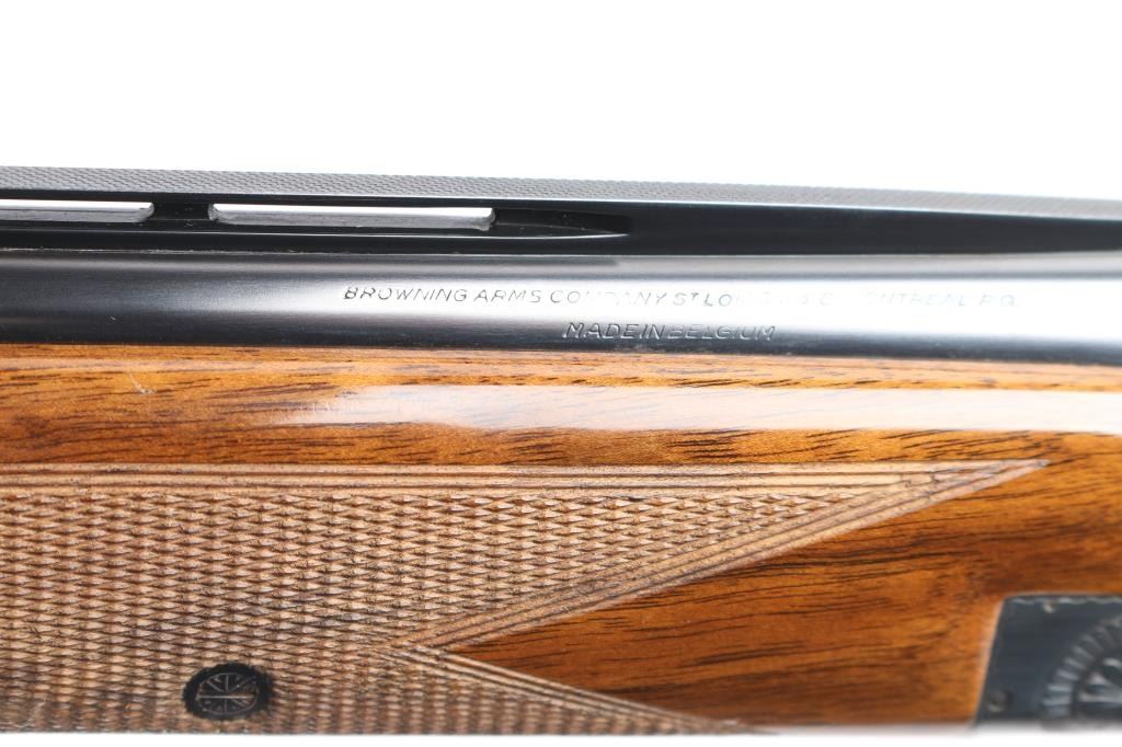 Belgium made over and under box-lock shotgun chambered for 3" 20 Gauge shells, manufactured circa 1964, and imported by Browning Arms Company out of St. Louis, MO., and Montreal P.Q. Featuring blued finish, 26 1/2" vent ribbed barrels, fixed chokes marked for Full / Mod and measures Imp Mod / Imp Cyl with a drop-in gauge, ejectors, brass bead front sight, gold-toned single smooth curved inertia trigger, tang mounted serrated sliding barrel selector and safety, and a checkered top lever. The receiver, top lever, and trigger guard display limited coverage floral and scroll engravings with edge designs. High gloss finished straight grain walnut furniture consists of a round knob grip shoulder stock with checkering at the wrist, long lower tang, sliding checkered forend with deeley latch release, 14" length-of-pull, 1-7/16" drop at comb, 2-1/4" drop at heel, and a Browning black plastic buttplate. The original blued finish retained is approximately 98% with only superficial scratches. Metal displays a small amount of light surface rust at the muzzle. Furniture wood looks excellent with light scattered dings, mostly on the forend. Bores are excellent and bright with a little dirt. The action is tight with the top lever standing right of center. This shotgun would be 'Excellent' without the observed rust.