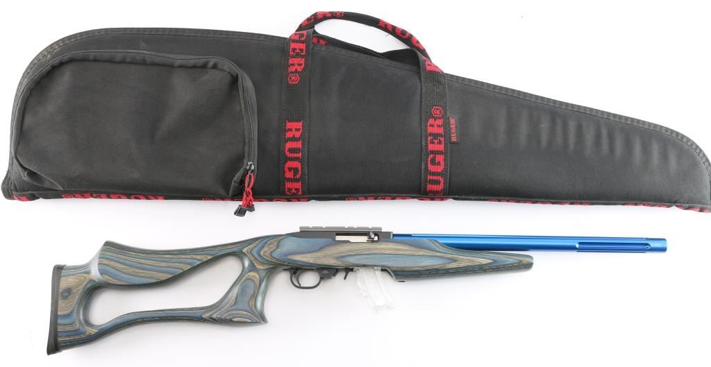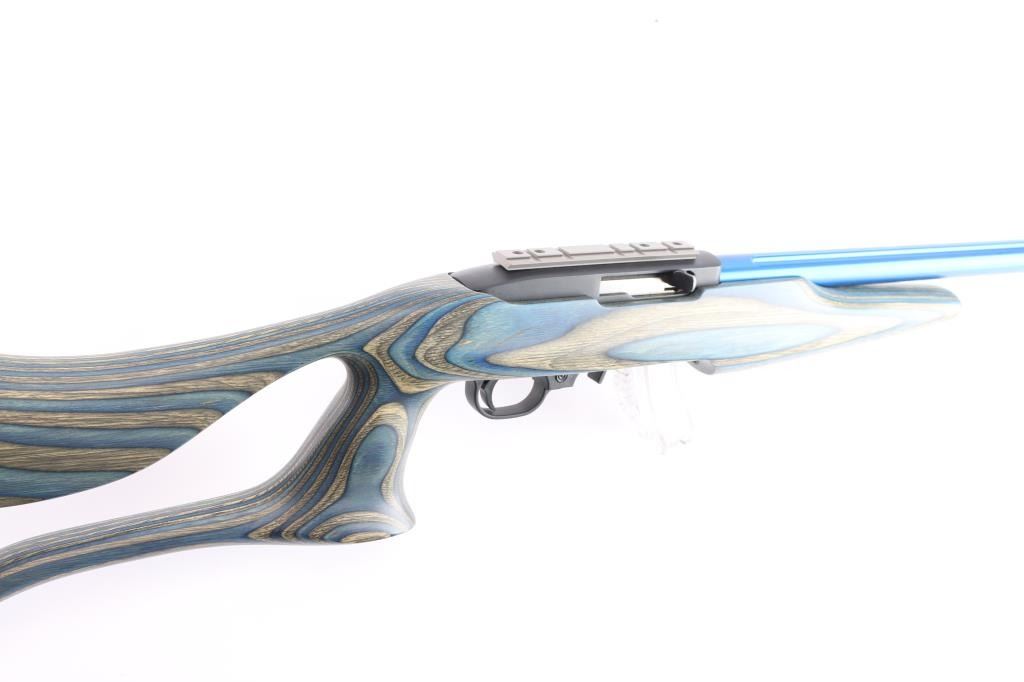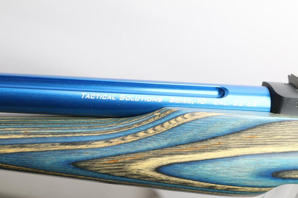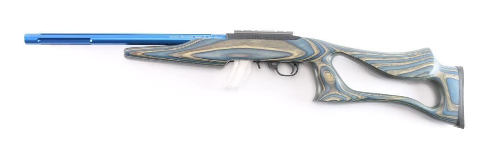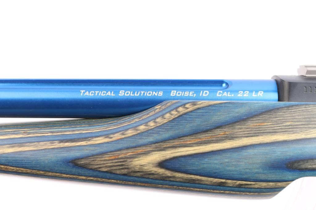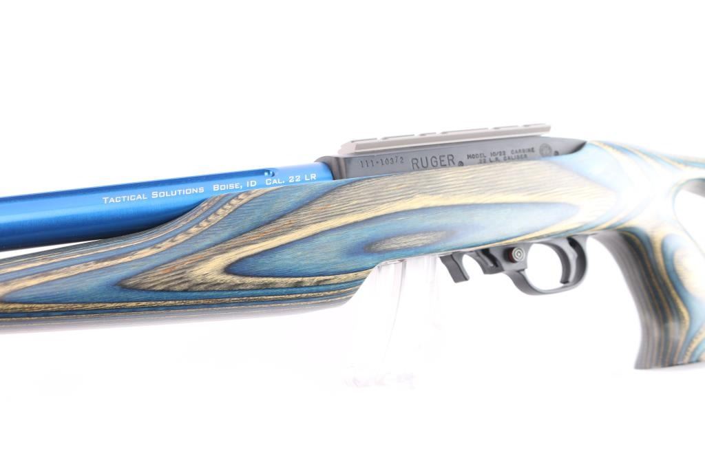 Rimfire carbine built on a expired patent Ruger 10/22 action.The Tactical Solutions X-RING VR .22LR semi-automatic. Optics ready. 16.5" Threaded, fluted, free float, chrome steel bore, target crown, 6061-T6 aluminum barrel finished in Royal vantage Blue, Vantage Royal Laminate thumbhole stock in Blue/Gray, Boyd's thin recoil pad. Optics rail installed on receiver. Comes with one Butler Creek steel lip 10-rd magazine. The bore is pristine, rifle is in like new condition. Comes with Ruger Soft carrying case.