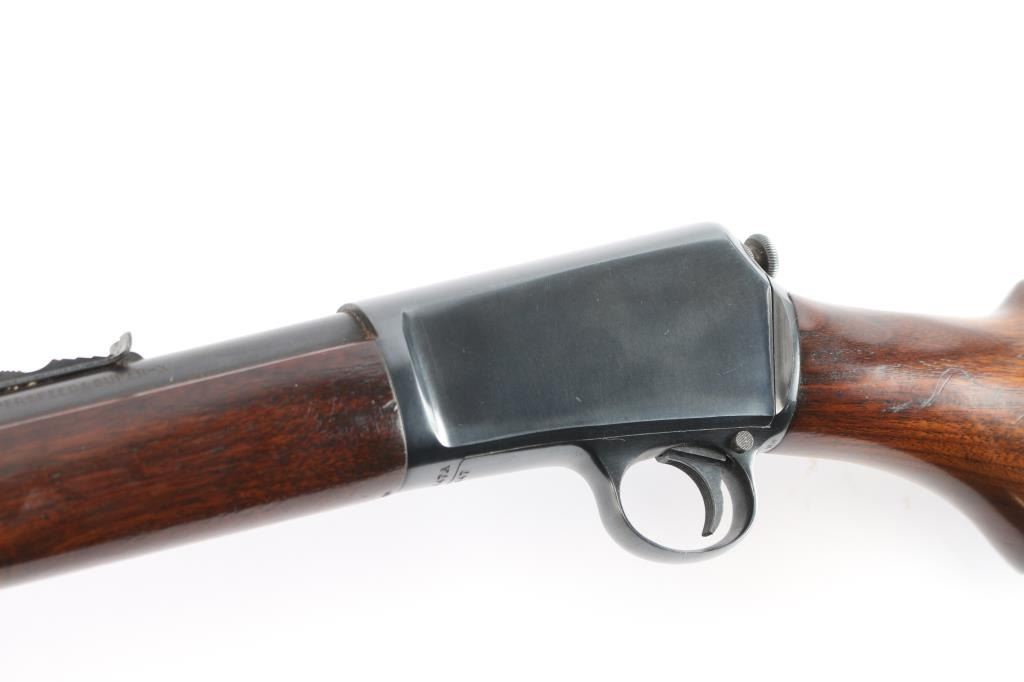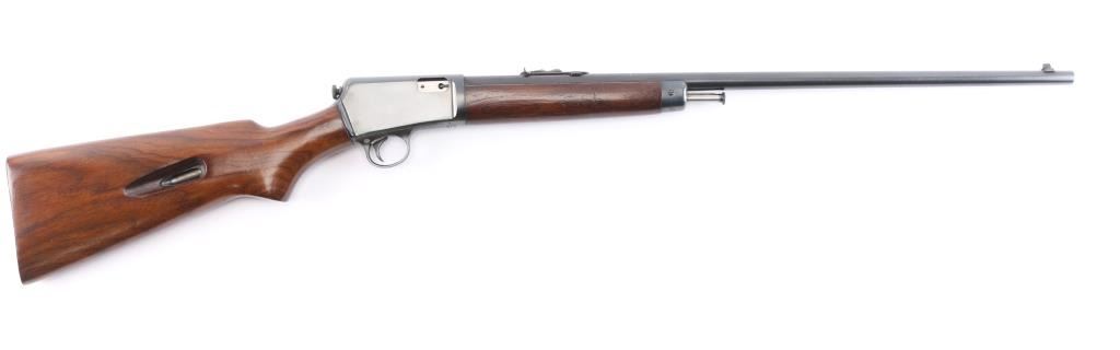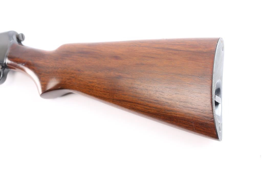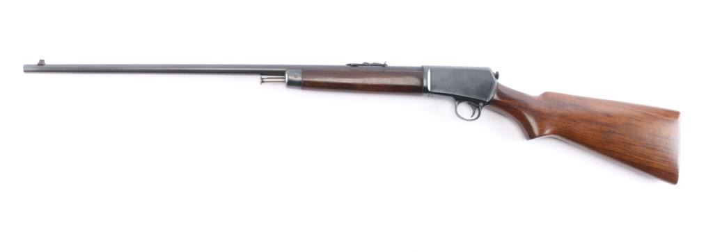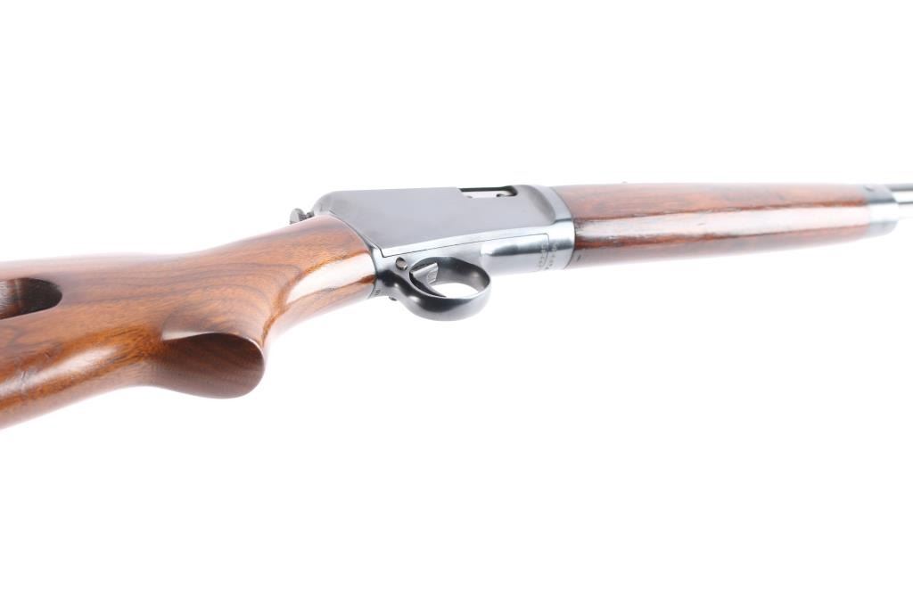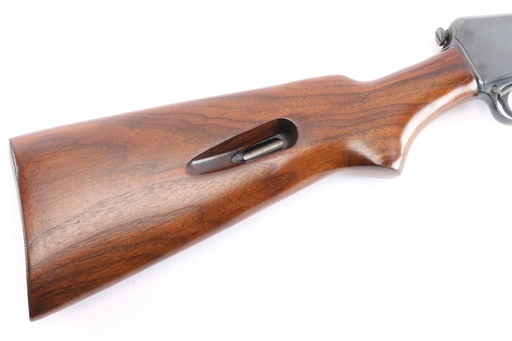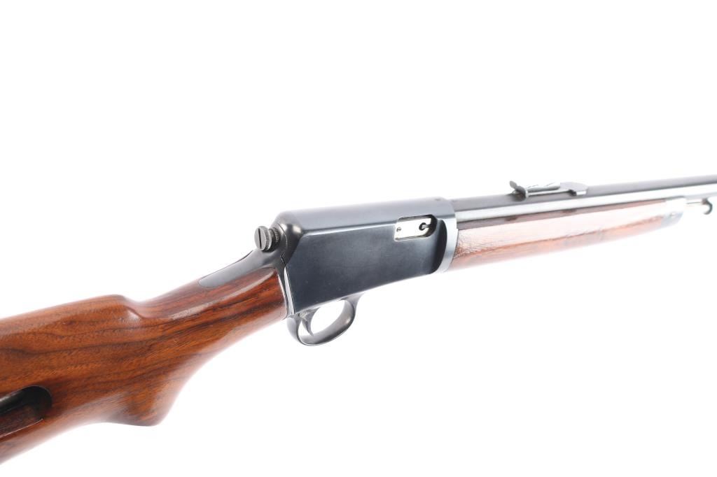 American made vintage semiautomatic rimfire rifle chambered in .22 Long Rifle, manufactured circa 1950 in New Haven, CT. Featuring a blued finish, 23" round barrel, dovetailed blade/bead front sight, adjustable sporting rear sight, magazine tube in butt, checkered push button safety, smooth curved trigger, and knurled takedown screw at receiver rear. The furniture is possibly refinished and consists of a smooth walnut semi-pistol grip buttstock, smooth forend with blued steel nose cap and charging rod, and checkered steel buttplate. Bore is bright with strong rifling. The original blued finish retained is approximately 97% with superficial scratches and light edge wear. Markings are sharp and clear. Furniture wood is very good with scattered minor scratches and blemishes. Serial numbers on receiver & trigger guard match. Action is smooth and crisp. Metal condition shows small spots of rust on the buttplate, and metal deformation in the screw slots for the forend end-cap. This rifle would be 'Very Good' to 'Excellent' if it was not for the observed rust.
