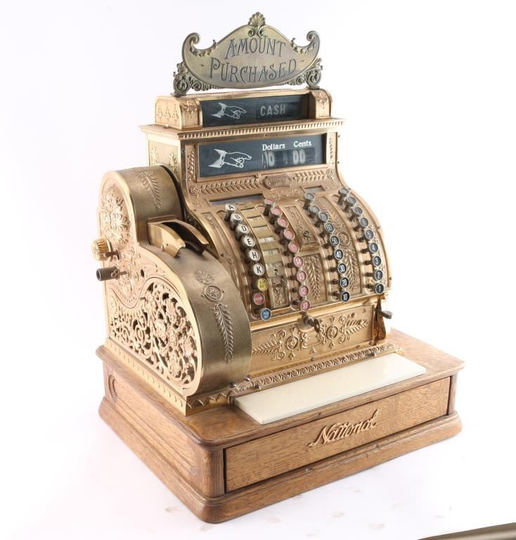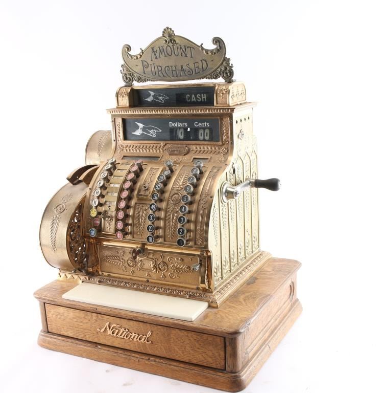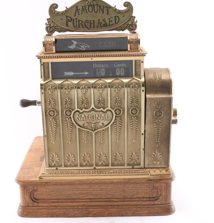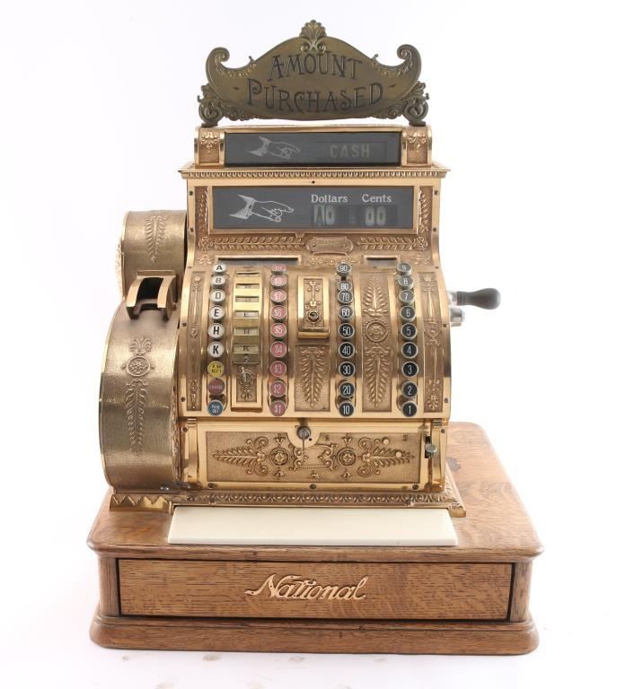 Brass construction with oak base. Appears to be in overall very good condition. Serial number 1517473442.