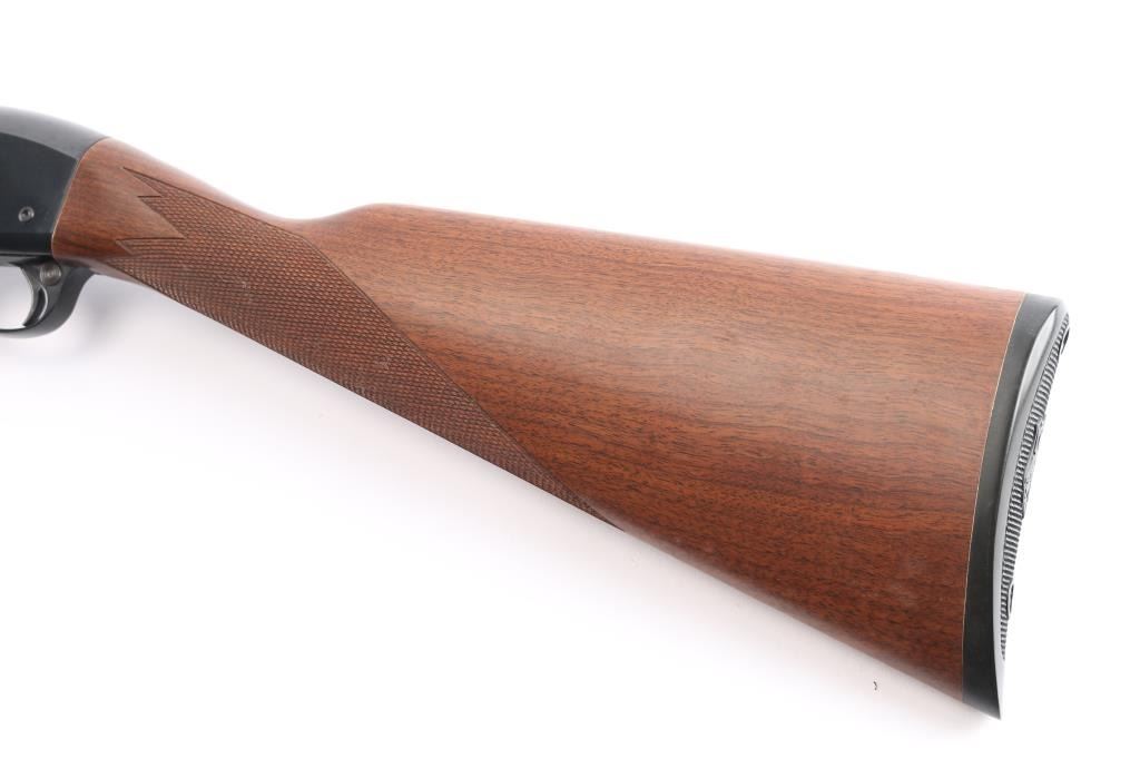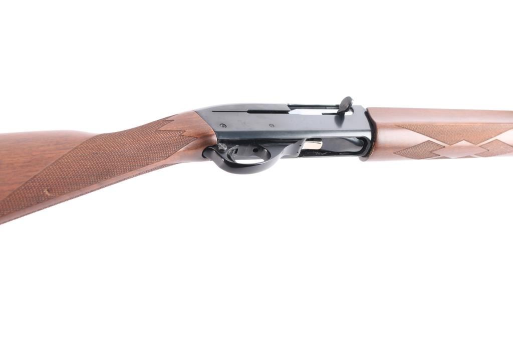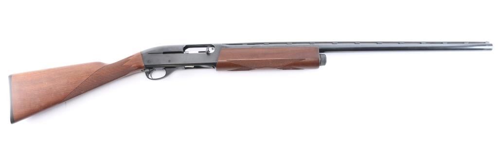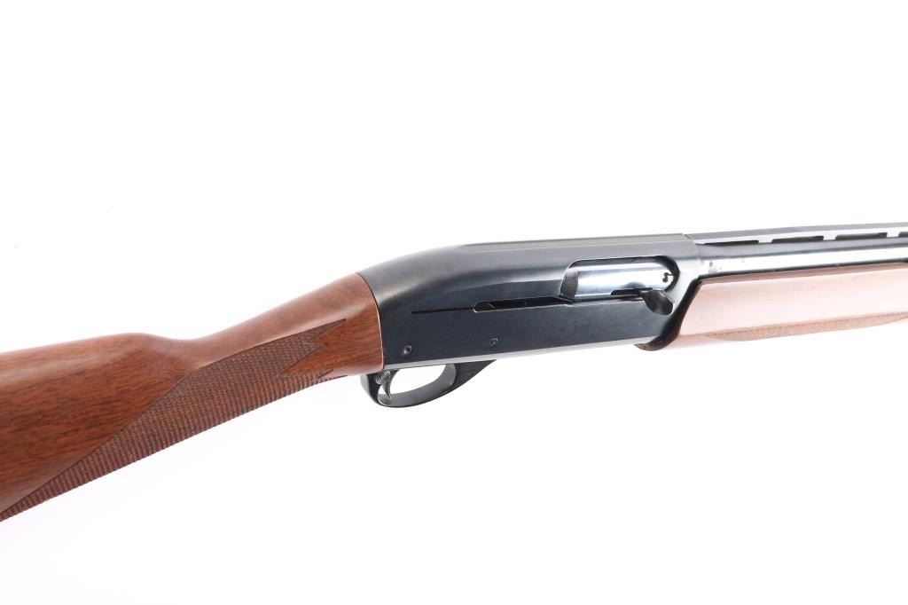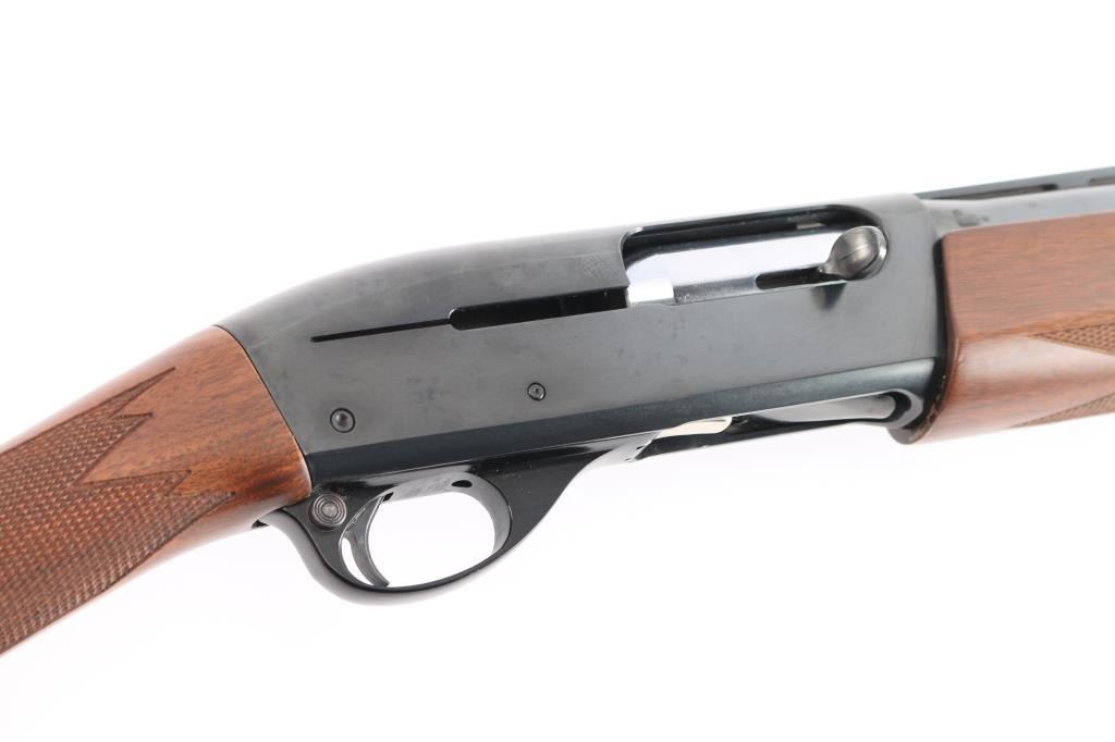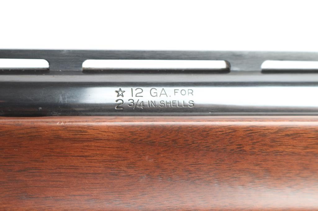 American made semi-auto shotgun chambered for 2 3/4" 12 gauge shells, manufactured circa 1985 in Ilion, NY. The serial prefix suggests that the shotgun was manufactured between 1985 and 1989, but the barrel code is 'XE' showing a date of 1984. It features a blued approximately 27 3/4" vent rib barrel, steel bead front sight, push button cross-bolt safety, a 14" length-of-pull, modified choke, and smooth curved trigger. The hardwood furniture consists of a English style straight grip shoulder stock with checkering at the wrist, checkered forend, and factory checkered black plastic buttplate. Bore is bright and shiny, and the action is smooth and crisp. The original blued finish retained is approximately 97% with some blemishes in front of the magazine tube on the barrel, and superficial scratches. Furniture wood is near excellent with a few very minor blemishes. The metal shows a small amount of light rust on the barrel rib towards the muzzle. This shotgun would be 'Excellent' without the observed rust.
