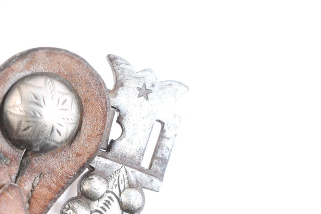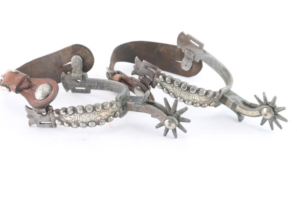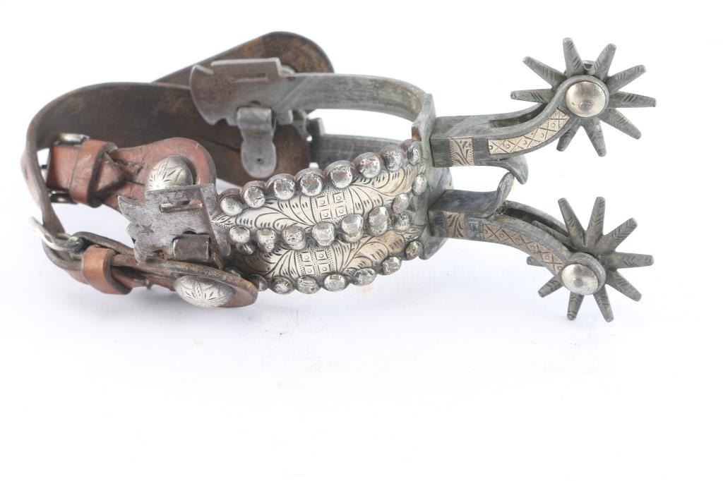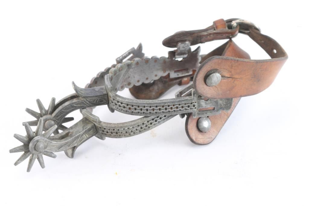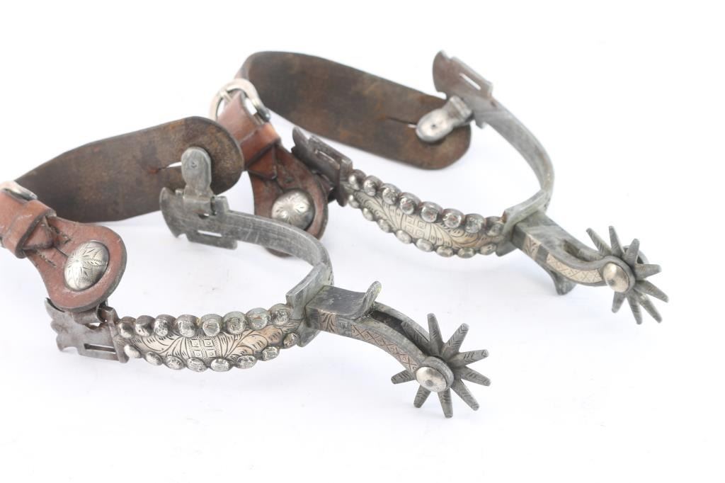Maker marked with star. Hand-forged steel with spotted and engraved straps. Includes leather spur straps. August Buerman made spurs from the late 19th Century until 1926, renowned for his custom star designs.